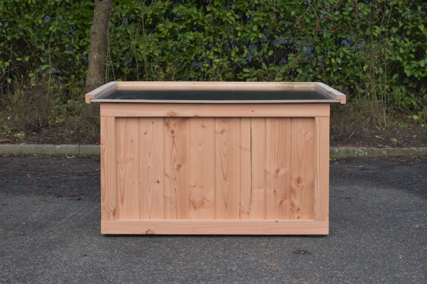 - Wir empfehlen das Holz zu behandeln mit Douglasien-Öl um zu verhindern dass das Holz grau wird