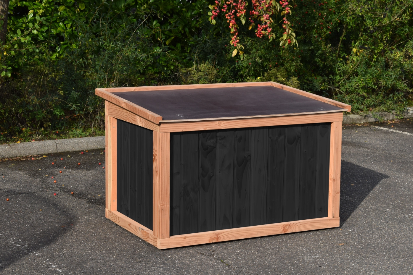 - Die Hundehütte hat schwarze Kunststofffüße, die das Bewegen erleichtern und die Hütte vor Feuchtigkeit schützen