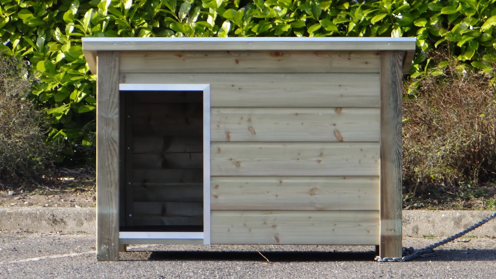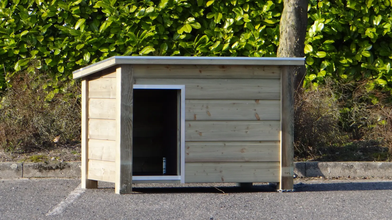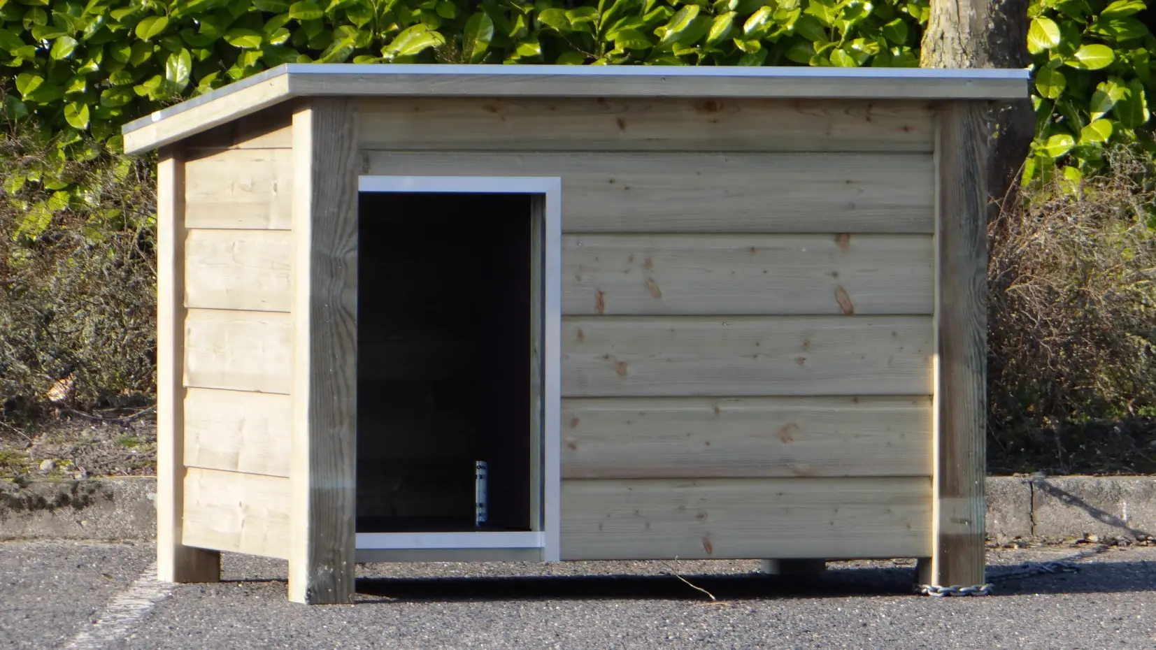 Ein imprägnierte Hundehütte: Qualität, Haltbarkeit und Benutzerfreundlichkeit in 1. Das Flachdach kann für eine optimale Zugänglichkeit geöffnet werden.