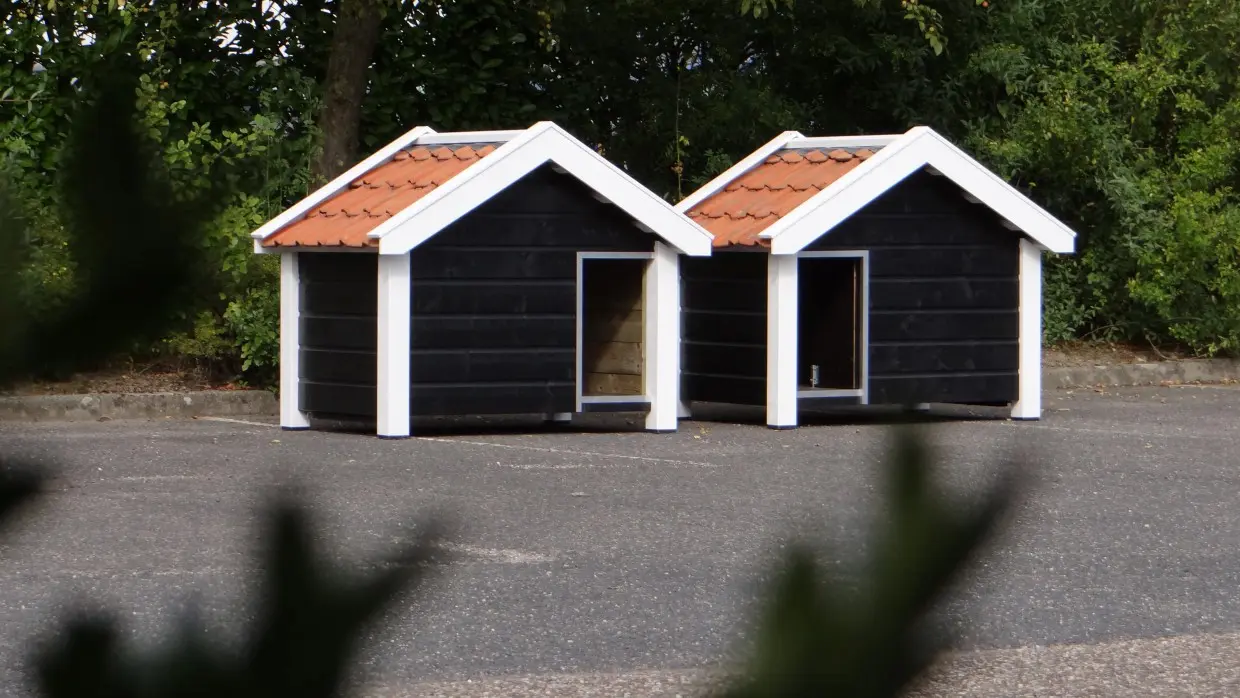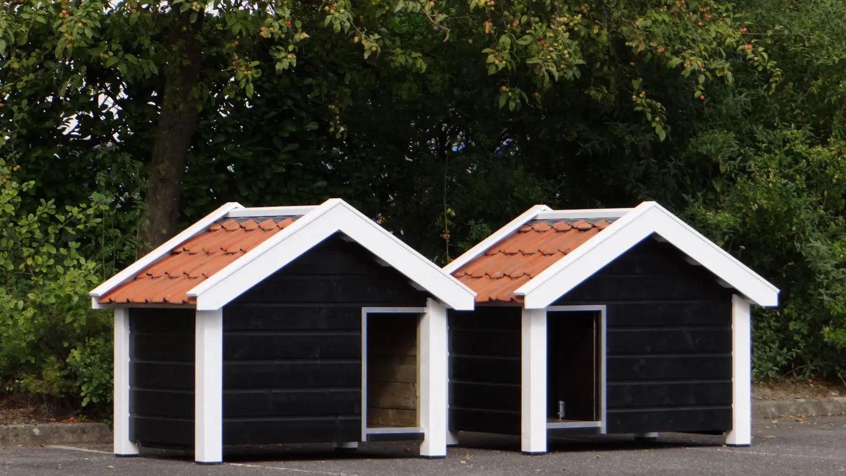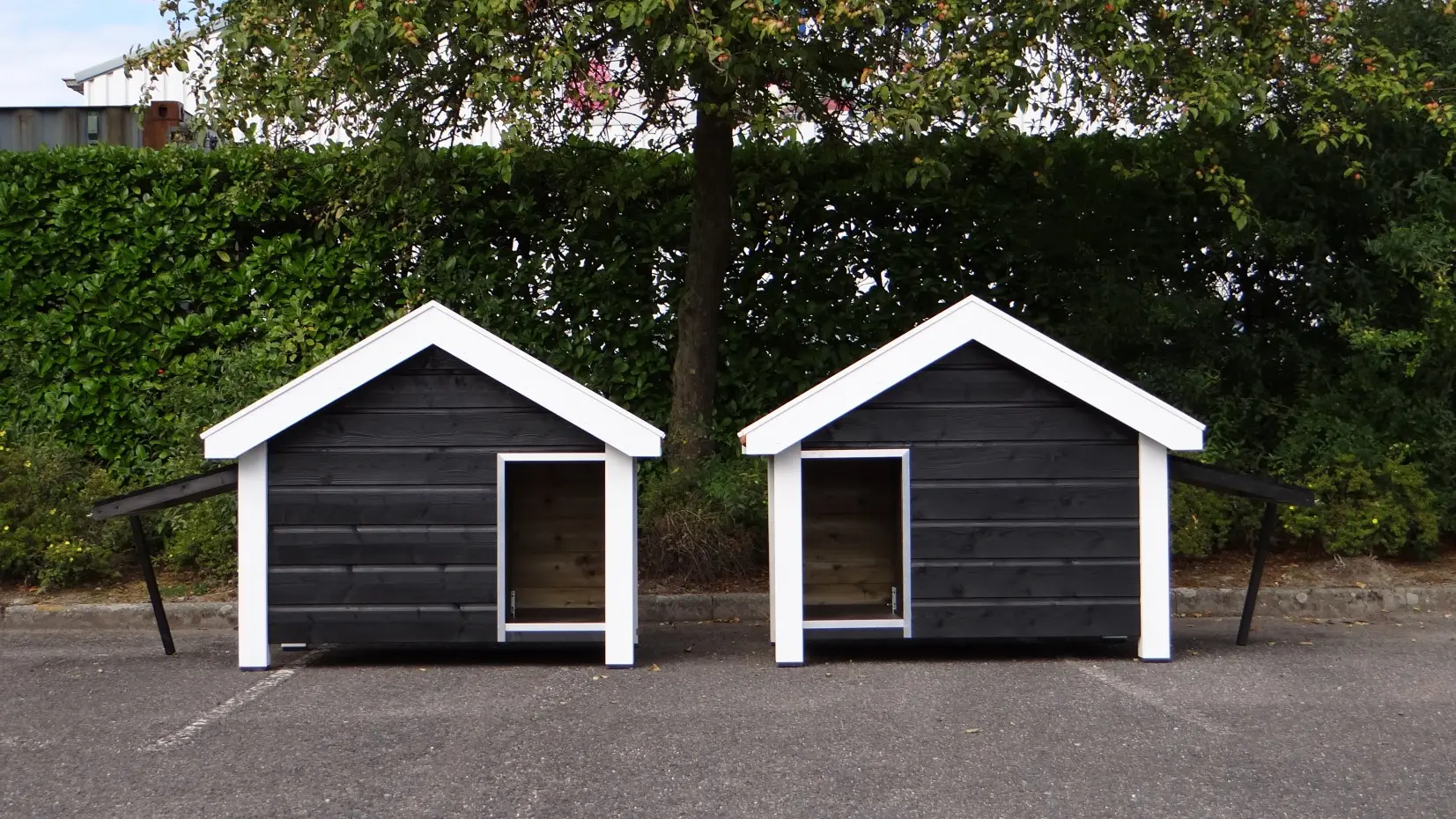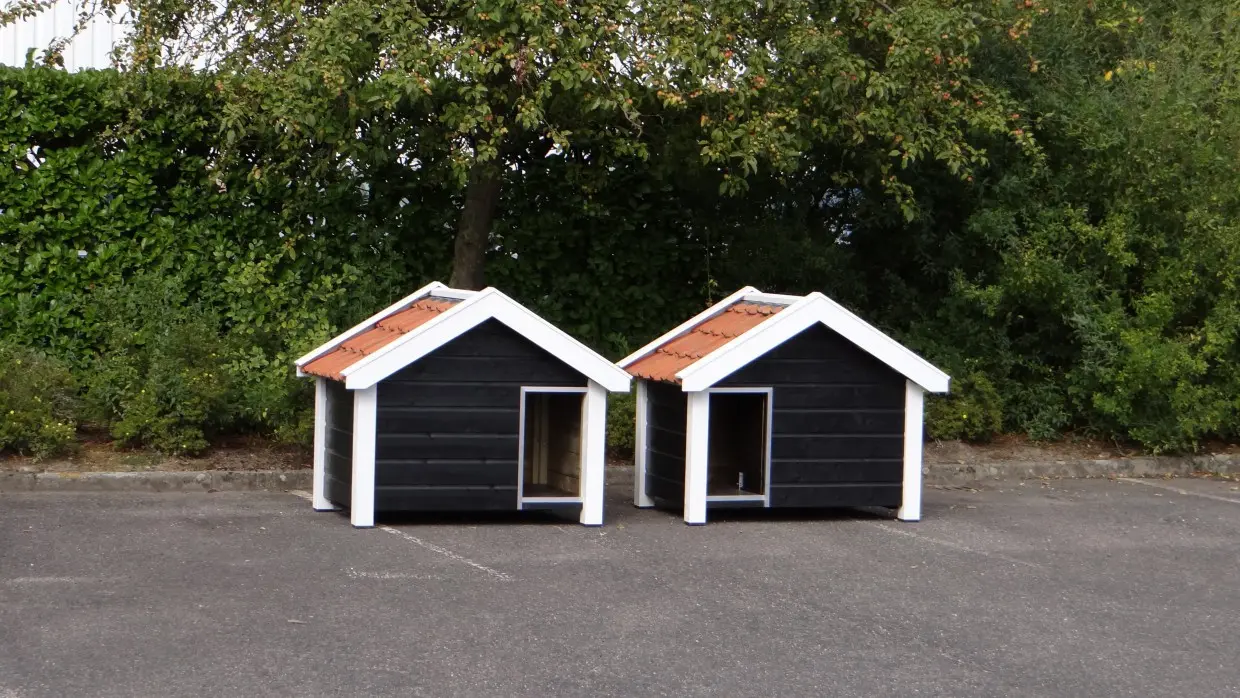 Zwei Hundehütten des Modells Reno wurden spiegelbildlich aus imprägniertem Holz gefertigt, anschließend schwarz-weiß lasiert und mit orangefarbenen Dachziegeln versehen. Diese hochwertigen Hütten wurden von unseren eigenen Handwerkern gebaut – eine perfekte Kombination aus Stabilität, Design, Langlebigkeit und Benutzerfreundlichkeit. Der Boden besteht aus 15 mm starkem Betonmultiplex mit rutschfester Beschichtung, und der Eingang ist mit robustem Aluminium gegen Beschädigungen geschützt. Die Hütten lassen sich leicht mit einer passenden Vorderplattform erweitern. Geeignet für Deutsche Schäferhunde, Golden Retriever und Labradore.