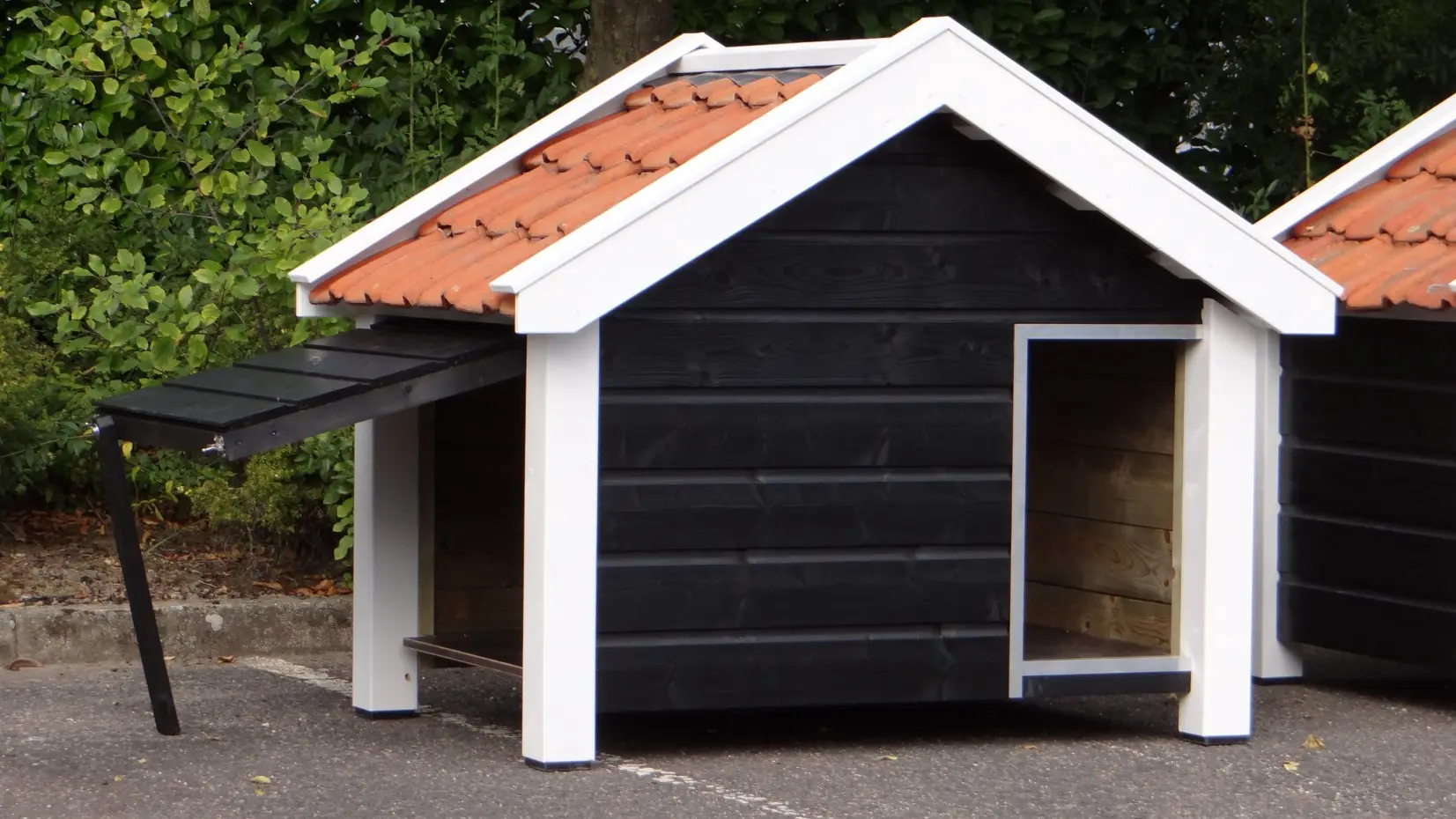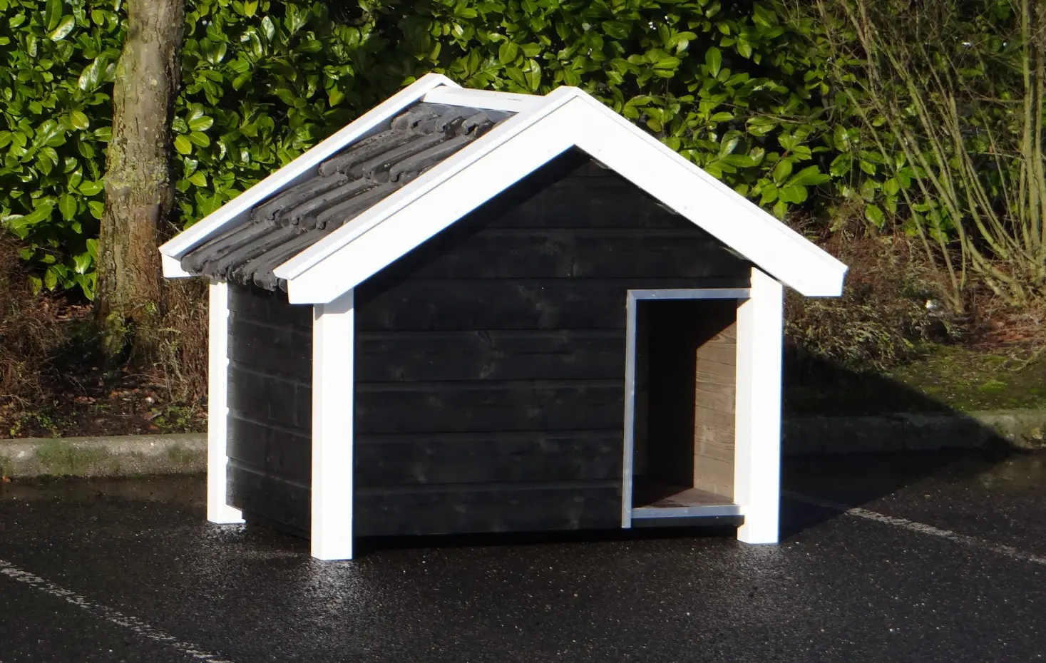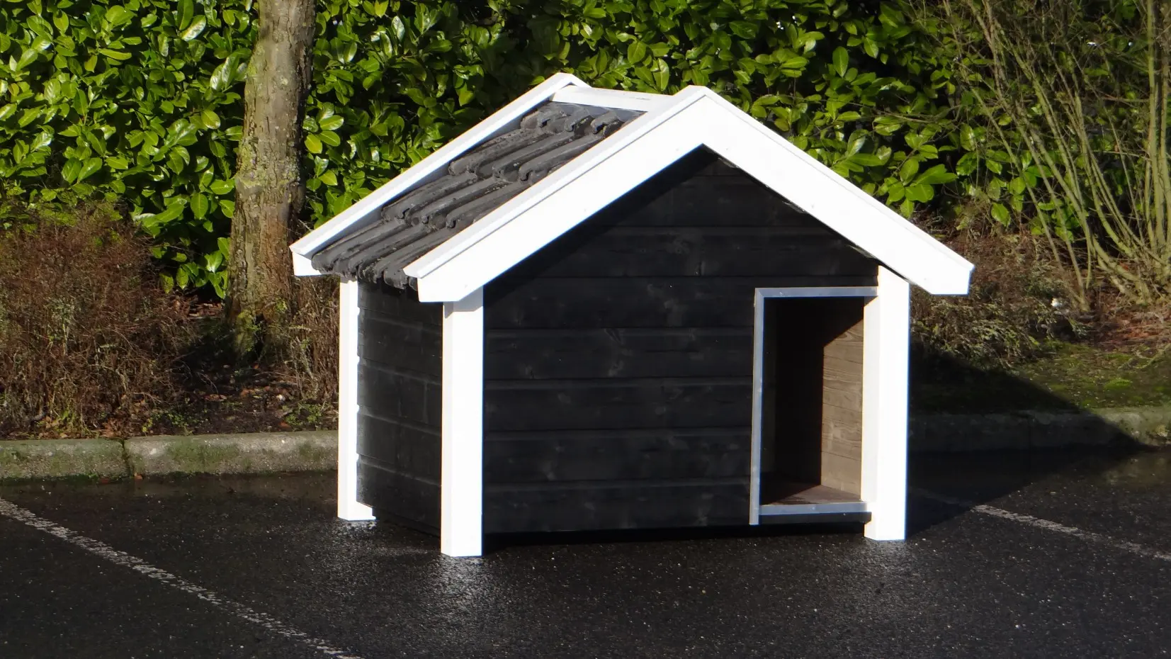Die schwarz-weiße Hundehütte Reno ist ein wunderschönes und äußerst robustes Modell aus imprägniertem Fichtenholz, Betonplex und echten Dachziegeln. Im Stil einer zeeländischen Scheune gefertigt, bietet sie mit einer beweglichen Windschutzklappe höchsten Komfort. Eine seitliche Öffnung erleichtert die Reinigung. Ideal für größere Hunderassen wie Schäferhund oder Labrador.