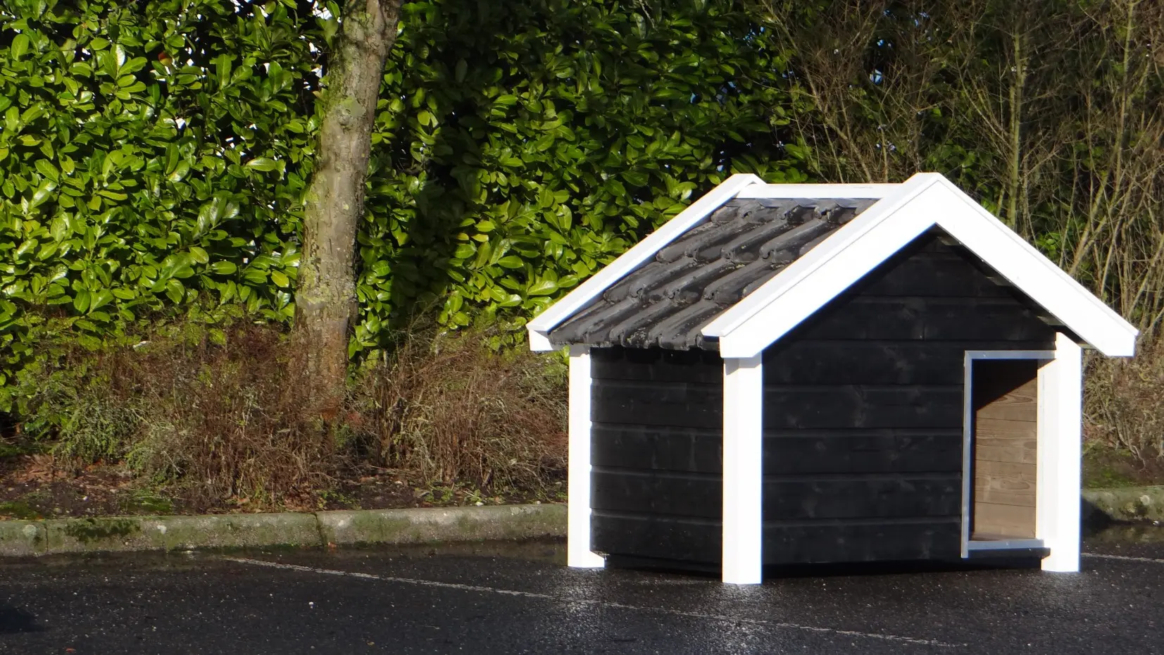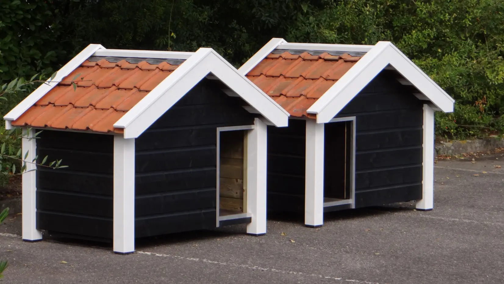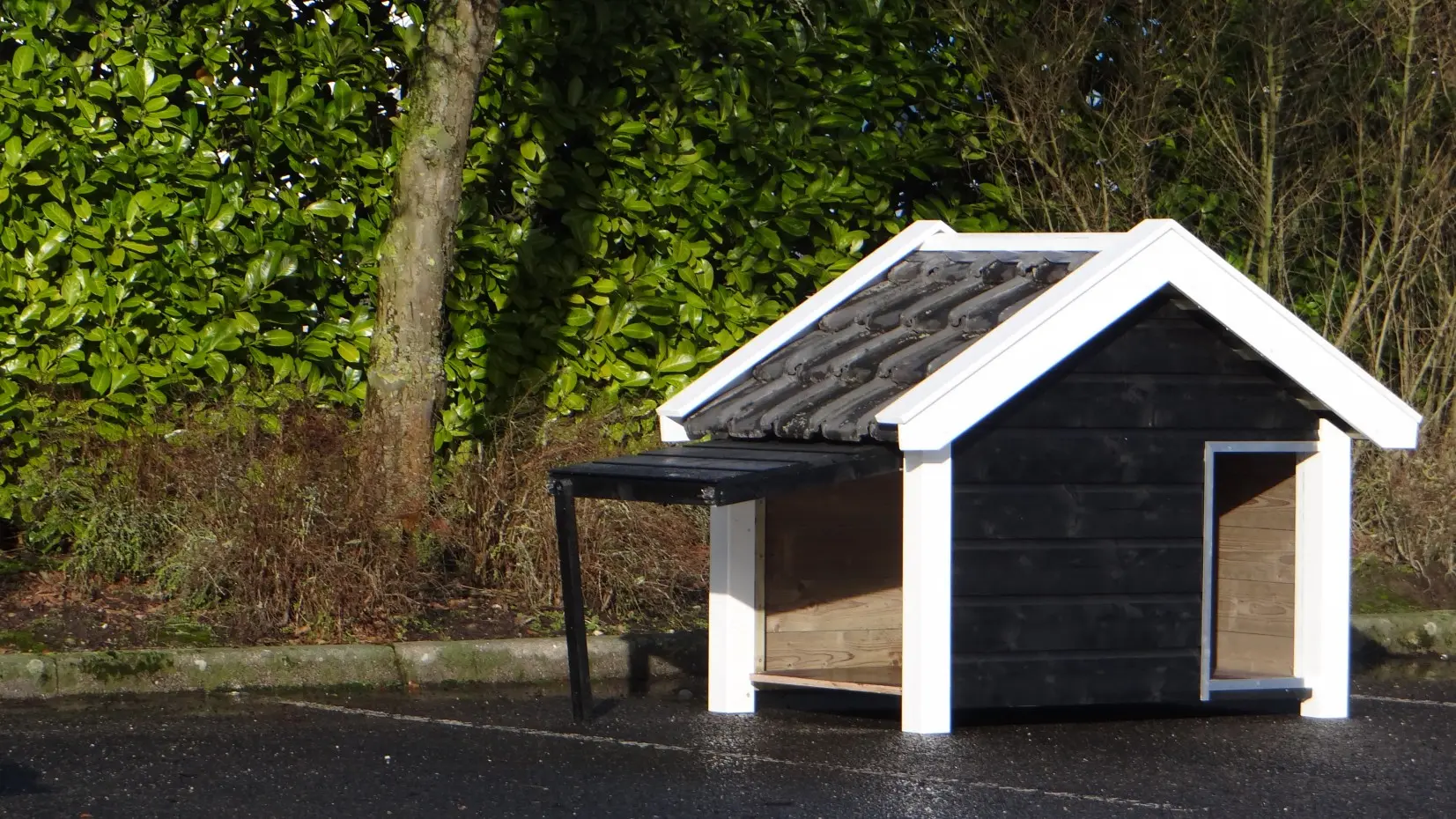 Die schwarz-weiße Hundehütte Reno ist ein wunderschönes und äußerst robustes Modell aus imprägniertem Fichtenholz, Betonplex und echten Dachziegeln. Im Stil einer zeeländischen Scheune gefertigt, bietet sie mit einer beweglichen Windschutzklappe höchsten Komfort. Eine seitliche Öffnung erleichtert die Reinigung. Ideal für größere Hunderassen wie Schäferhund oder Labrador.
