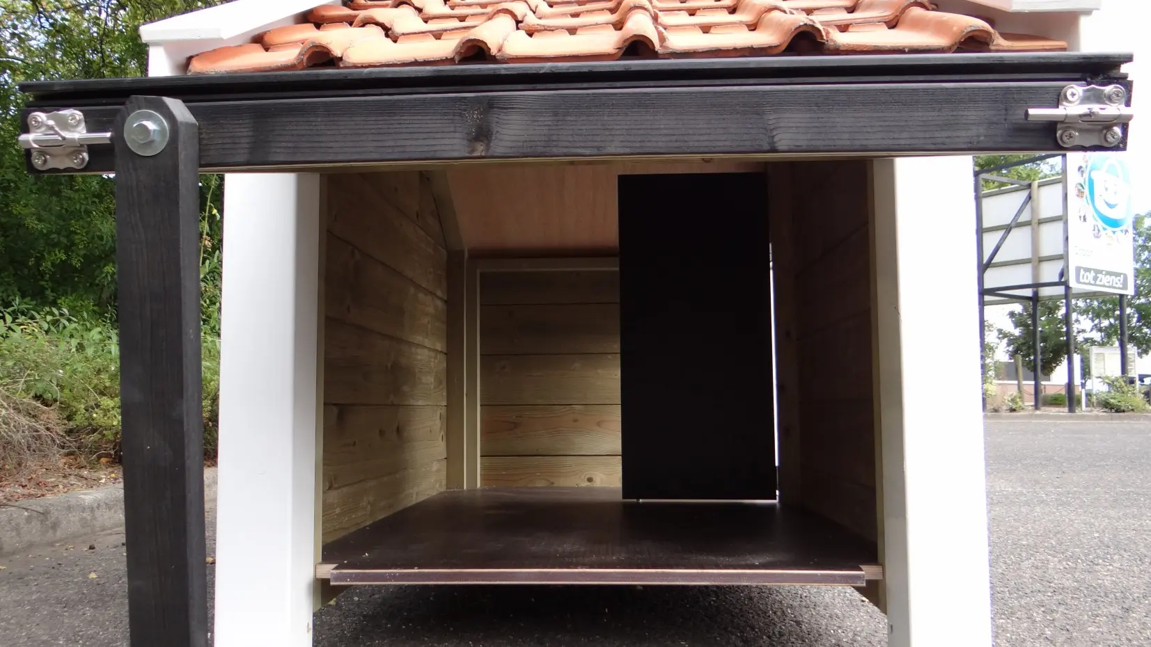 - Die Hütte ist mit einer Seitenklappe ausgestattet.