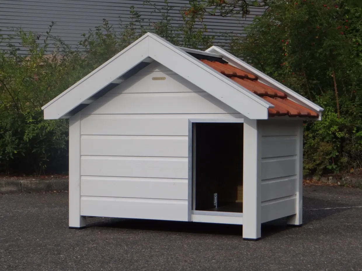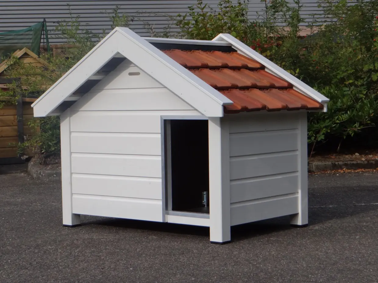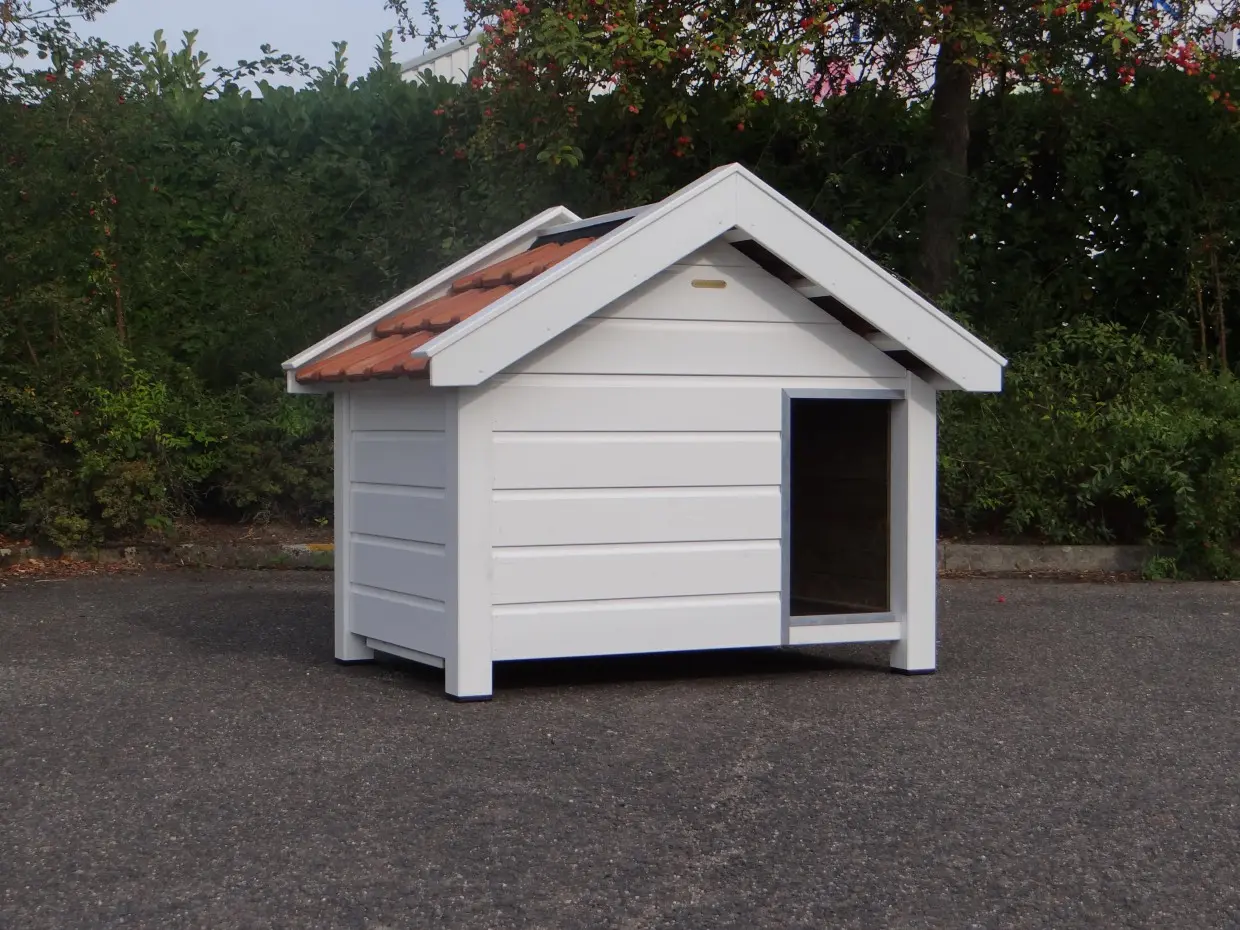 Die Hundehütte Reno Weiß/Weiß ist ein wunderschönes und einzigartiges Modell aus imprägniertem Fichtenholz, kombiniert mit Betonplex. Echte Dachziegel verleihen ihr ein stilvolles und langlebiges Erscheinungsbild. Außenmaße: 160×106×123 cm (B×T×H). Geeignet für Hunde wie Spitz, Labradoodle oder Pomsky.
