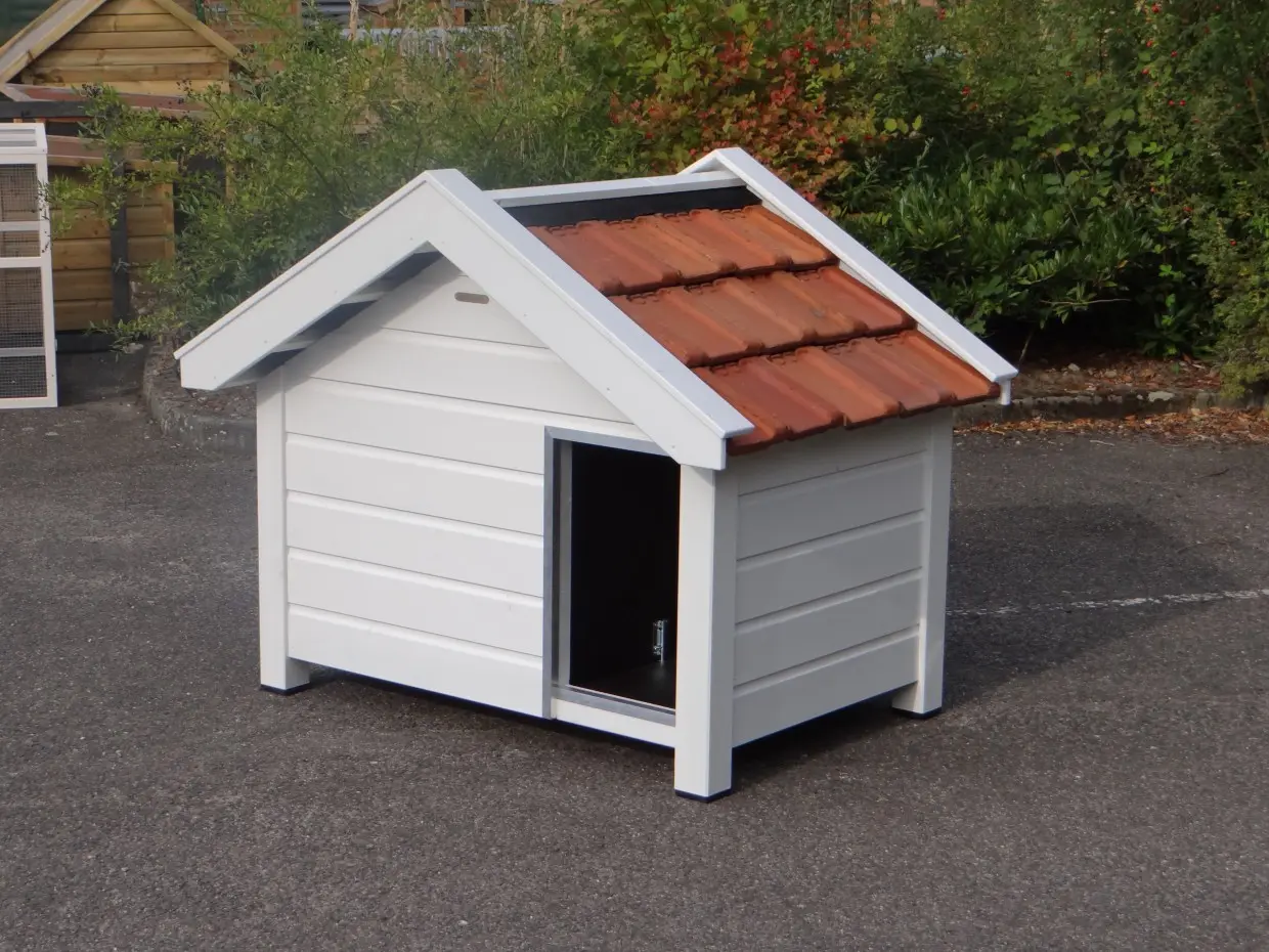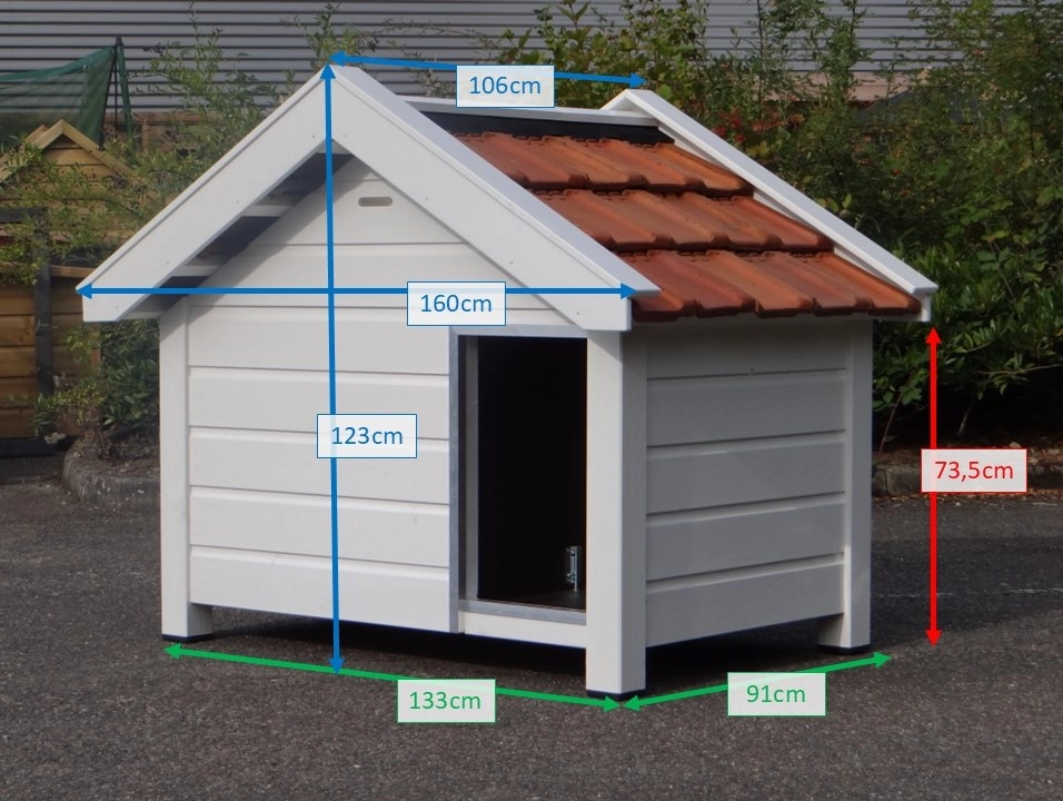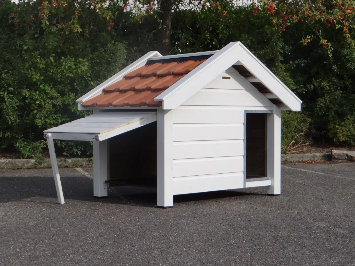 Die Hundehütte Reno Weiß/Weiß ist ein wunderschönes und einzigartiges Modell aus imprägniertem Fichtenholz, kombiniert mit Betonplex. Echte Dachziegel verleihen ihr ein stilvolles und langlebiges Erscheinungsbild. Außenmaße: 160×106×123 cm (B×T×H). Geeignet für Hunde wie Spitz, Labradoodle oder Pomsky.