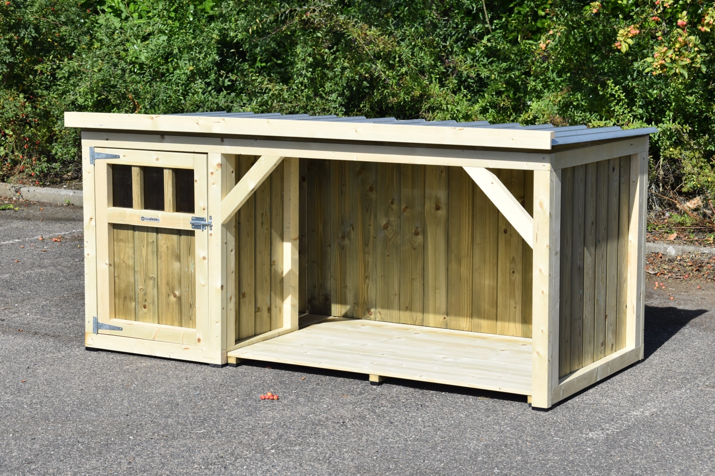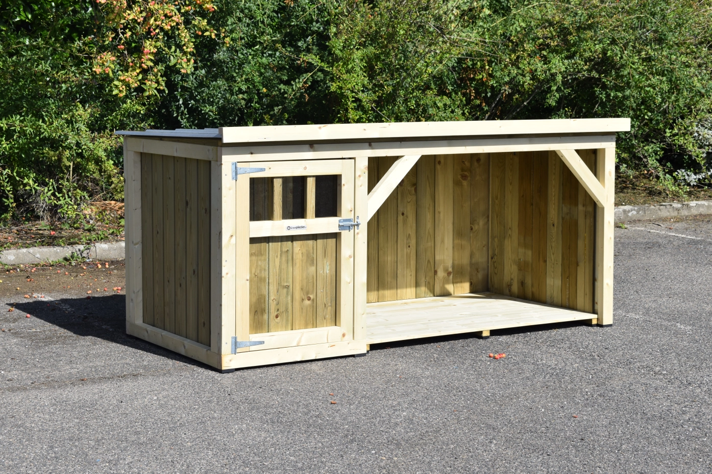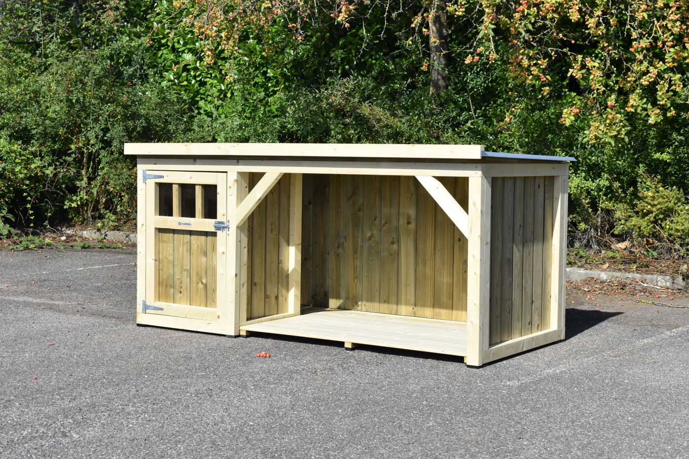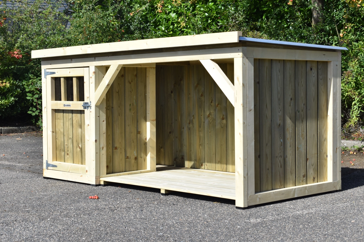 Hundehütte Isa 1 hat ein überdeckte Veranda. Der Hütte ist geeignet für (mittel)große Hunden. Der Schlafraum hat ein Holzboden und ein große Tür. Die Veranda bietet Ihre Hund einen geschützten Platz. Sie können auch ein Boden für den Veranda mitbestellen. Wir herstellen die Hütte aus imprägniertes Fichtenholz, so es ist wartungsfrei.