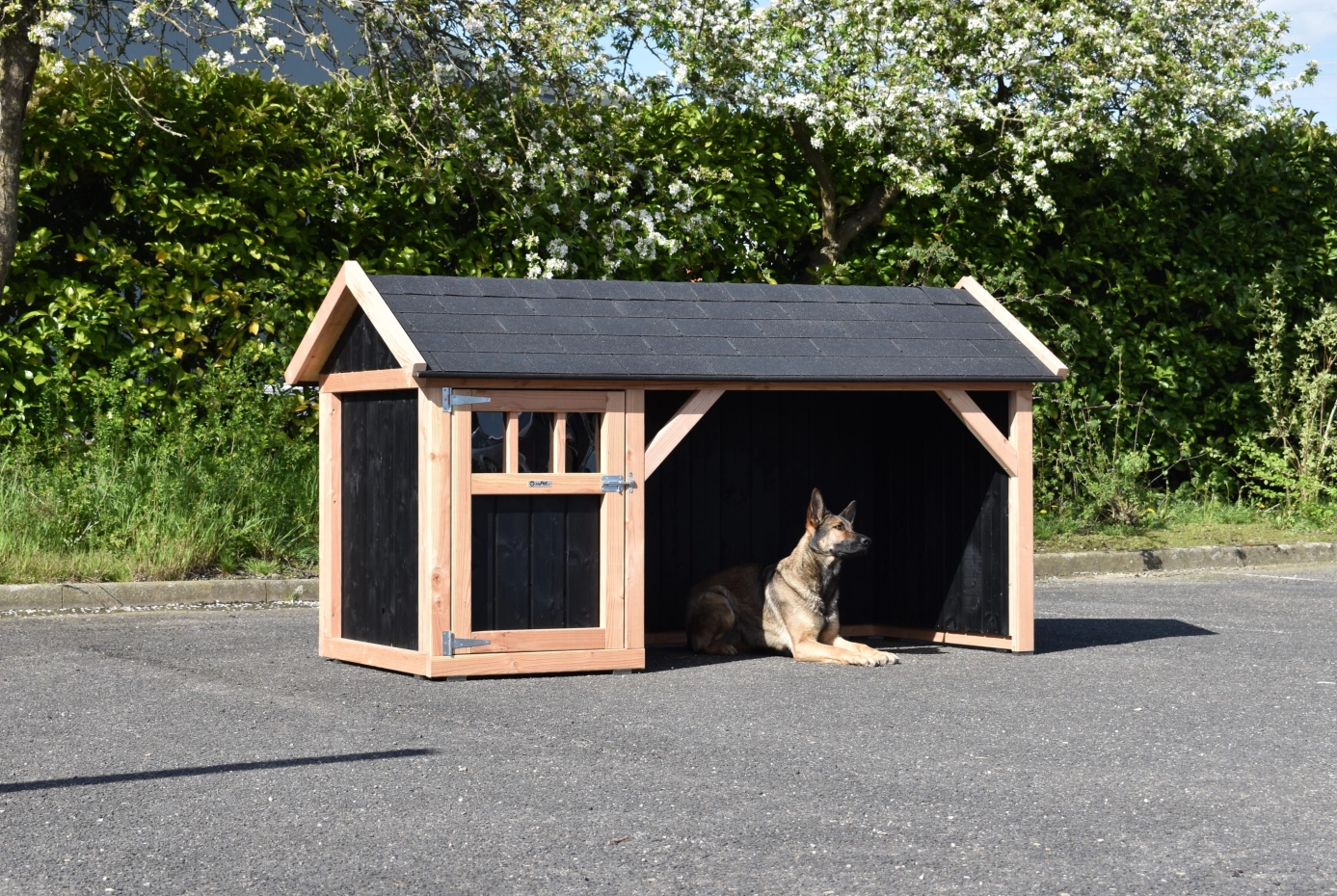 Hundehütte Isa 1 hat ein überdeckte Veranda. Der Hütte ist geeignet für (mittel)große Hunden. Der Schlafraum hat ein Holzboden und ein große Tür. Die Veranda bietet Ihre Hund einen geschützten Platz. Sie können auch ein Boden für den Veranda mitbestellen. Wir herstellen die Hütte aus Douglasienholz mit schwarz imprägnierter Fichtenholz. so es ist wartungsfrei.