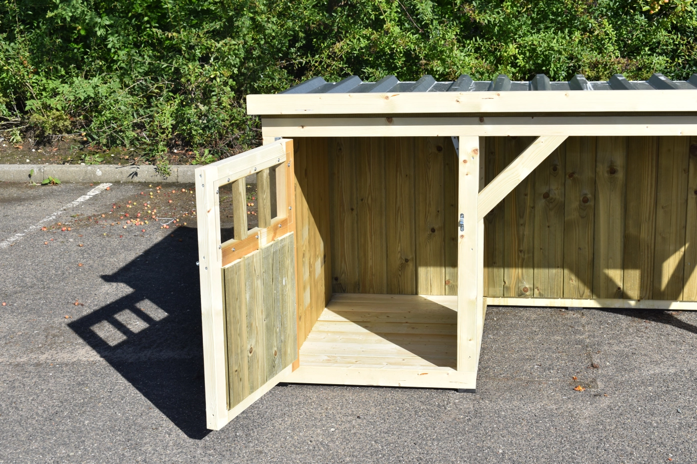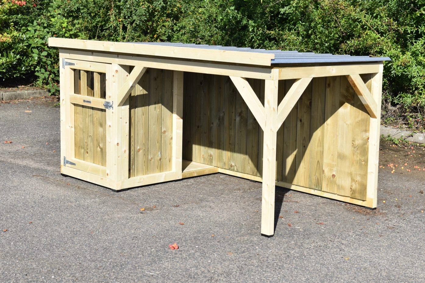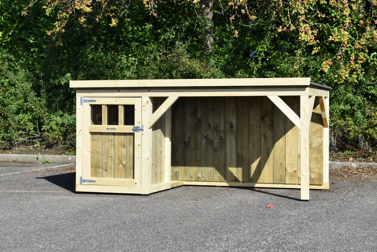 Hundehütte Isa 2 hat ein überdeckte Veranda. Der Hütte ist geeignet für (mittel)große Hunden. Der Schlafraum hat ein Holzboden und ein große Tür. Die Veranda bietet Ihre Hund einen geschützten Platz. Sie können auch ein Boden für den Veranda mitbestellen. Wir herstellen die Hütte aus imprägniertes Fichtenholz, so es ist wartungsfrei.