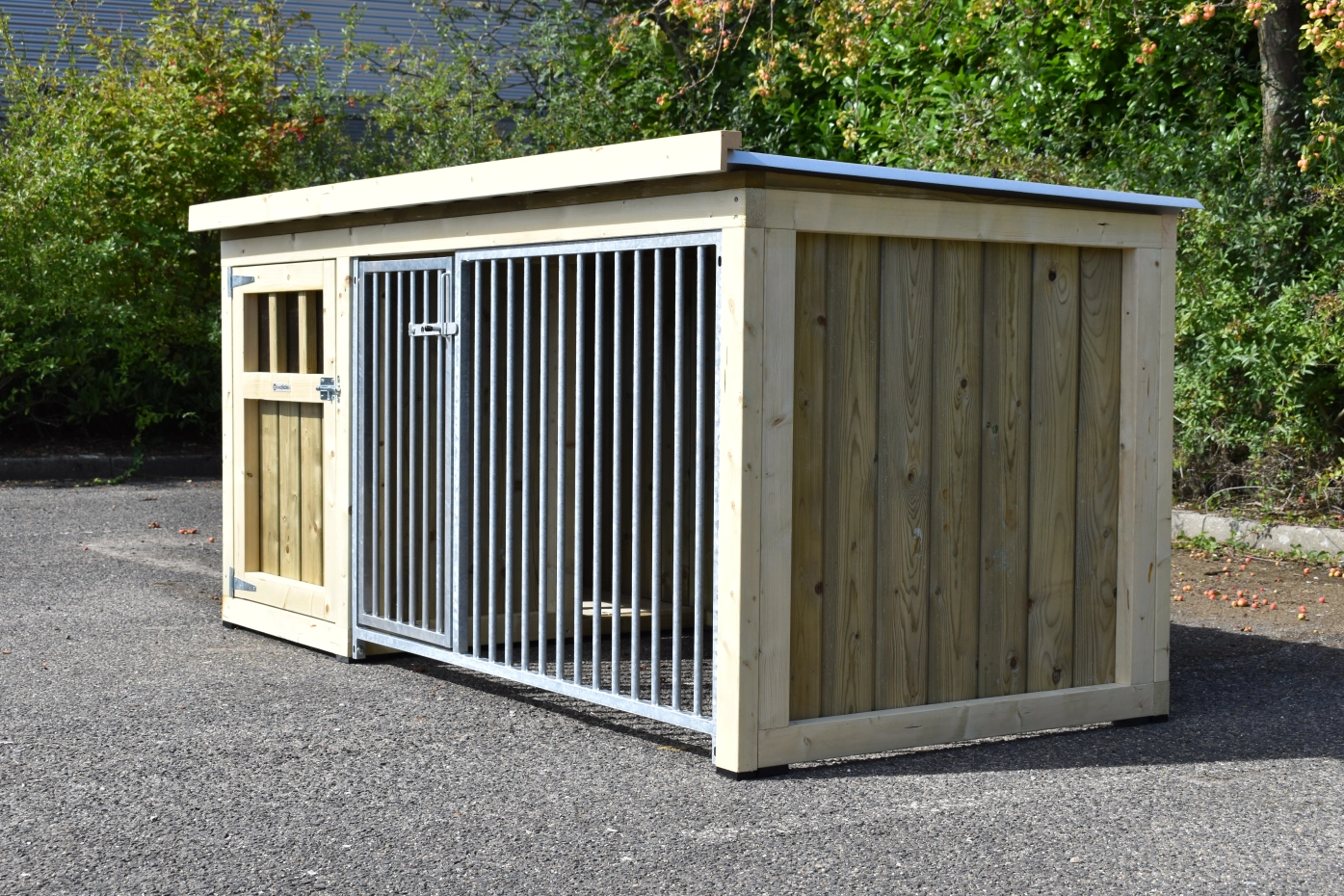 Hundezwinger Isabelle 1 ist geeignet für (mittel)große Hunden. Der Schlafraum hat ein dichte Holzboden und ist ausgestattet mit ein große Tür. Der Isabelle 1 ist ausgestattet mit viele dichte Wanne und ein Gitterpaneel. Es bietet ein schöne Platz für Ihre Hund.
