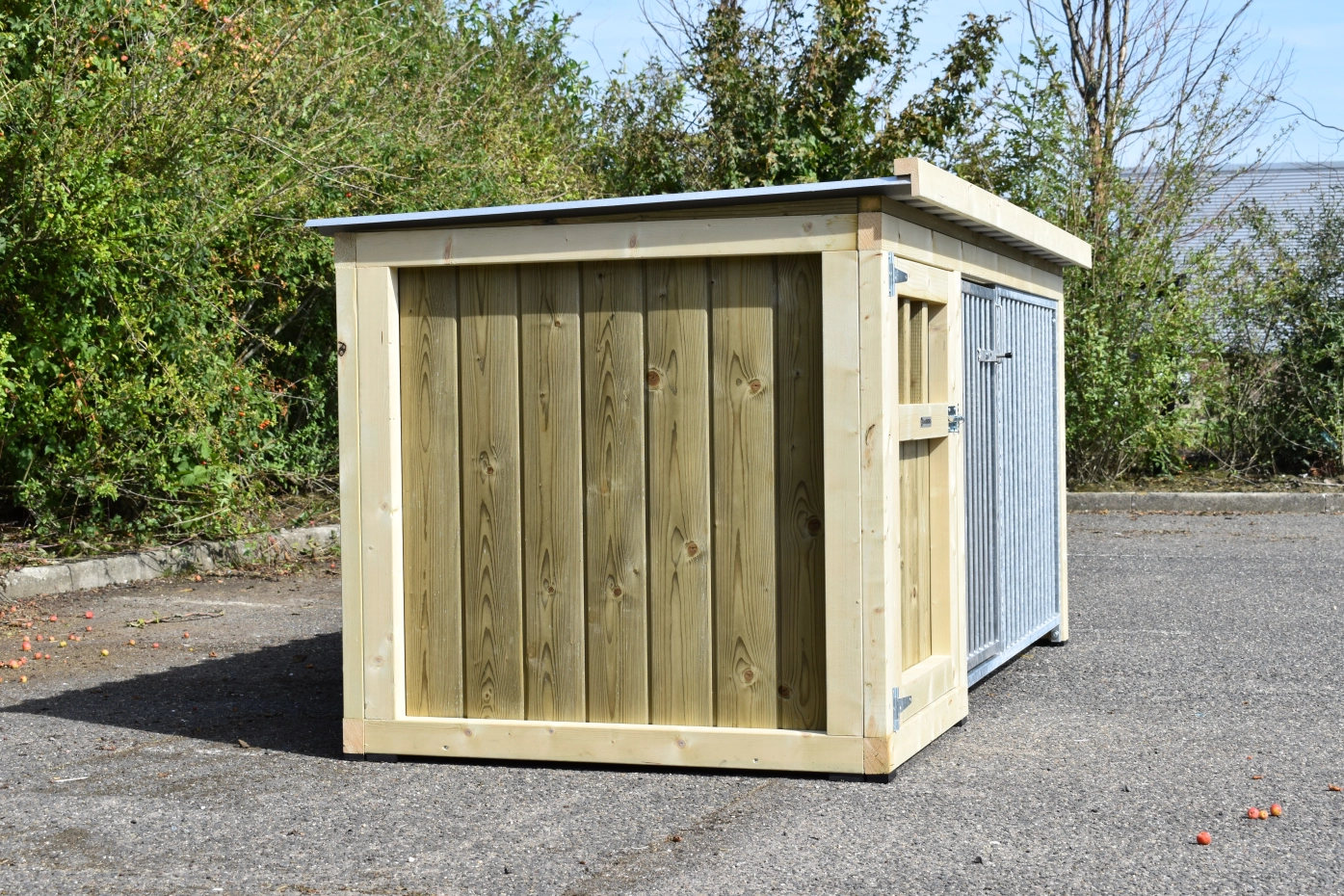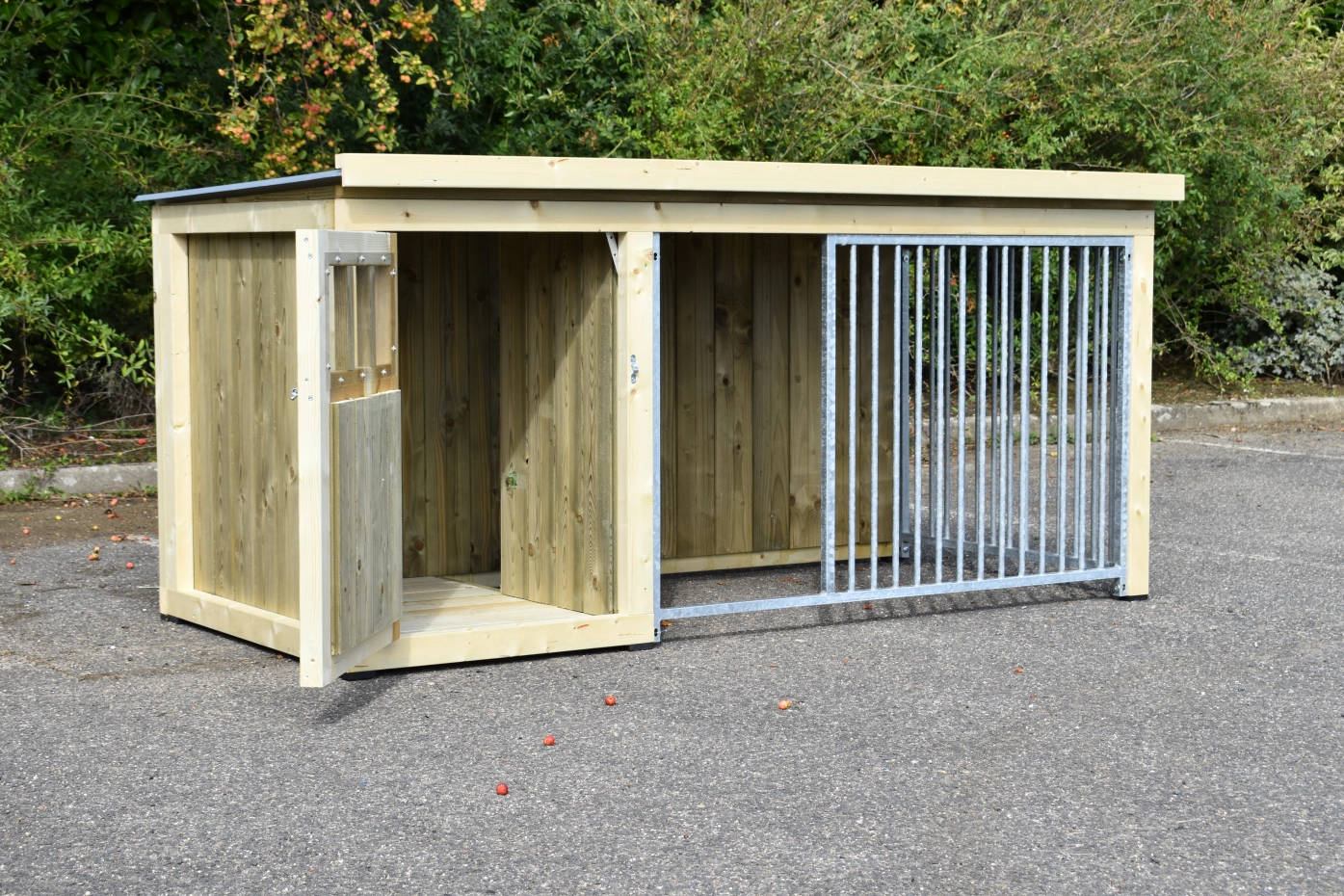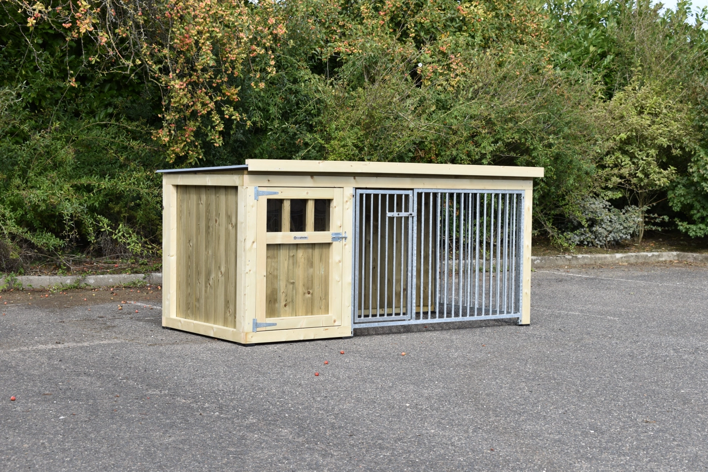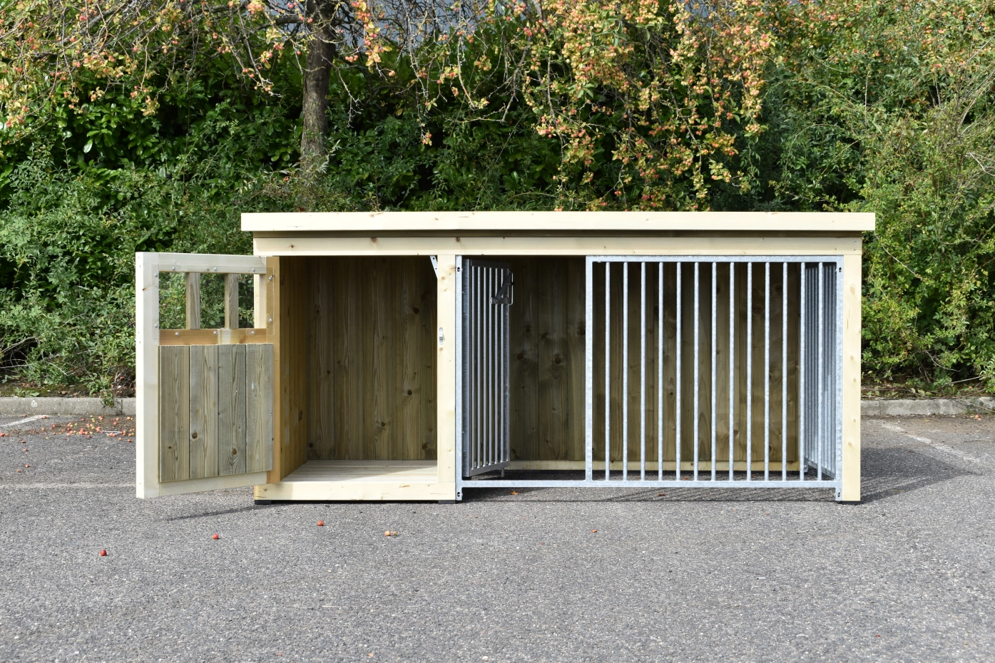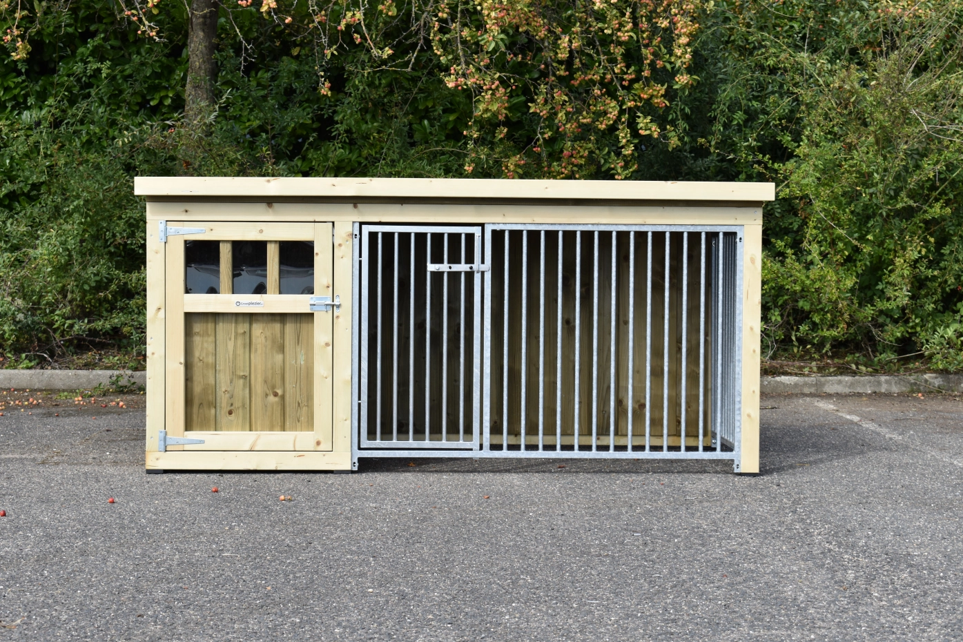 Hundezwinger Isabelle 2 ist geeignet für (mittel)große Hunden. Der Schlafraum hat ein dichte Holzboden und ist ausgestattet mit ein große Tür. Der Isabelle 2 zwinger ist ausgestattet mit viele dichte Wanne und zwei Gitterpanele. Es bietet ein schöne Platz für Ihre Hund.
