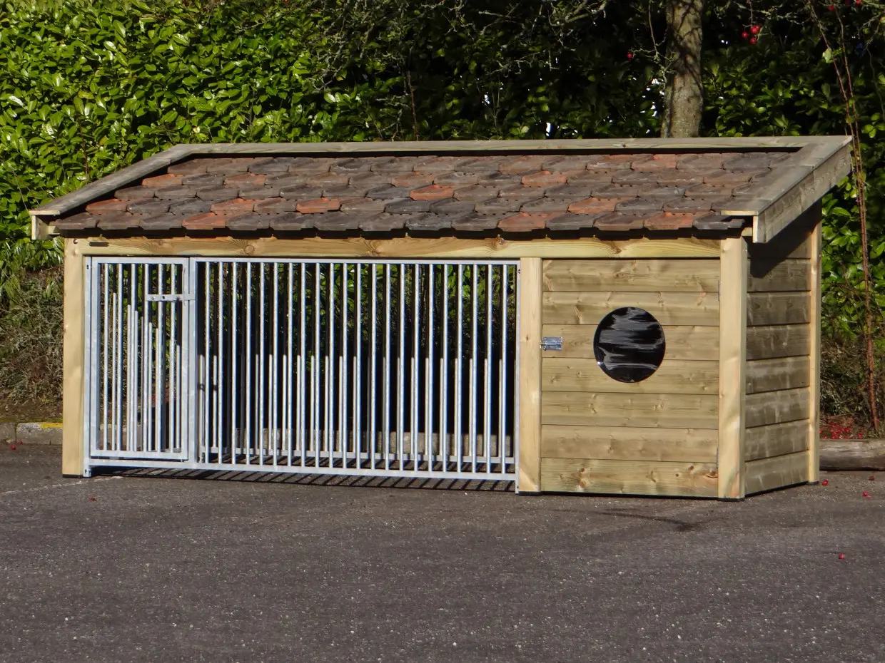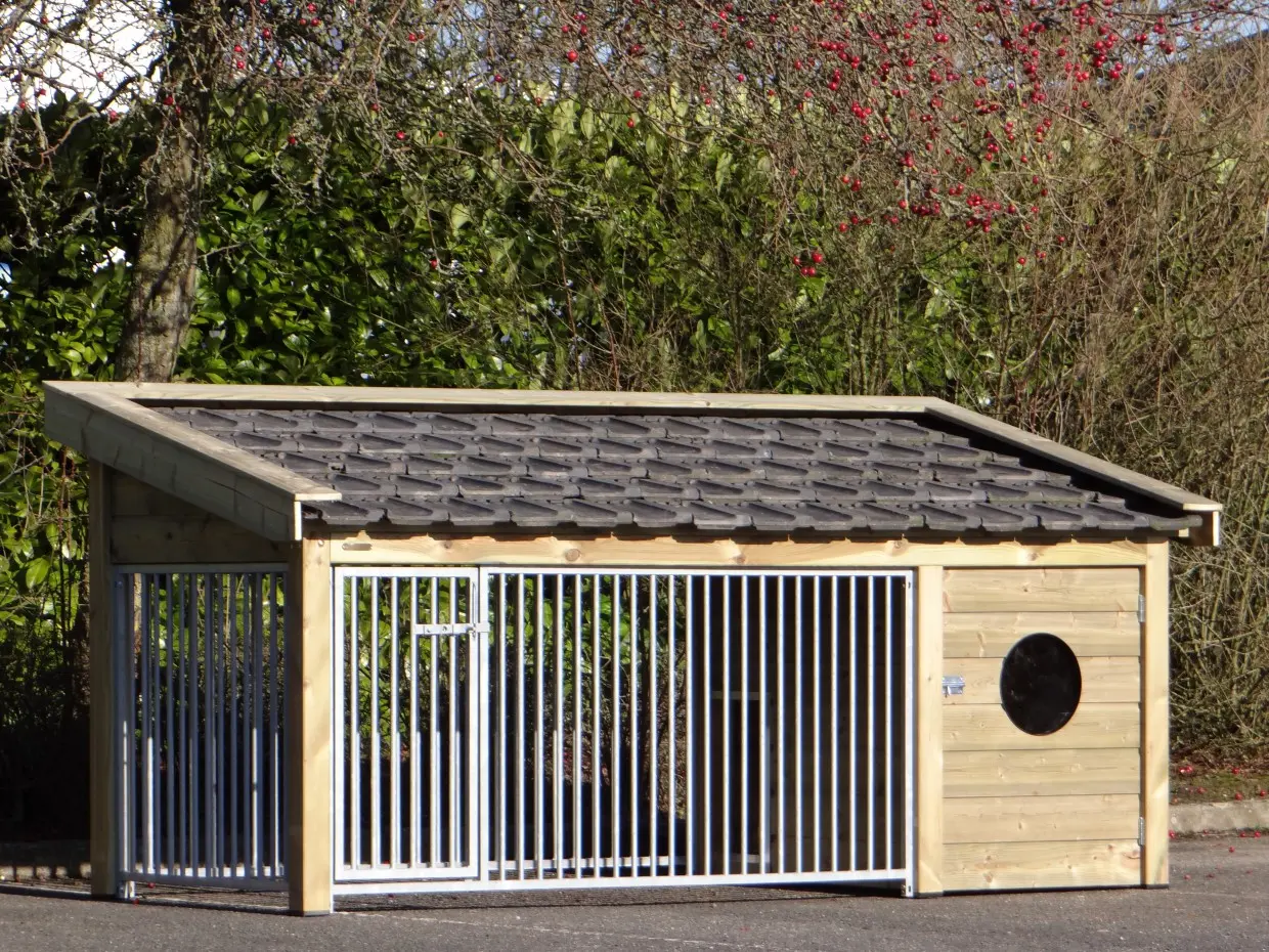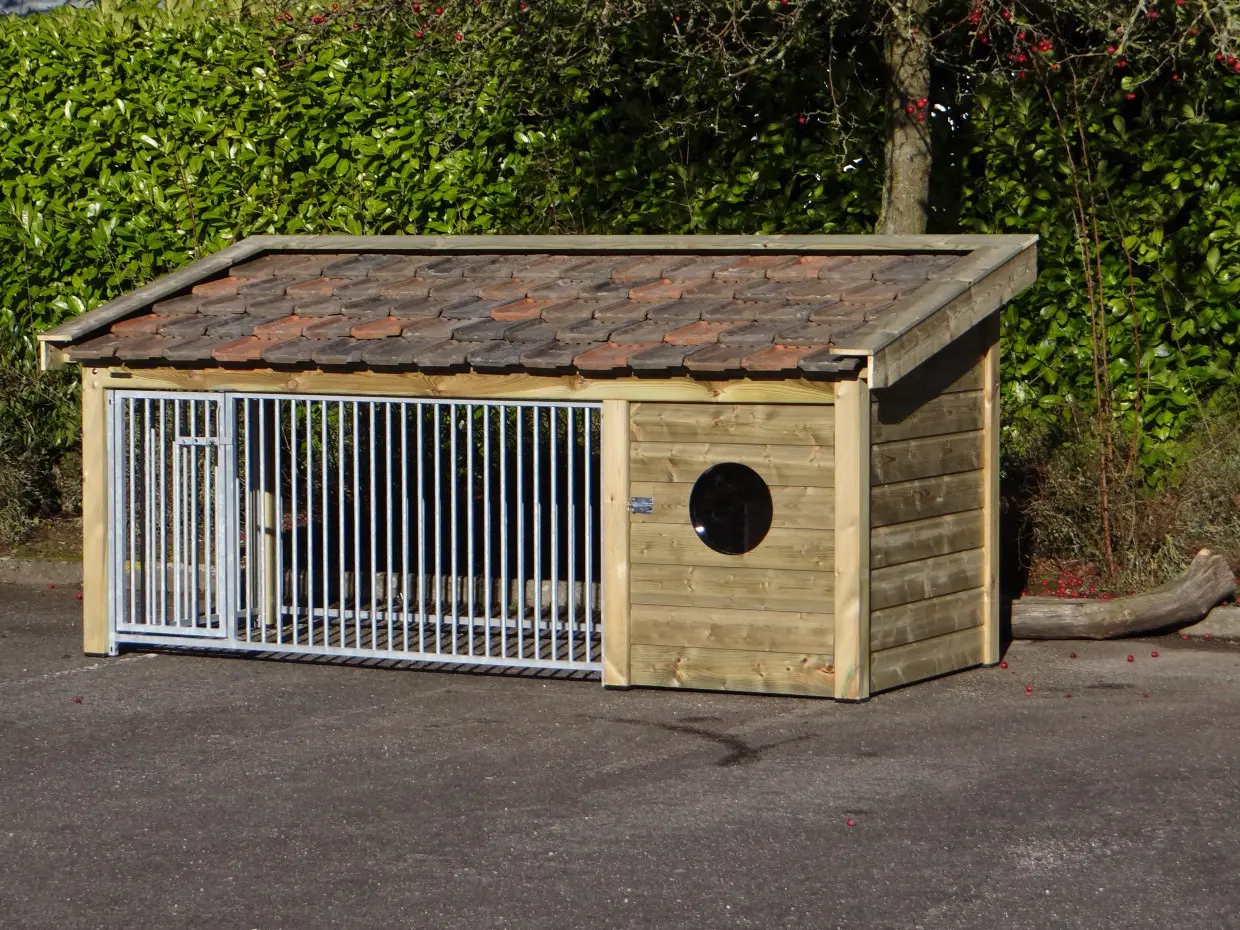 Die Hundehütte Roxy 3 vereint ein geräumiges Schlafhaus und einen offenen Auslauf unter einem Dach. Das Dach ist mit Keramikziegeln in drei wählbaren Farben gedeckt. Das Holz besteht aus imprägnierter Fichte und ist wartungsfrei. Der Boden des Schlafbereichs aus rutschfestem Betonmultiplex ist leicht zu reinigen. Roxy 3 verfügt an drei Seiten über Gitterstäbe – eine hochwertige Außenanlage für Ihren Hund.