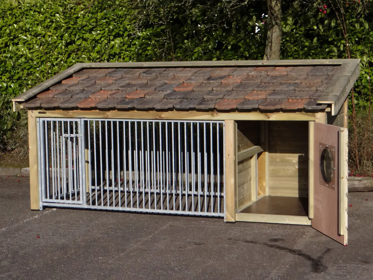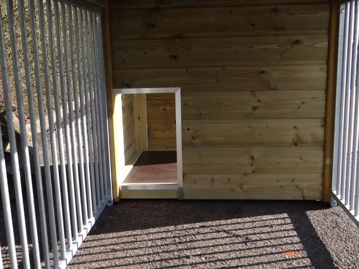 - Diese Version 3 ist versehen mit 3 Zwingerpaneele: 1 an der Vorseite (mit Tür) und 1 an der Seite, und 1 an der Hinterseite.