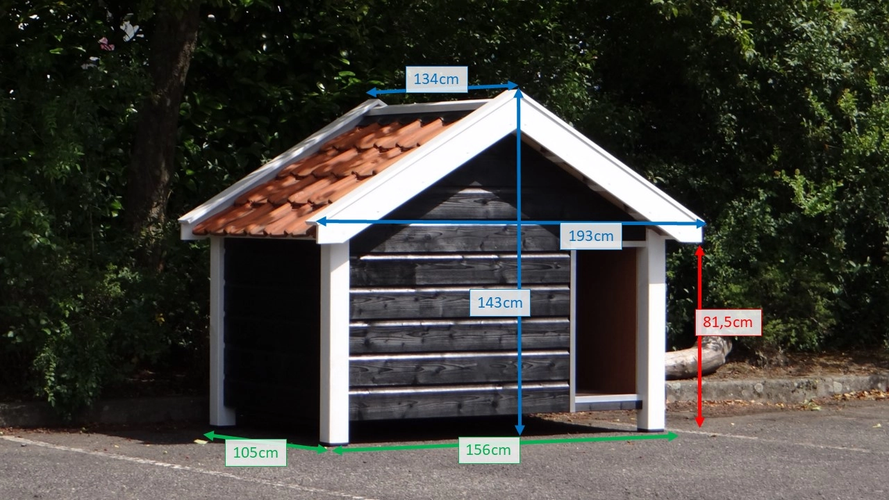 Die Hundehütte Snuf ist groß, hochwertig und äußerst robust. Sie besteht aus imprägniertem Fichtenholz in Kombination mit Betonplex und echten Dachziegeln – ein Garant für Langlebigkeit! Im Stil einer zeeländischen Scheune gefertigt, überzeugt sie auch durch hohen Bedienkomfort: Eine drehbare Windschutzklappe und eine komplett aufklappbare Seitenwand ermöglichen eine mühelose Reinigung mit Gartenschlauch, Besen oder Hochdruckreiniger. An heißen Sommertagen sorgt die offene Seitenwand für angenehme Belüftung. Snuf ist praktisch, komfortabel und langlebig. Die Hütte wird komplett montiert geliefert und ist auch in isolierter Ausführung erhältlich. Wand- und Bodendicke : 18 mm.