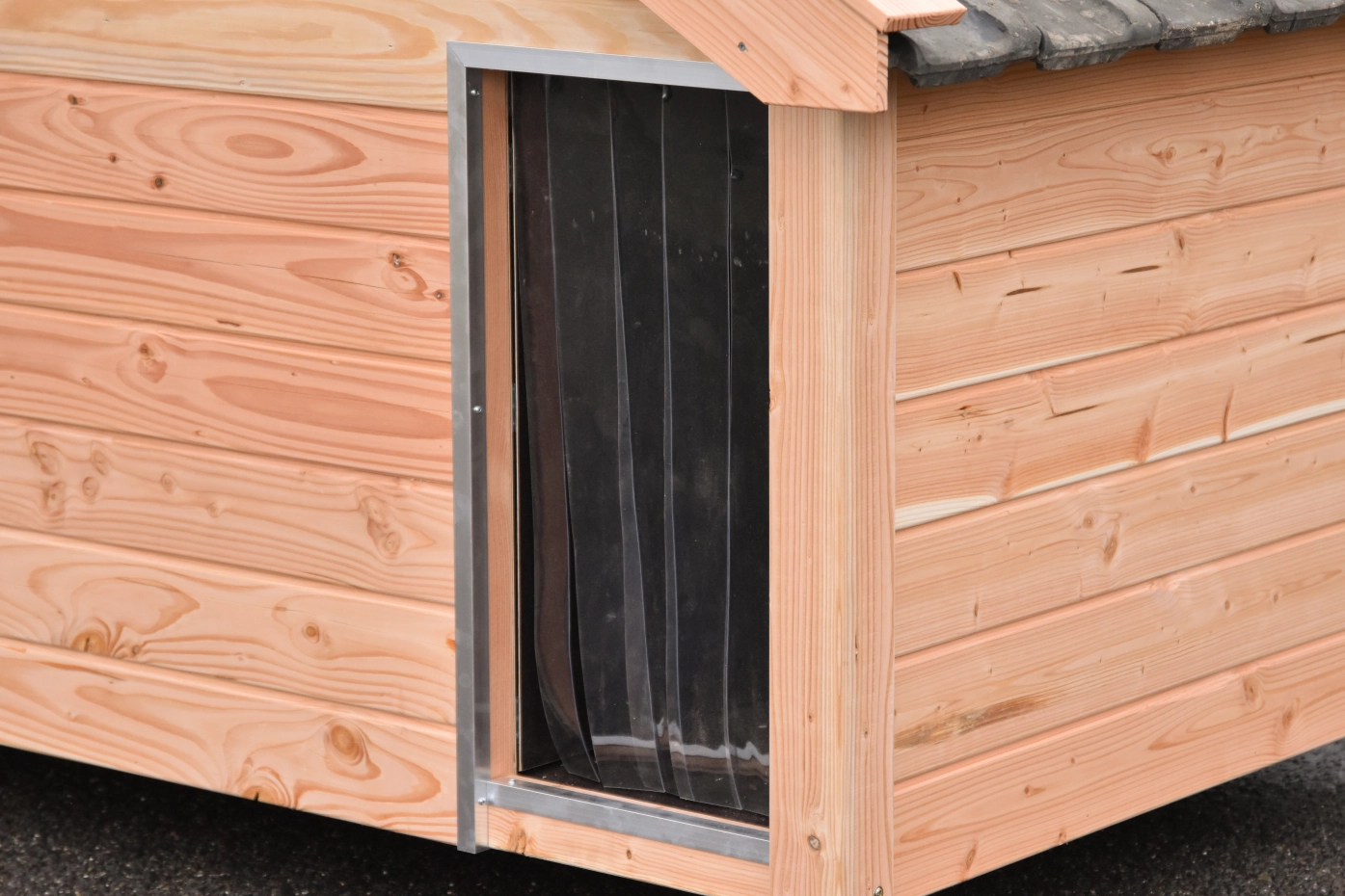 - Die Hütte ist mit einer Seitenklappe ausgestattet.