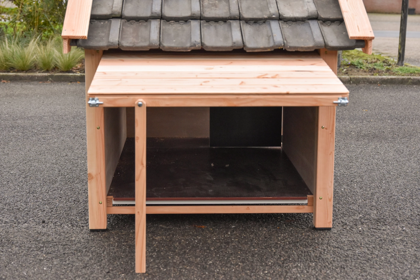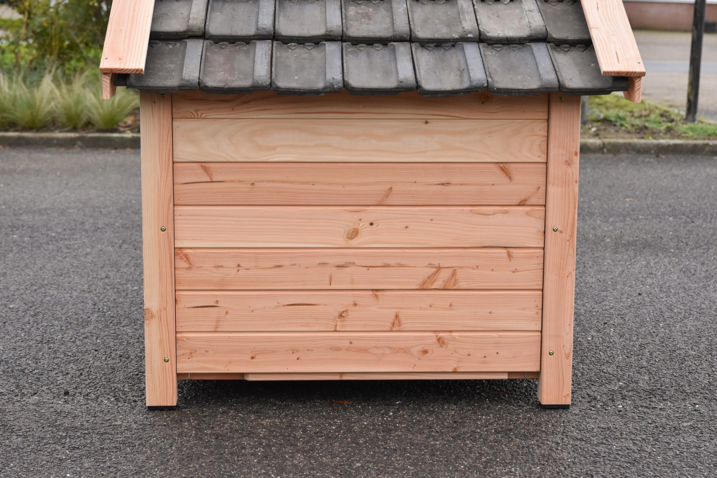 - Die Hundehütte hat schwarze Kunststofffüße, die das Bewegen erleichtern und die Hütte vor Feuchtigkeit schützen