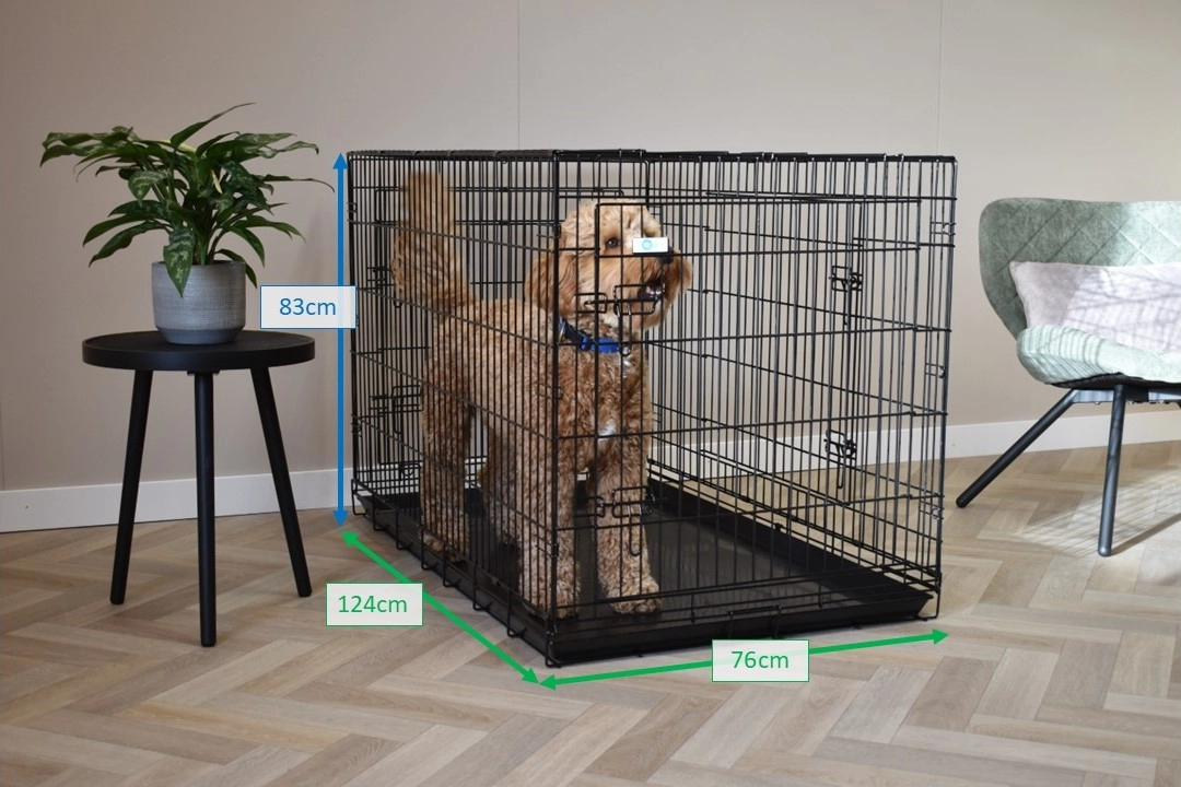 Große Hundezwinger mit den Maßen 124x76cm und einer Höhe von 83cm. Eine solide Hundebox mit dicken, schwarz pulverbeschichteten Stäben. Die Box hat 3 robuste Türen mit speziellen, doppelten Verschlüssen. Diese große, faltbare Hundebank hat außerdem rutschfeste Gummifüße und ein stabiles, herausnehmbares Kunststofftablett. Unsere Hundebox ist für große Hunde geeignet: Alaskan Malamute, Bobtail, Bouvier, Bullmastif, Dobermann Pinscher, Deutscher Schäferhund, Ägyptischer Pharaohund, Rottweiler, Tschechoslowakischer Wolfshund, Schweizer Schäferhund und Schweizer Sennenhund. Die Hundezwinger ist in 7 verschiedenen Größen erhältlich: 48cm / 63cm / 78cm / 93cm / 109cm / [124cm] / 136cm.