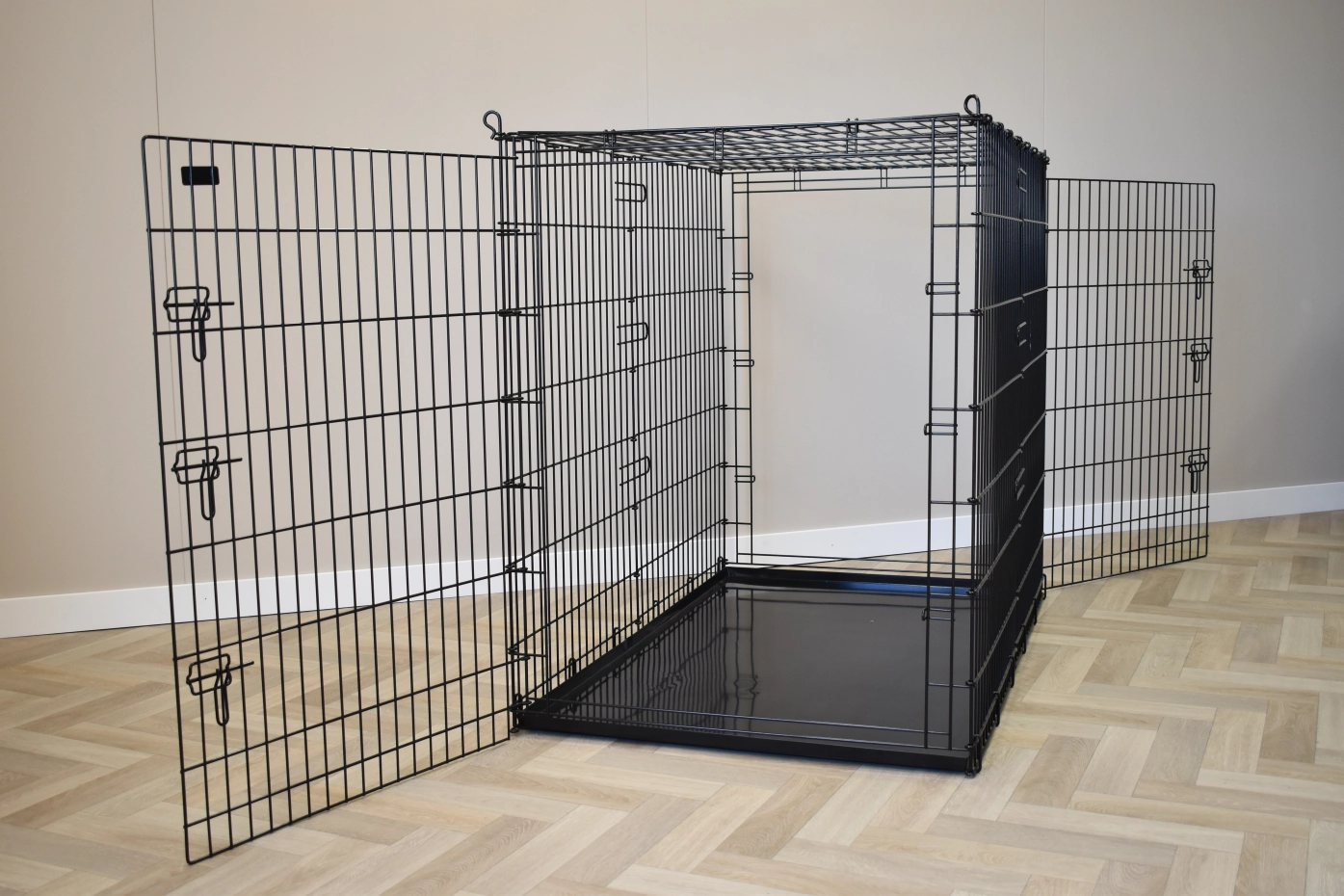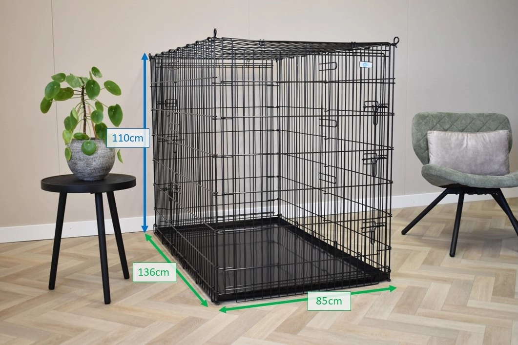 Diese extra große Hundebox von nicht weniger als 136x85x110cm (LxBxH) ist eine riesige Hundebox. Selbst der größte Hund passt in diesen Drahtkäfig. Diese große XXL-Hundehütte ist mit 2 Türen mit soliden 3-Doppelverschlüssen ausgestattet.