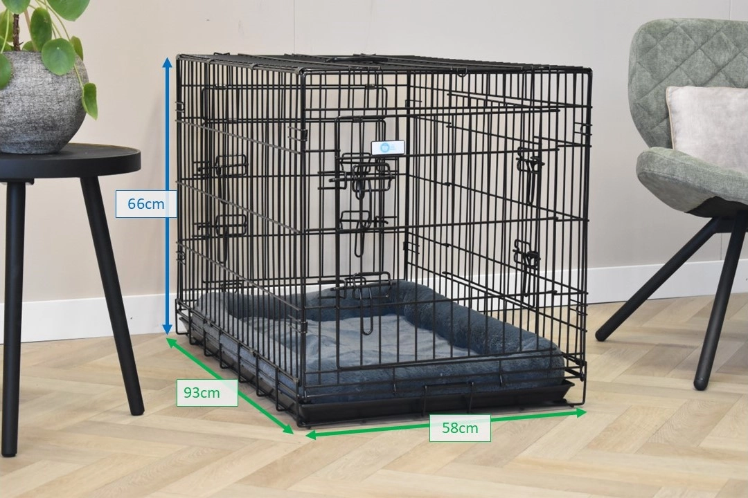 Diese stabile Hundekäfig Strong 93cm ist ausgestattet mit 3 Türen. Unsere Käfig hat dicke schwarz pulverbeschichtete Stäbe. Diese Käfig ist einfach faltbar und kann mit die mitgelieferte Griffe einfach transportiert werden. Durch der herausnehmbare Lade ist der Käfig leicht zu reinigen. Diese stabile Käfig ist verfügbar in 7 verschiedene Maße: 48cm / 63cm / 78cm / [93cm] / 109cm / 124cm / 136cm. Die mittelgroße Hundebox ist geeignet für Hunde wie: American Staffordshire Terrier, Bulldogge, Chow Chow, Cocker Spaniel, Englischer Setter, Englischer Springer Spaniel, Labradoodle, Pit Bull Terrier, Samojede, Shar Pei und Siberian Husky.