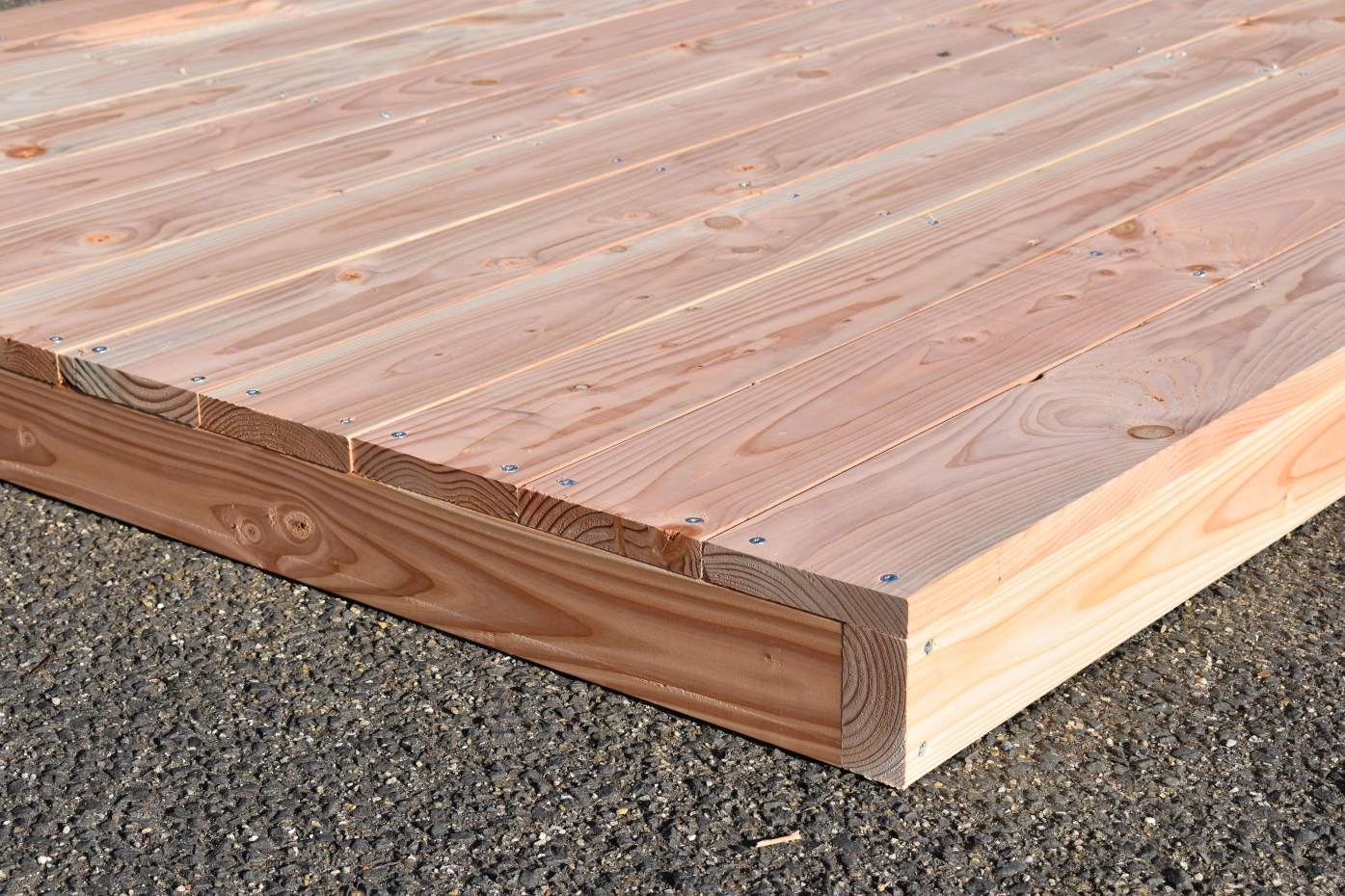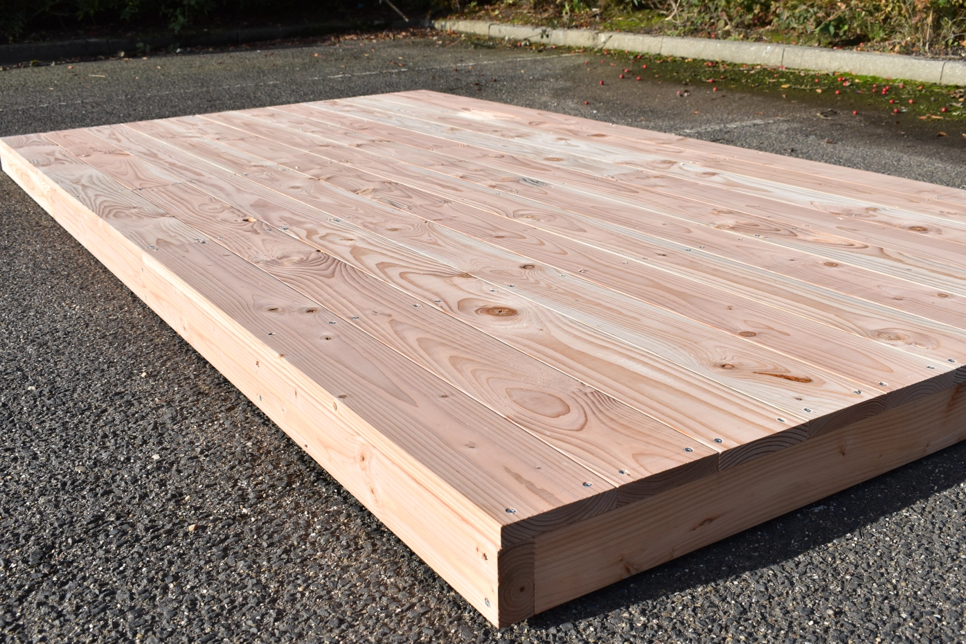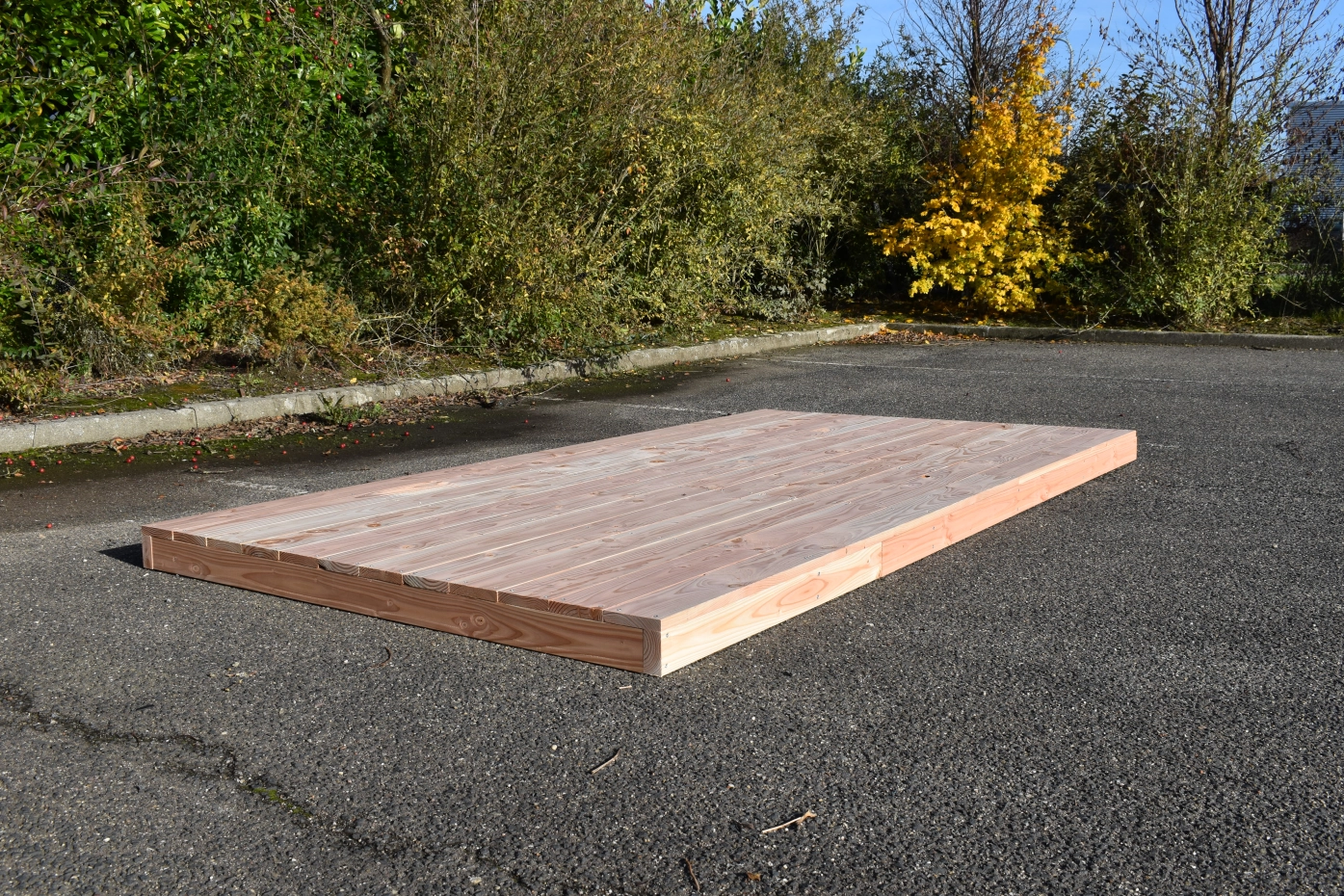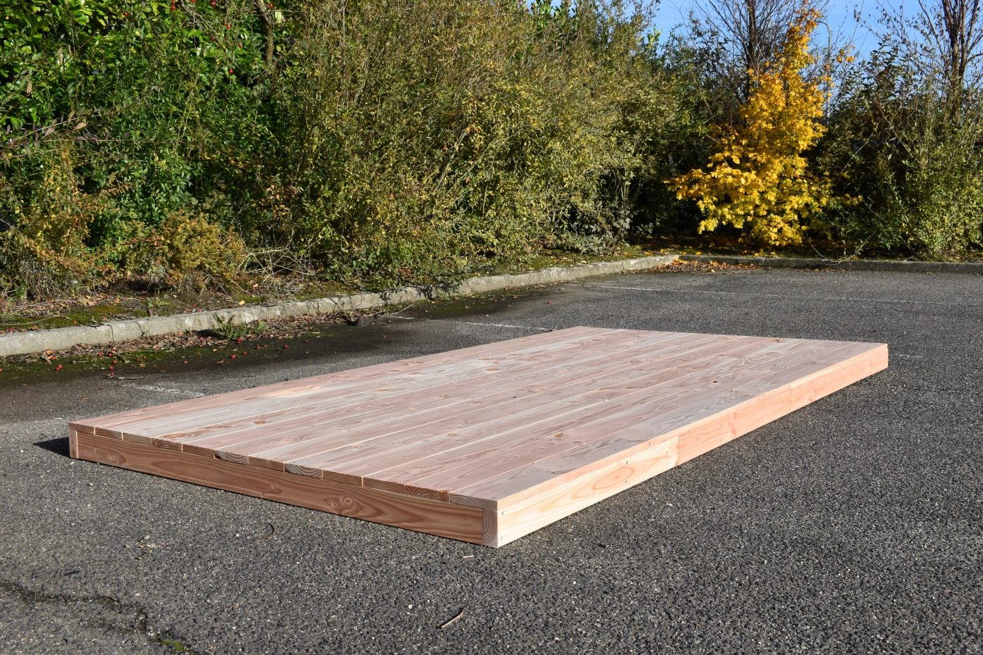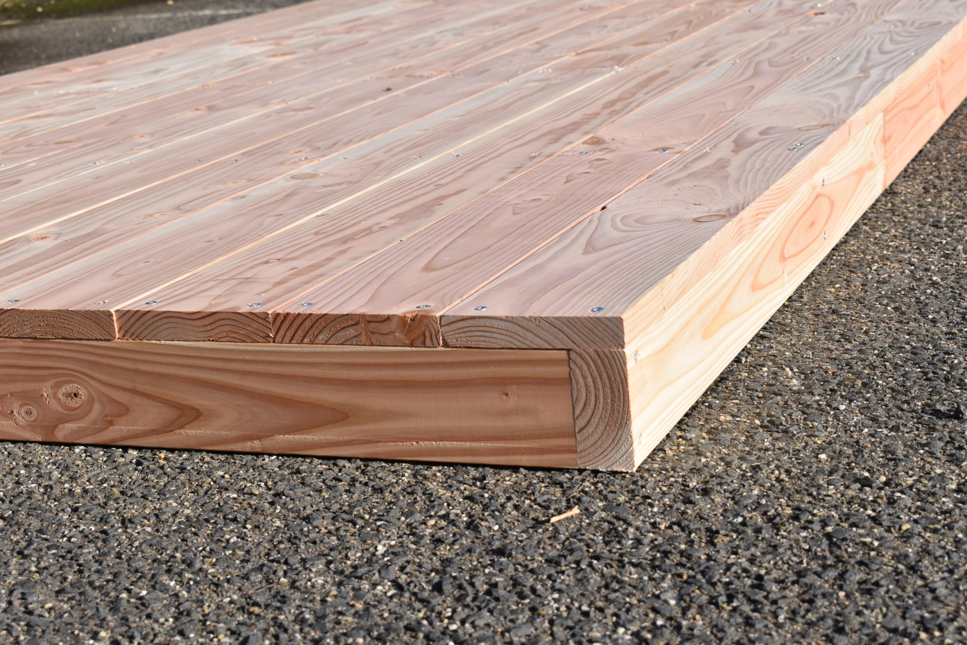 Die Bodenhöhe beträgt ca. 12 cm. Der Rahmen besteht aus Balken von 44x89 mm, die Dielen sind ca. 27x145 mm groß.