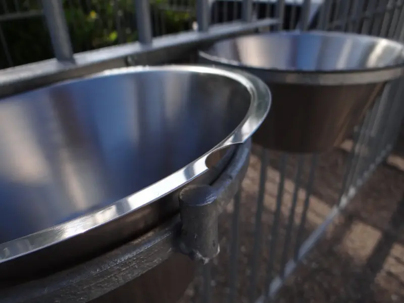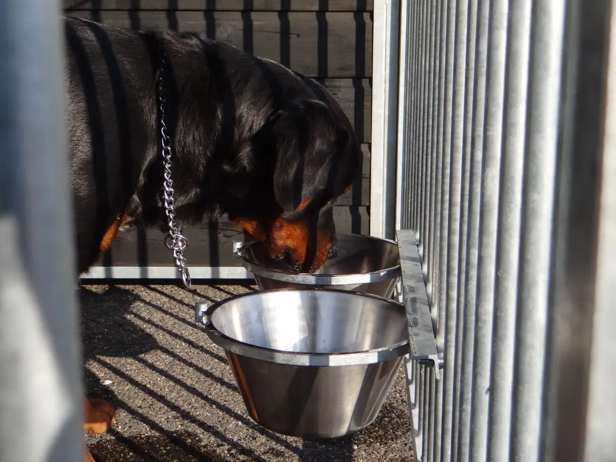 Fress-/Trinknapf zum Einhängen in den Zwinger. Dieser Futternapf aus Edelstahl hat 2 Schüsseln mit einem Fassungsvermögen von 4 Litern.