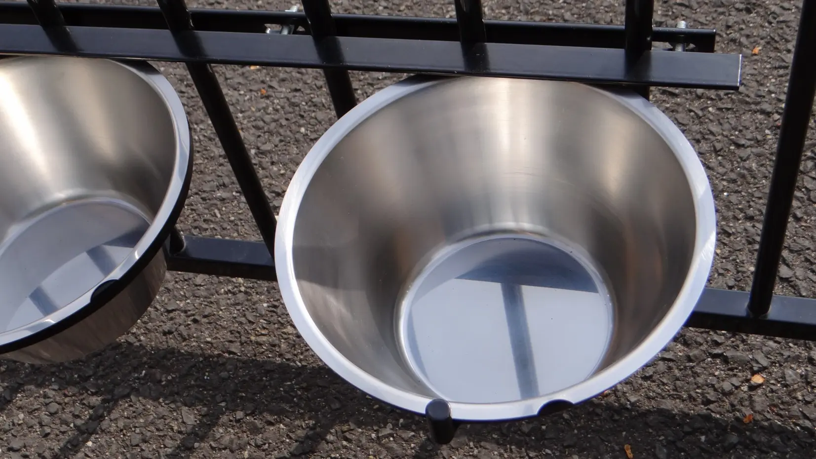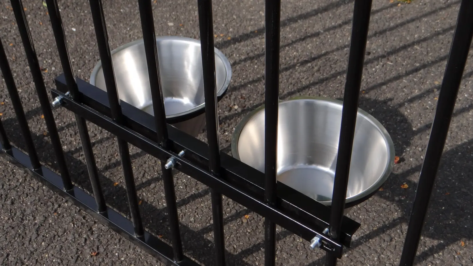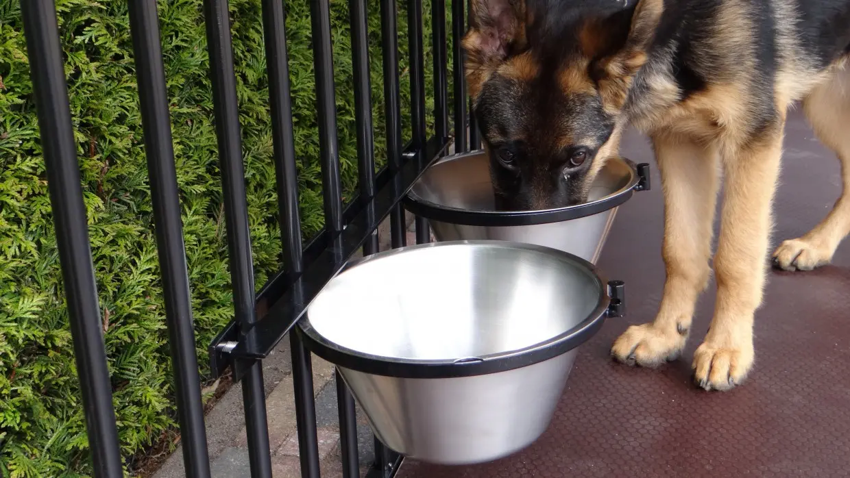 Fress-/Trinknapf (schwarz beschichtet) zum Einhängen in den Zwinger. Dieser Futternapf aus Edelstahl hat 2 Schüsseln mit einem Fassungsvermögen von 4 Litern und eine einfache Befestigung, damit Ihr Hund den Napf nicht herausschieben kann.