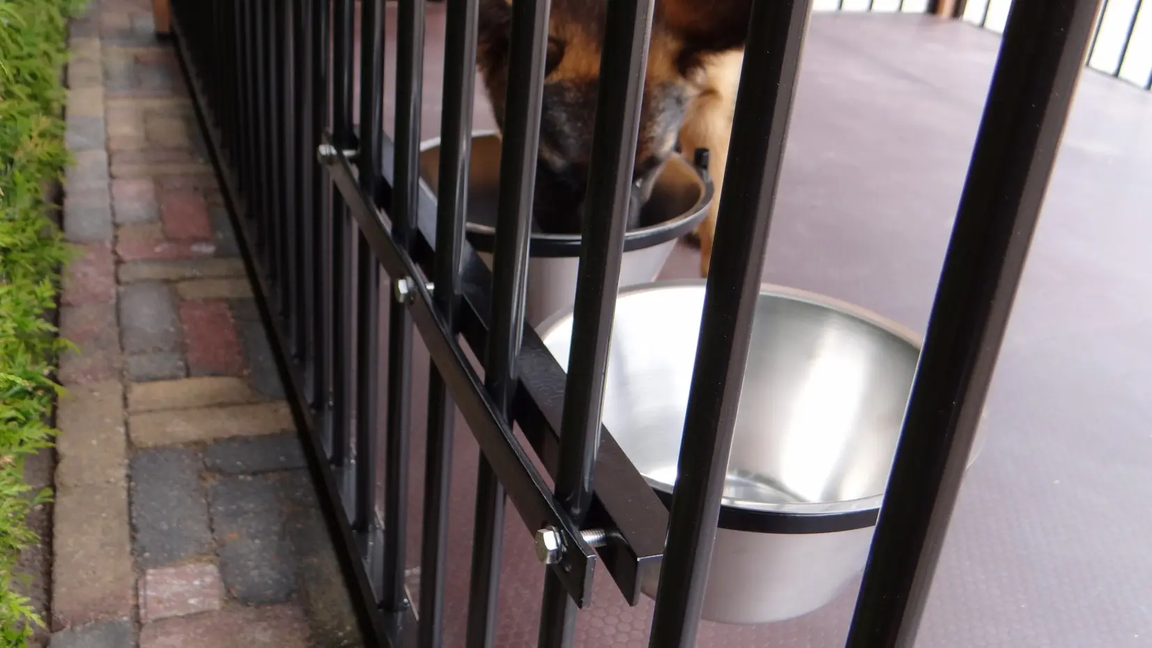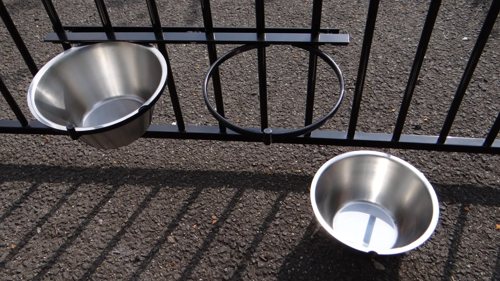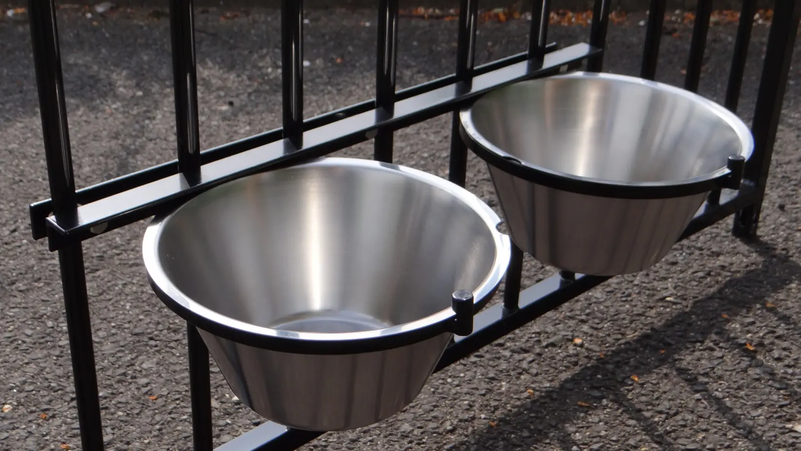 Fress-/Trinknapf (schwarz beschichtet) zum Einhängen in den Zwinger. Dieser Futternapf aus Edelstahl hat 2 Schüsseln mit einem Fassungsvermögen von 4 Litern und eine einfache Befestigung, damit Ihr Hund den Napf nicht herausschieben kann.