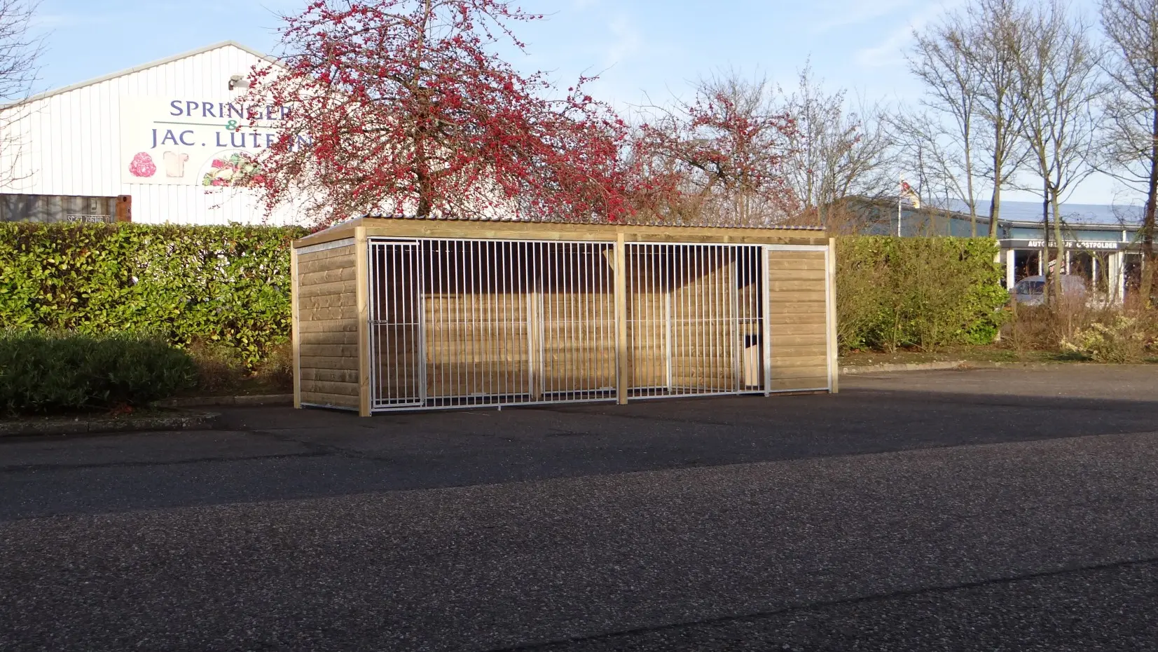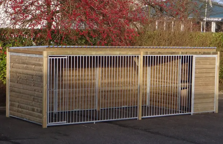 Robuster Hundezwinger von 6x2 Metern mit isolierter Schlafhütte und Dach. Die imprägnierten Holzrahmen sorgen für eine stabile und solide Konstruktion. Das Stahldach ist durch eine Filzschicht schalldämmend. Außerdem ist der Zwinger mit der isolierten Easy-Hundehütte ausgestattet, die optimalen Schutz vor Zugluft und Kälte bietet. Die Schlafhütte ist mit einer Plattform aus Beton-Multiplex verlängert und an der Kante mit einer Anti-Beiß-Leiste versehen. Kurz gesagt: ein schöner und langlebiger Zwinger, in dem Ihre Hunde das ganze Jahr über untergebracht werden können.