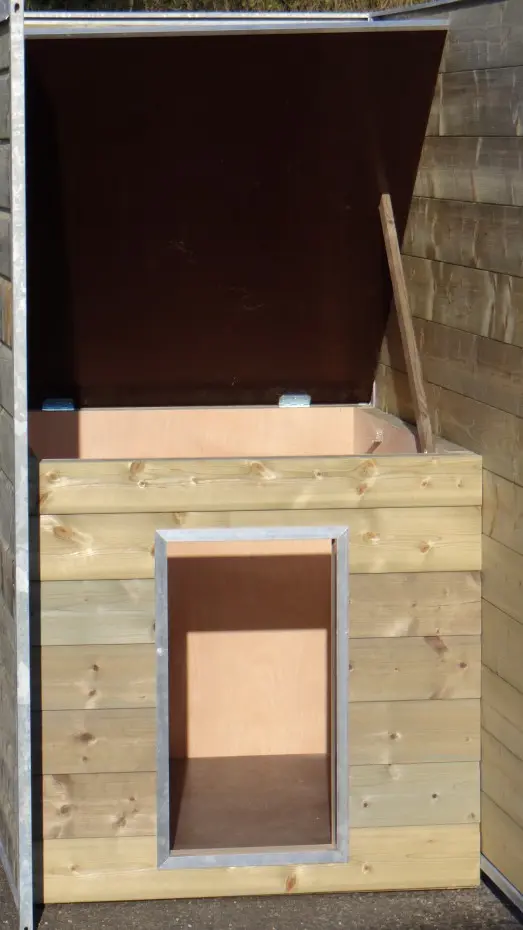 Robuster Hundezwinger von über 4x2 Metern mit isolierter Schlafhütte und Dach. Die Stahlrahmen sorgen für Stabilität und optimalen Schutz des Holzes. Das Holz ist gegen Fäulnis imprägniert. Das Dach besteht aus Stahl. Die eingebaute Easy-Hundehütte bietet hervorragenden Schutz vor Zugluft und Kälte. Die Schlafhütte ist mit einer Plattform aus Beton-Multiplex verlängert und mit einer Anti-Beiß-Leiste an der Kante versehen.
