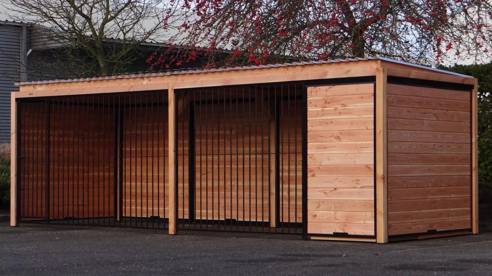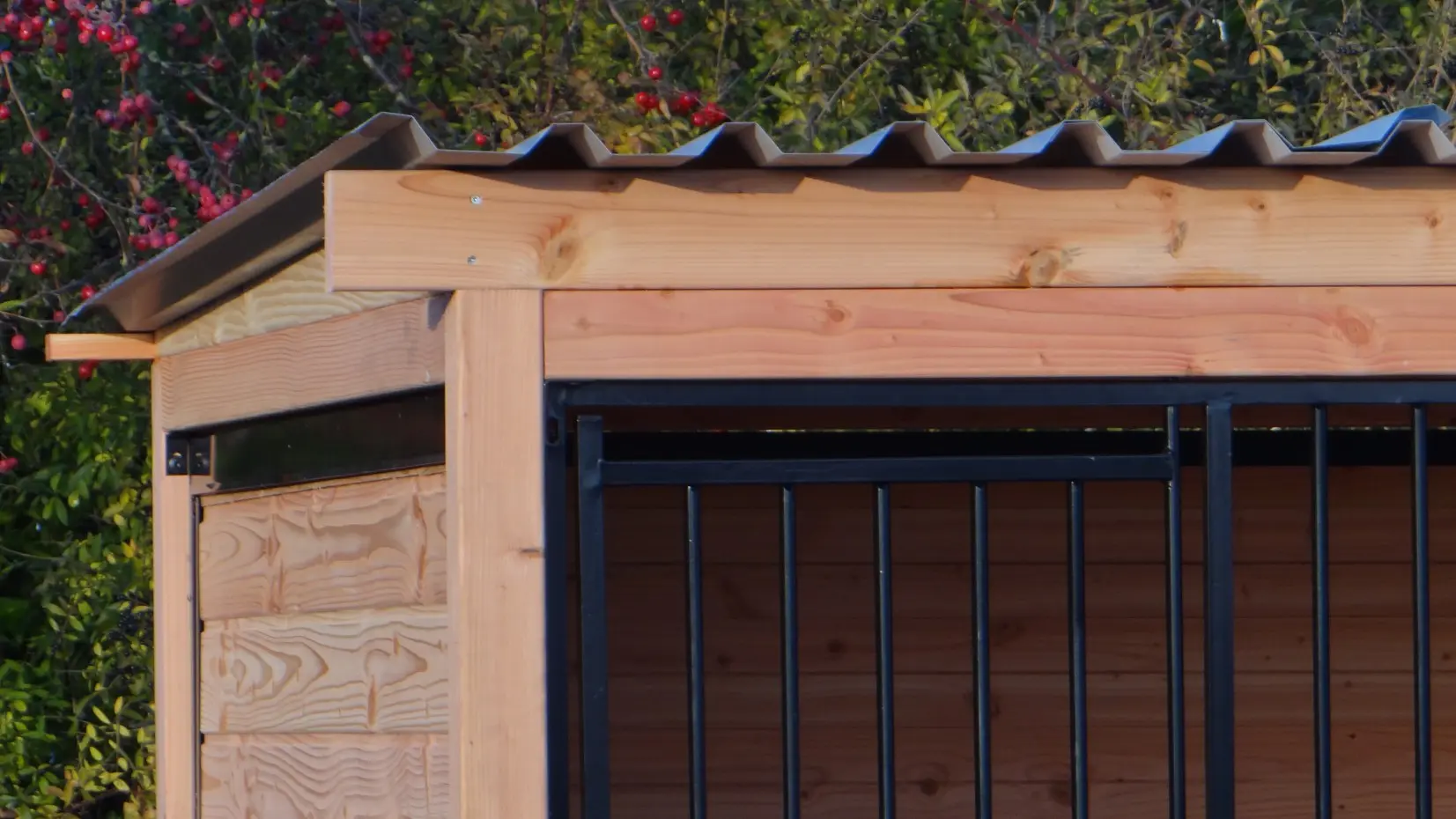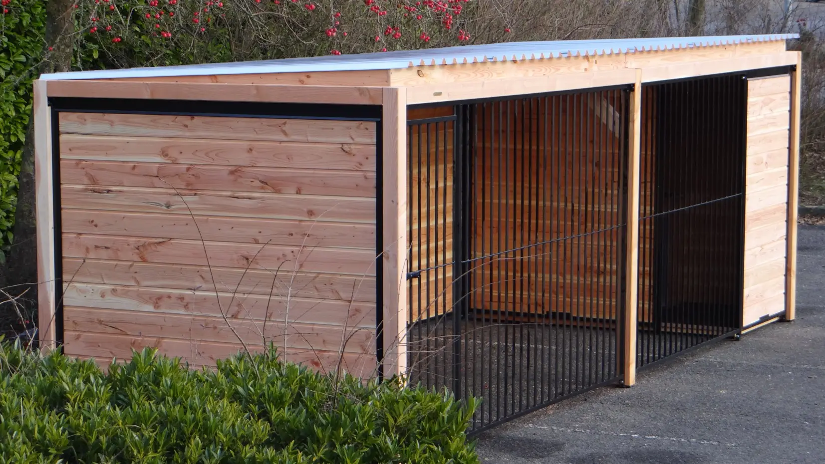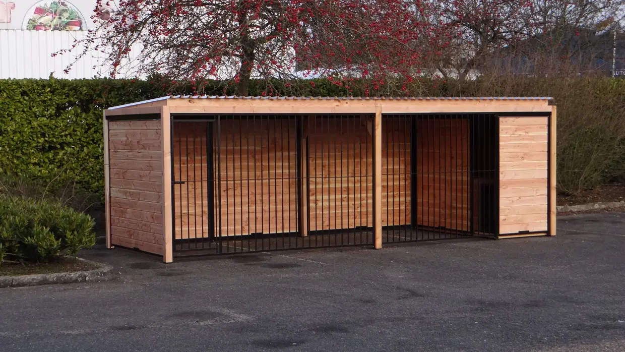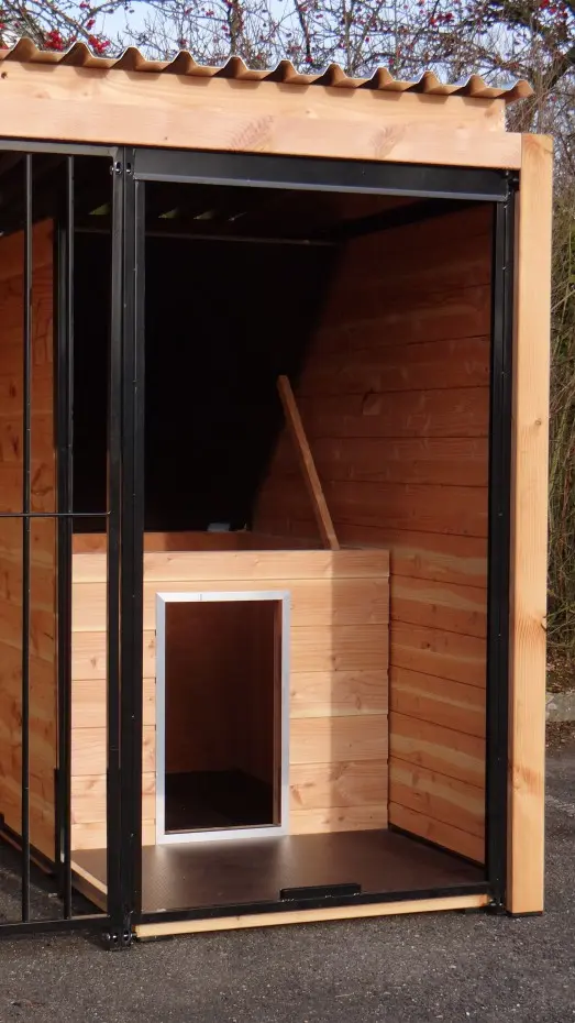 Die eleganten Douglas-Holzwände und die schwarz beschichteten Gitterelemente mit Douglas-Holzrahmen bilden zusammen einen beeindruckenden Hundezwinger. Der Zwinger ist mit Stahl-Dachplatten ausgestattet, sodass Ihr Hund rundum optimal vor Witterungseinflüssen geschützt ist. Alle geschlossenen Wände bestehen aus Stahlrahmen, die mit Douglas-Holz gefüllt sind.