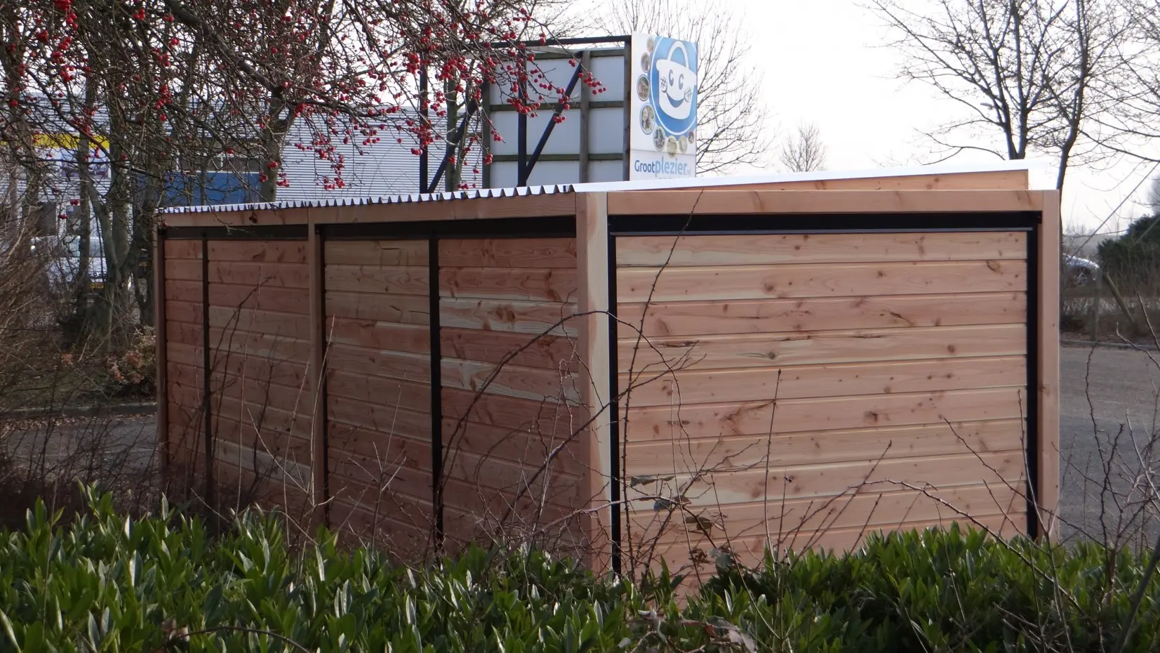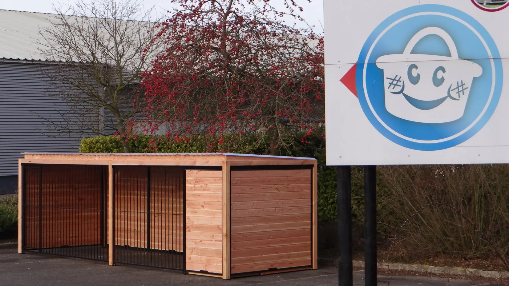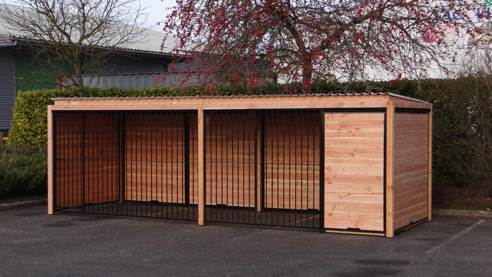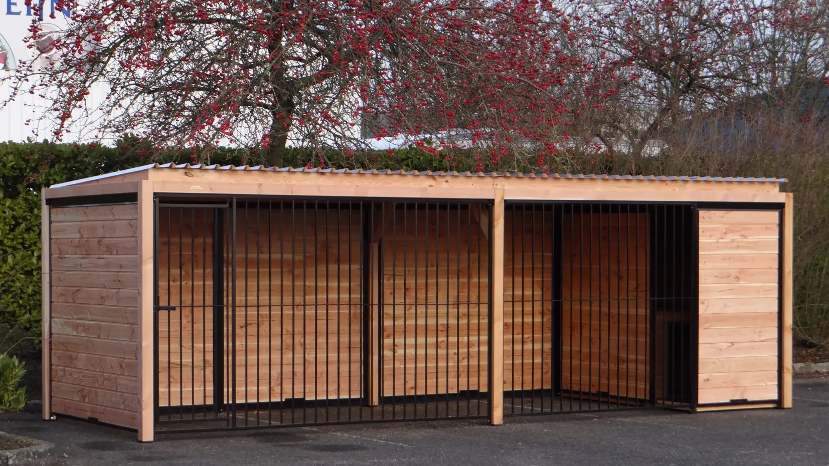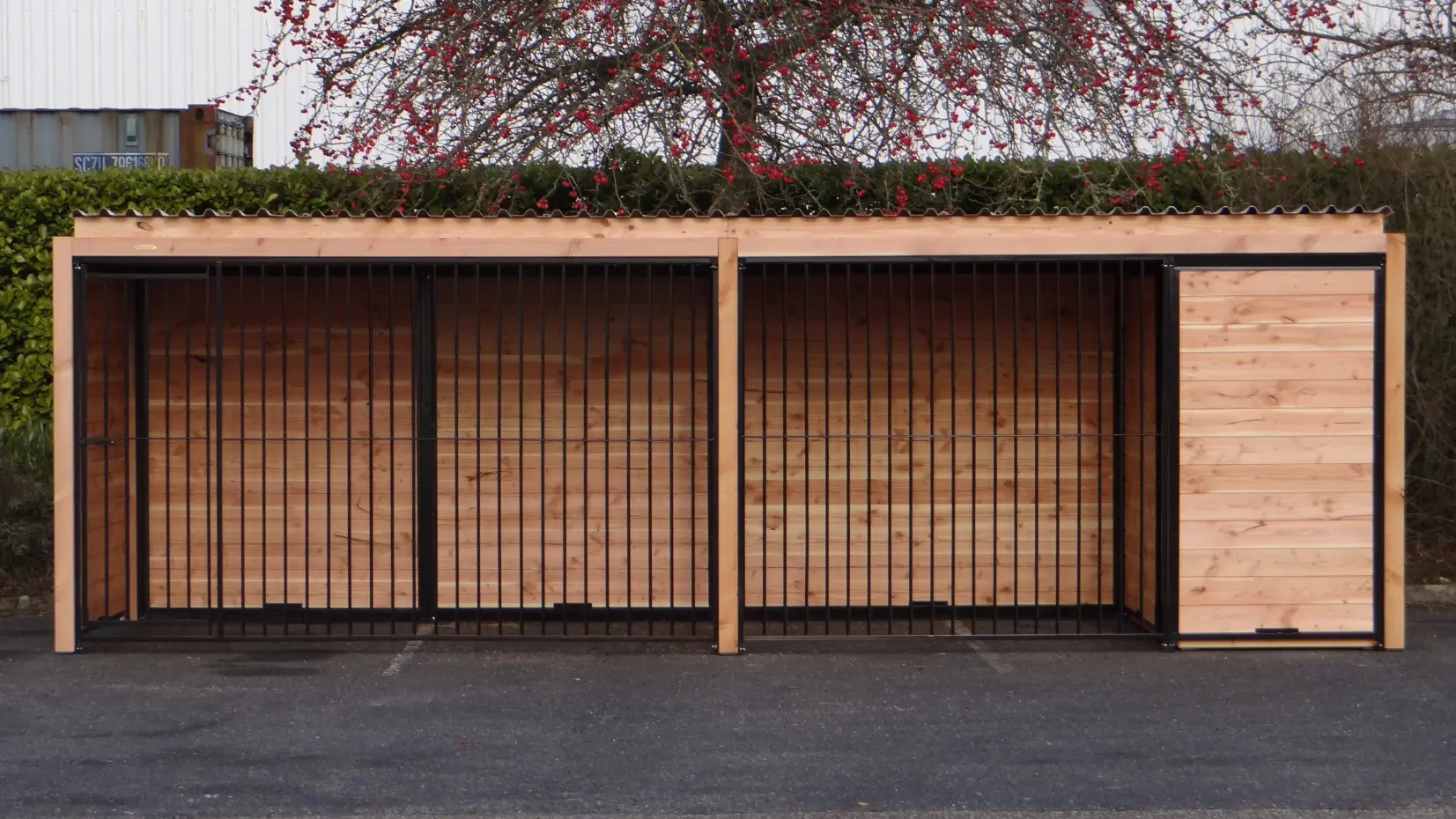 Die eleganten Douglas-Holzwände und die schwarz beschichteten Gitterelemente mit Douglas-Holzrahmen bilden zusammen einen beeindruckenden Hundezwinger. Der Zwinger ist mit Stahl-Dachplatten ausgestattet, sodass Ihr Hund rundum optimal vor Witterungseinflüssen geschützt ist. Alle geschlossenen Wände bestehen aus Stahlrahmen, die mit Douglas-Holz gefüllt sind.