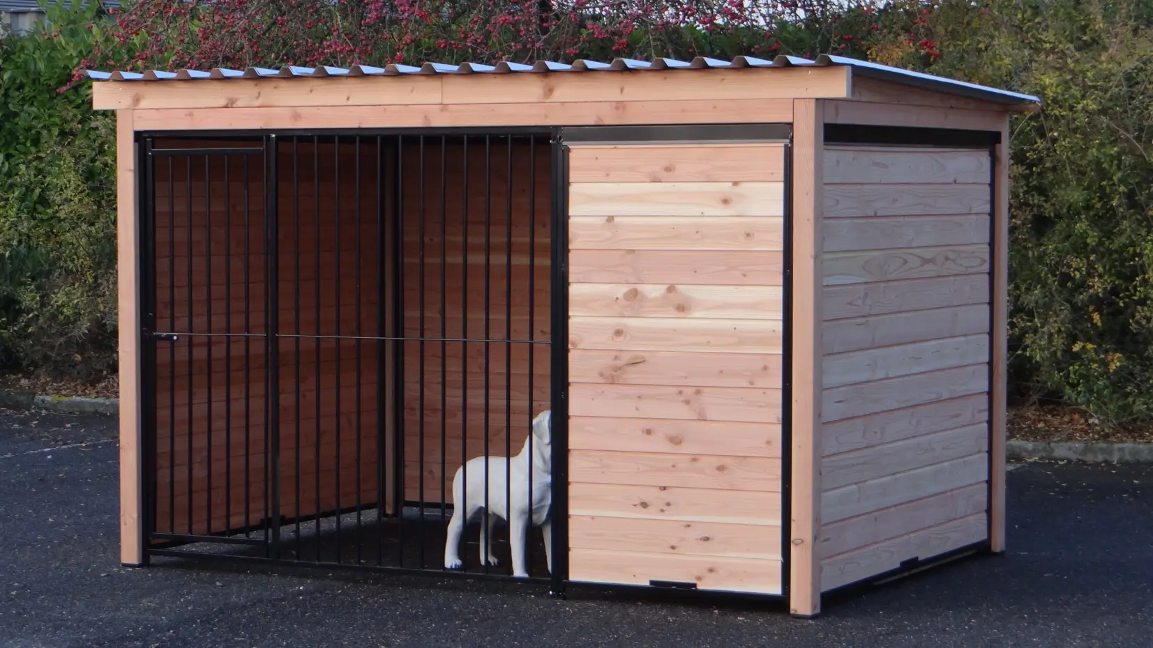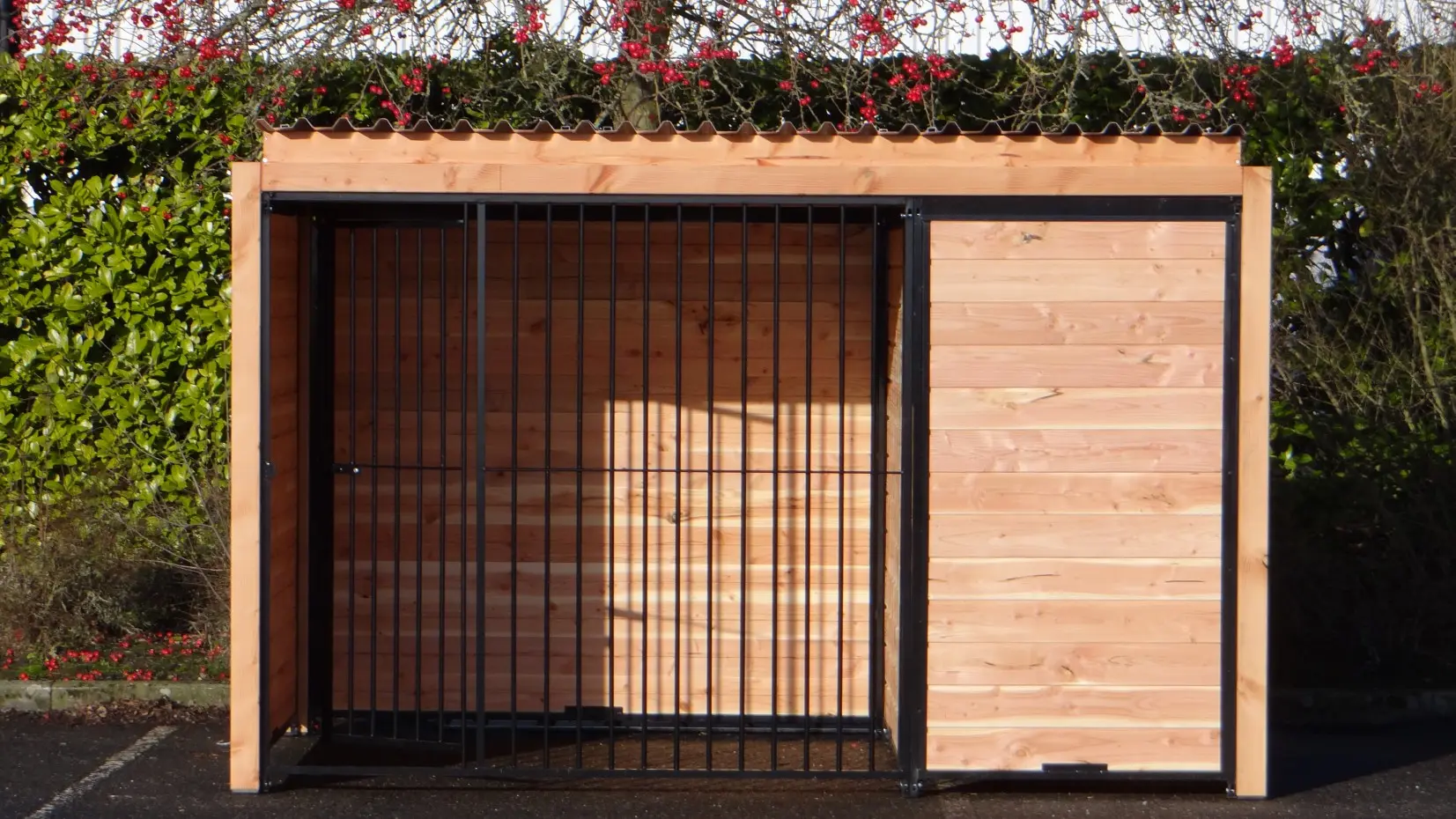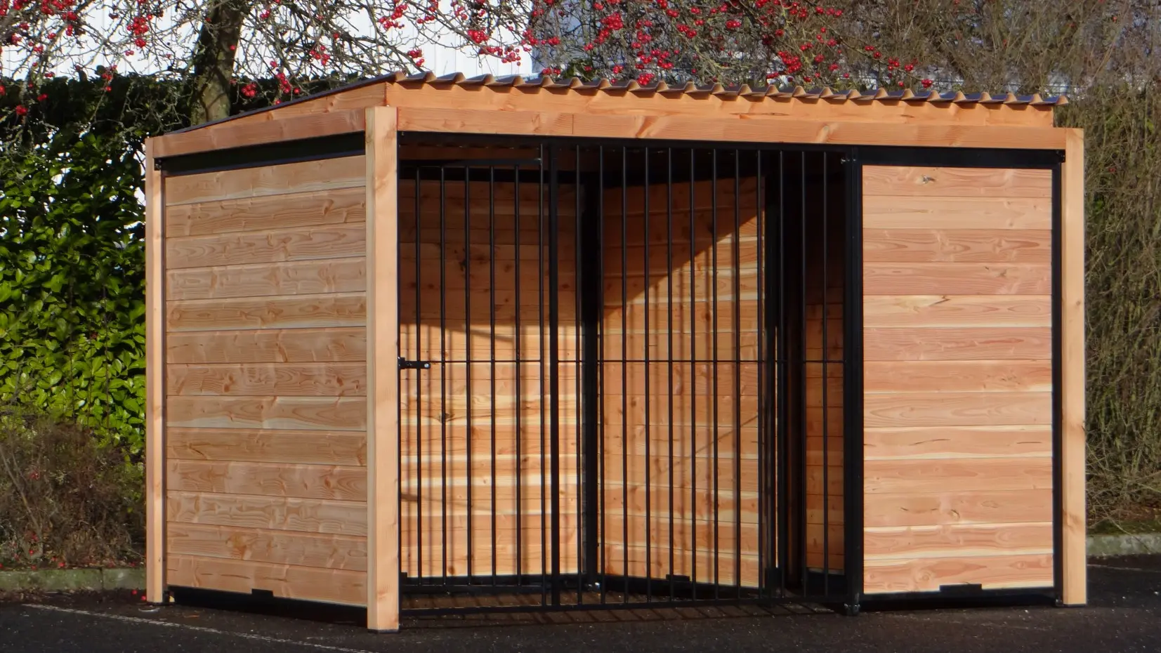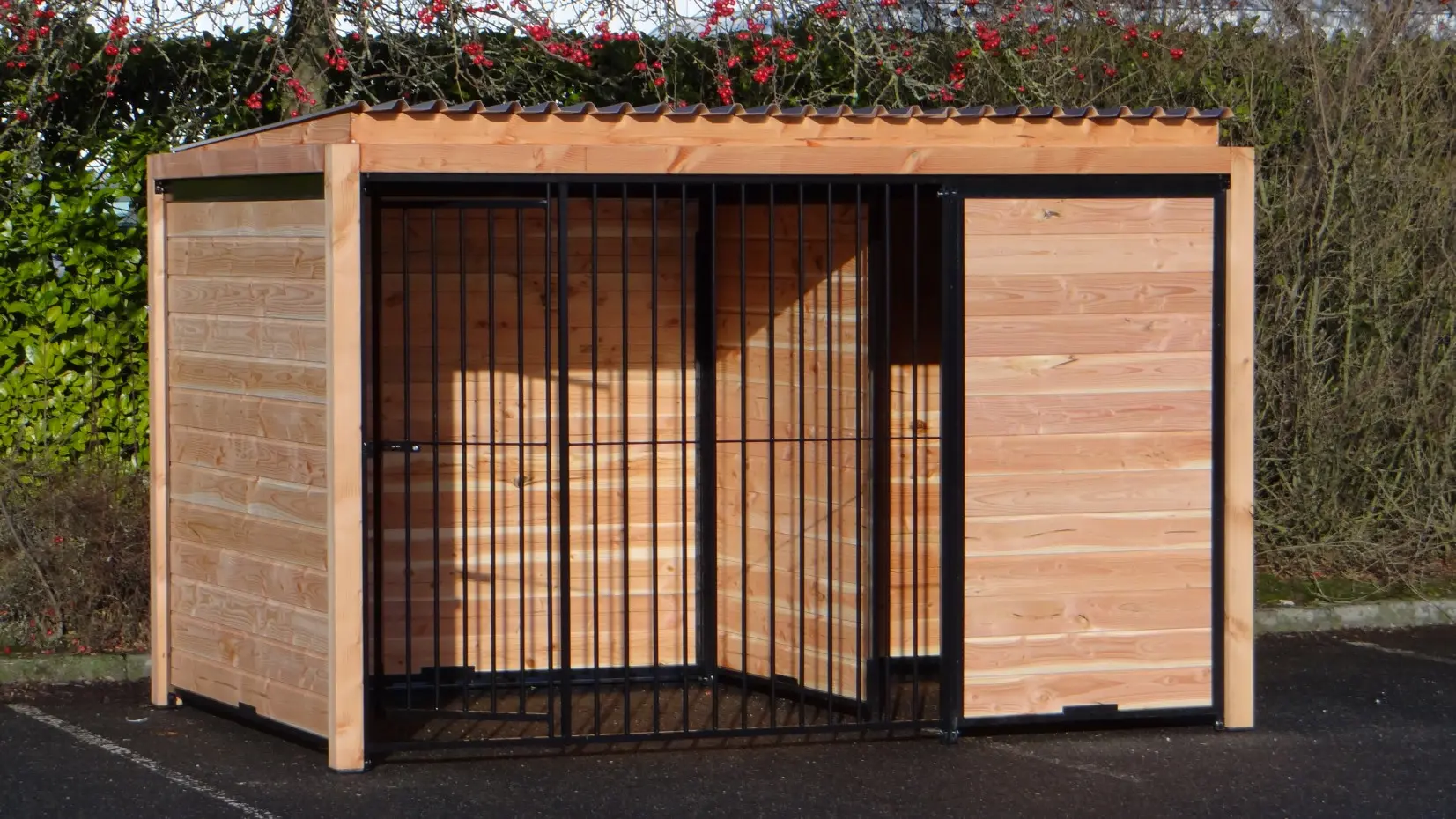 Der schwarze Hundezwinger Forz mit Dach und Douglas-Holzrahmen ist eine wunderschöne Zwingeranlage mit rundum optimalem Schutz für Ihren Hund. Alle Wände bestehen aus Stahlrahmen, die mit Douglas-Holz gefüllt sind. Hinter der Trennwand kann problemlos ein Hundehaus, wie zum Beispiel das Hundehaus Easy, aufgestellt werden, oder Sie können dort eine Holzterrasse platzieren, damit Ihr Hund einen geschützten Platz hat.