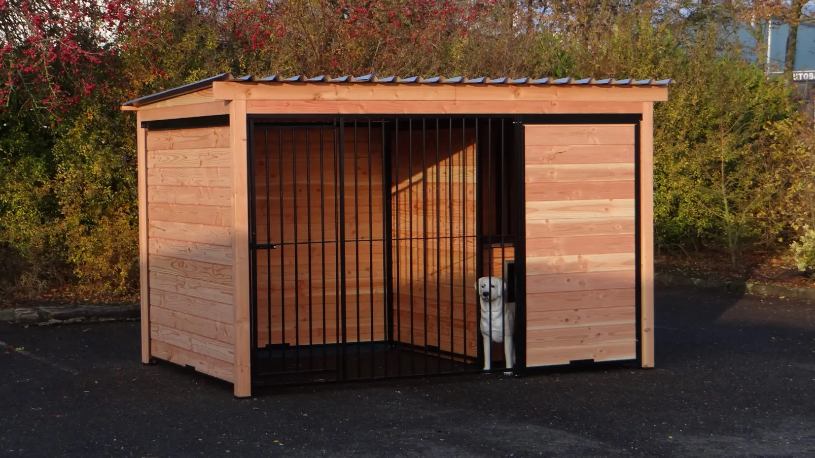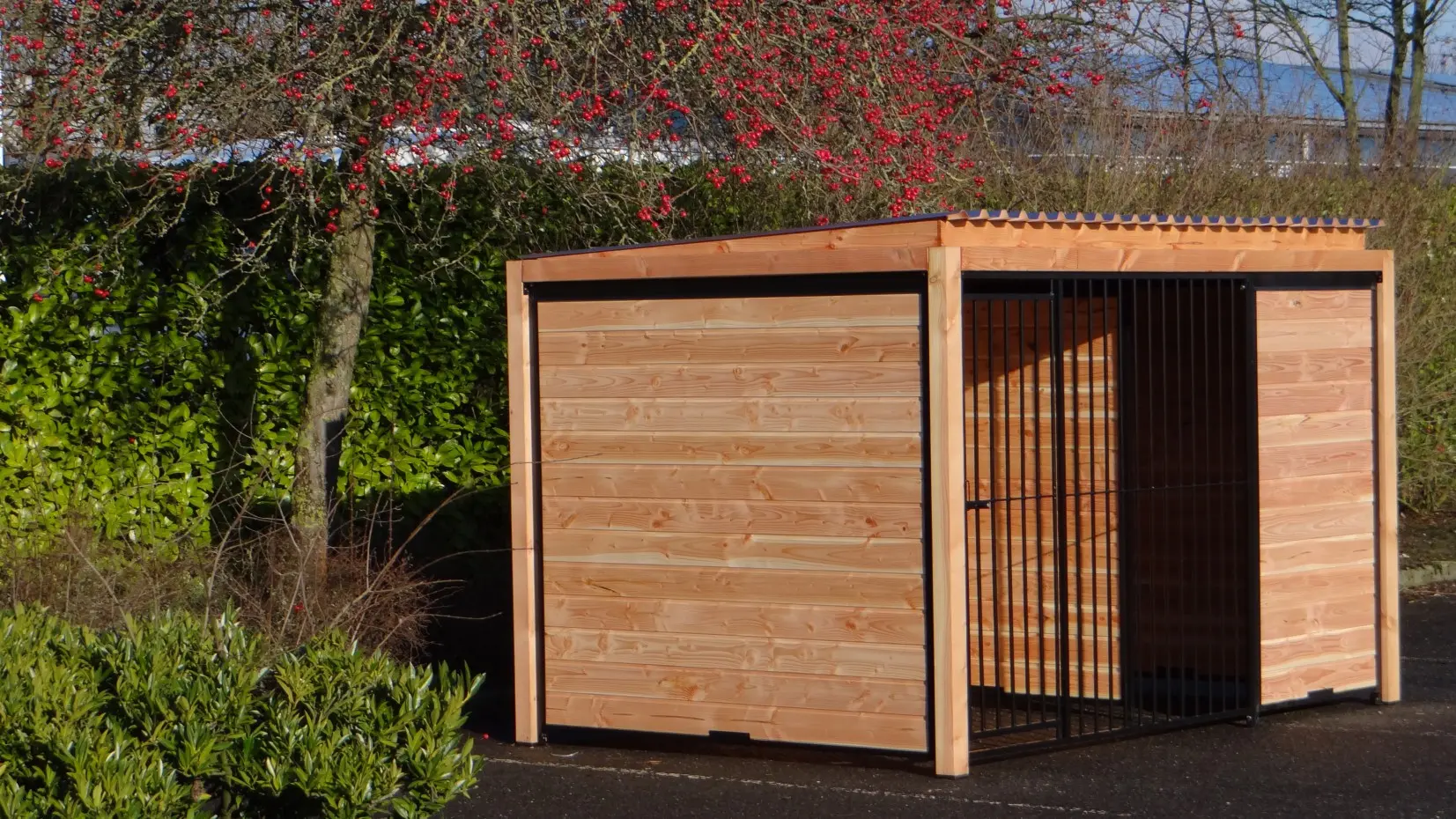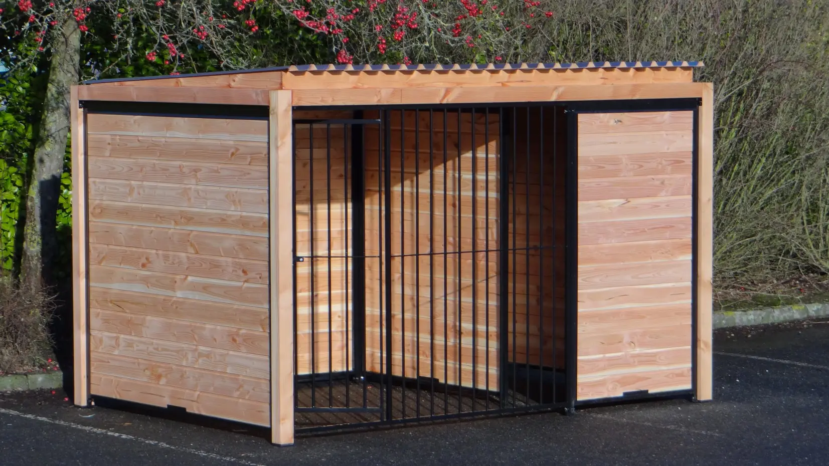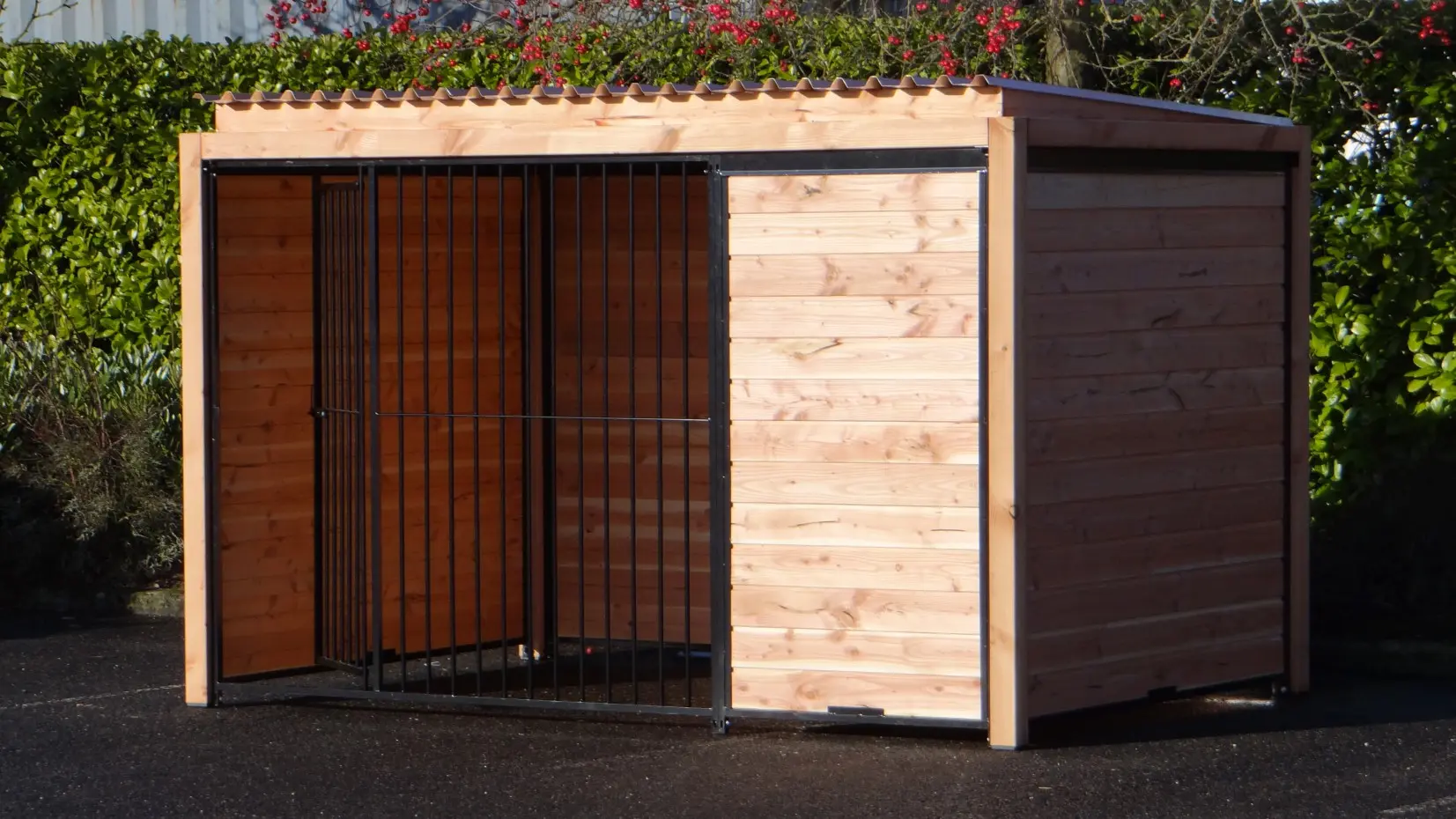 Der schwarze Hundezwinger Forz mit Dach und Douglas-Holzrahmen ist eine wunderschöne Zwingeranlage mit rundum optimalem Schutz für Ihren Hund. Alle Wände bestehen aus Stahlrahmen, die mit Douglas-Holz gefüllt sind. Hinter der Trennwand kann problemlos ein Hundehaus, wie zum Beispiel das Hundehaus Easy, aufgestellt werden, oder Sie können dort eine Holzterrasse platzieren, damit Ihr Hund einen geschützten Platz hat.