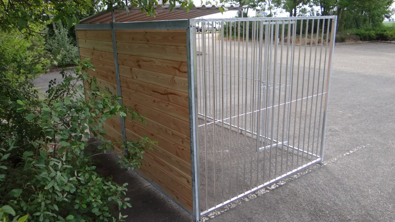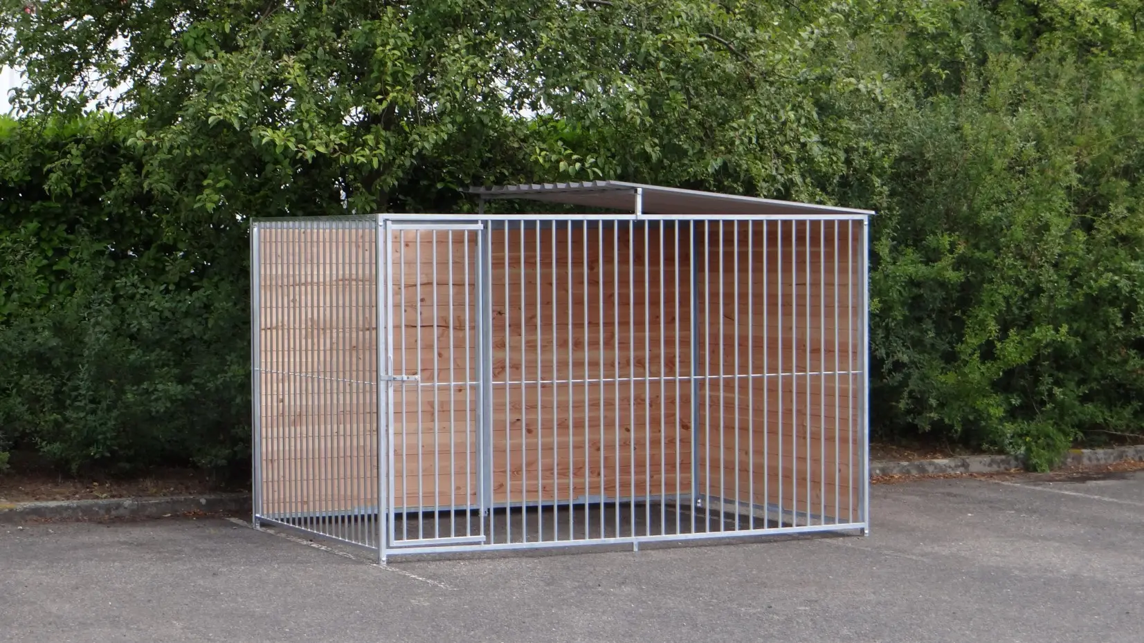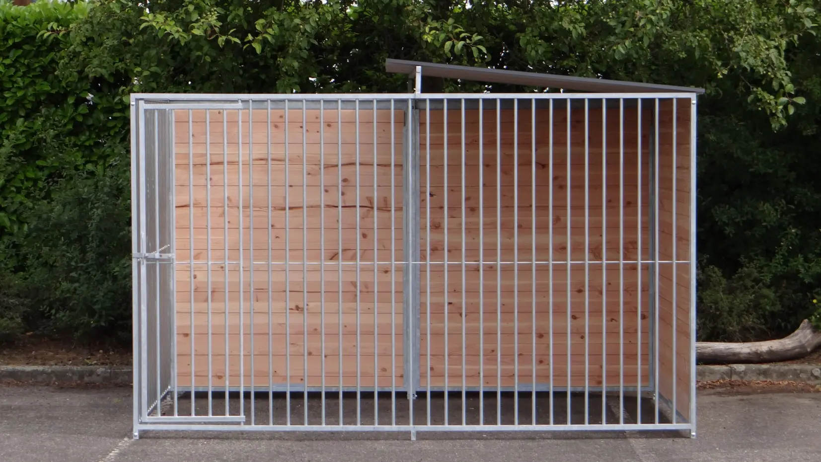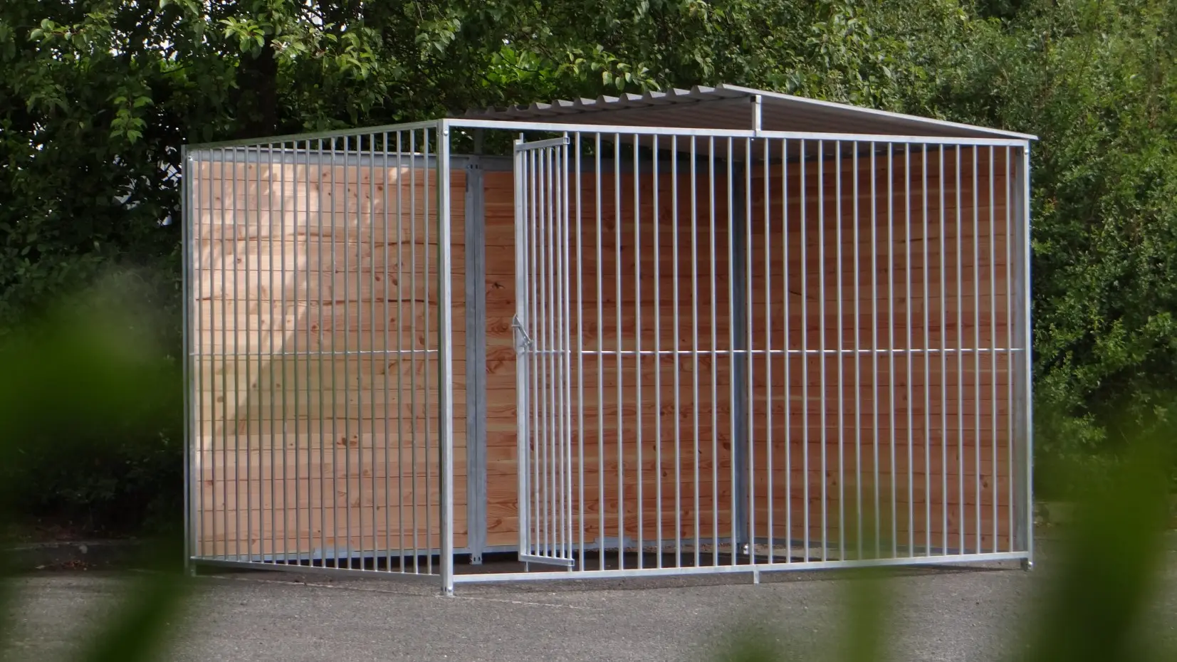 Der Zwinger von 3x2m ist versehen mit 2 geschlossenen Wände und 2 Gitterplatten von welchen 1 mit Türöffnung für eine optimale Zugang. Da durch bekommt Ihr Hund eine geschützte Ecke wo er liegen kann, oder wo seine Hundehütte stehen kan.