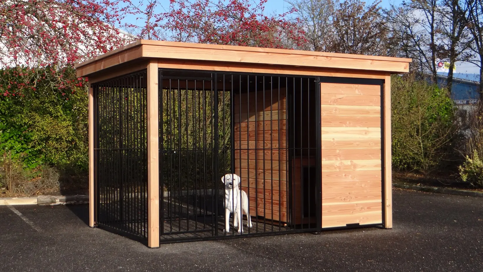 Der Hundezwinger Fix schwarz mit Dach und einem Douglasienholz Rahmen ist einen sehr schönen Hundezwinger. Der Zwinger schützt Ihren Hund durch das Dach gegen u.a. Regen. Hinter den Windfang können Sie zum Beispiel eine Hundehütte mit einem Plattform platzieren. Hundezwinger FIX ist aus Stock verfügbar in viele Grossen. Douglasienholz kann unbehandelt draussen benützt werden, aber wird später grau wenn Sie es nicht lasieren met einem Lasur oder Douglasien-öl.