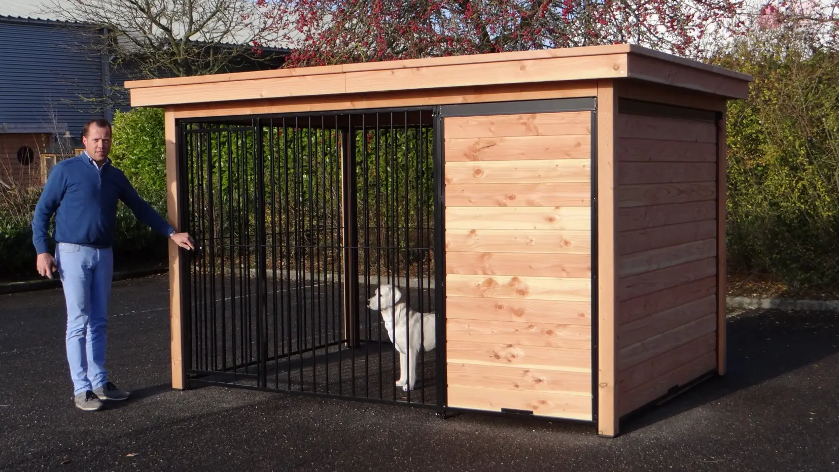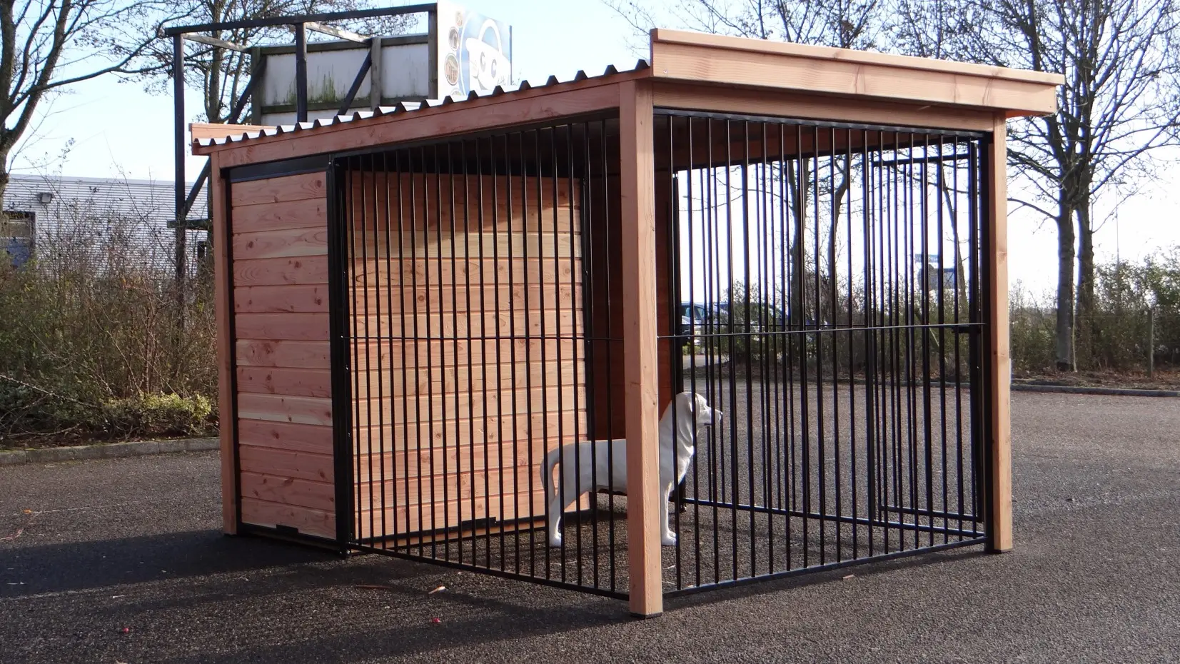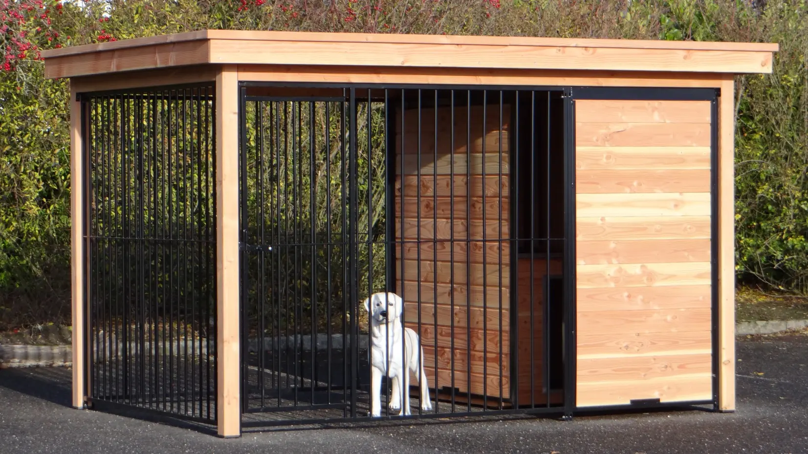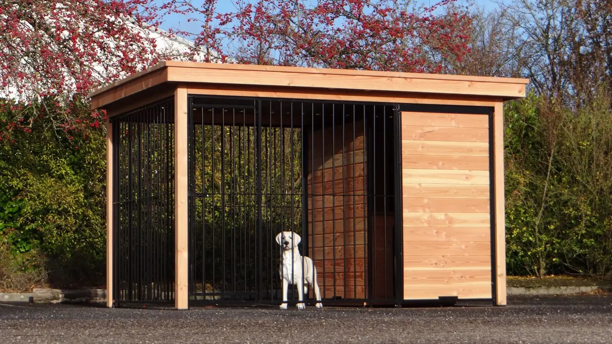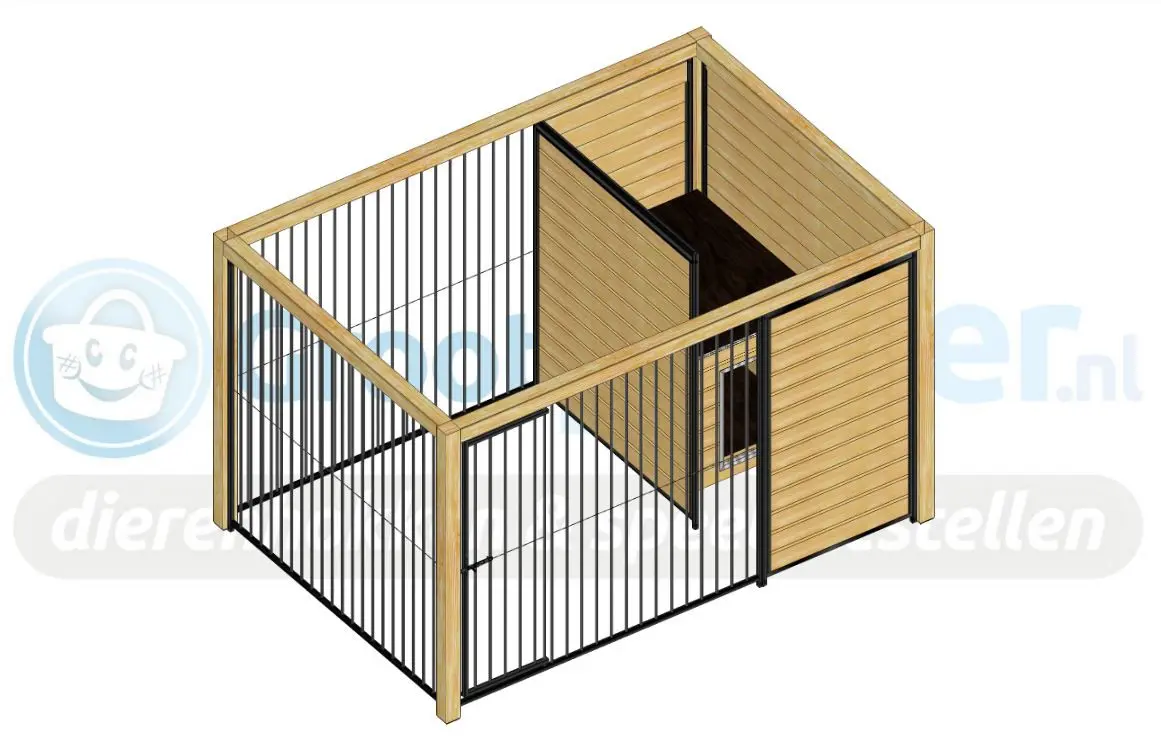 Hundezwinger Fix hat ein geschützes Teil und ein geöffnetes Auslauf. Im Teil aus Holz steht eine isolierte Hundehütte Easy. Dadurch kann Ihr Hund immer draussen bleiben. Ihr Hund kann die Umgebung gut sehen. Der ganzer Zwinger ist versehen mit einem Luxusdach.