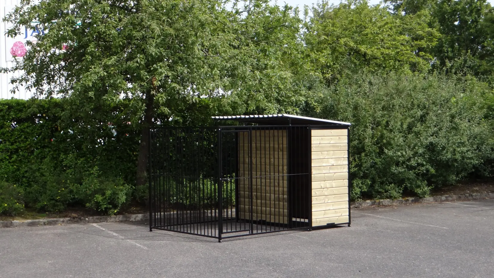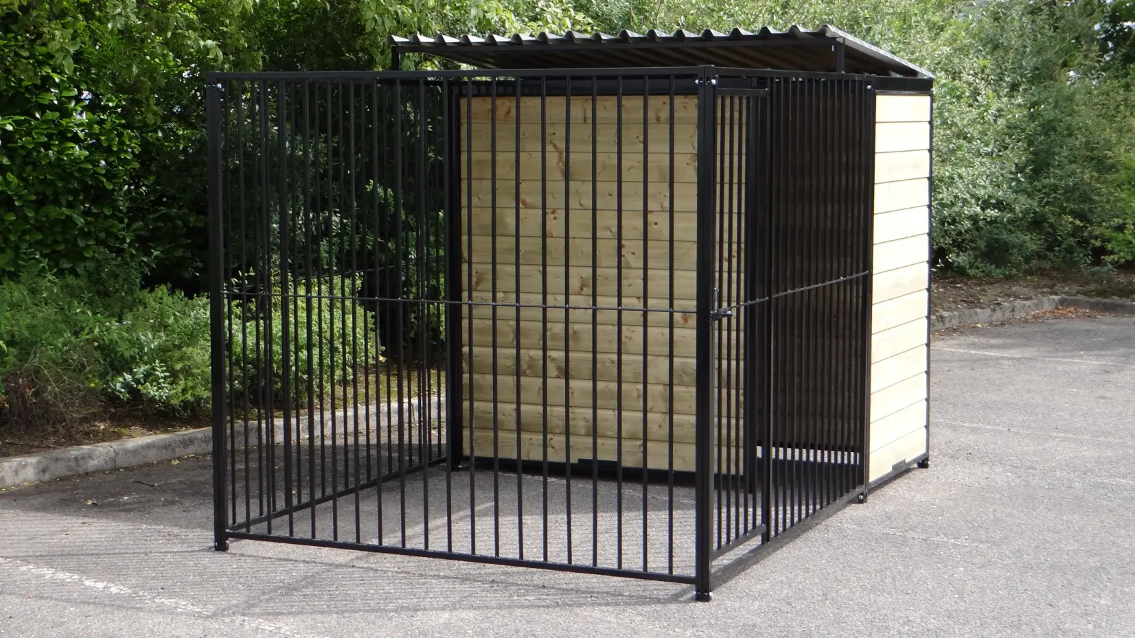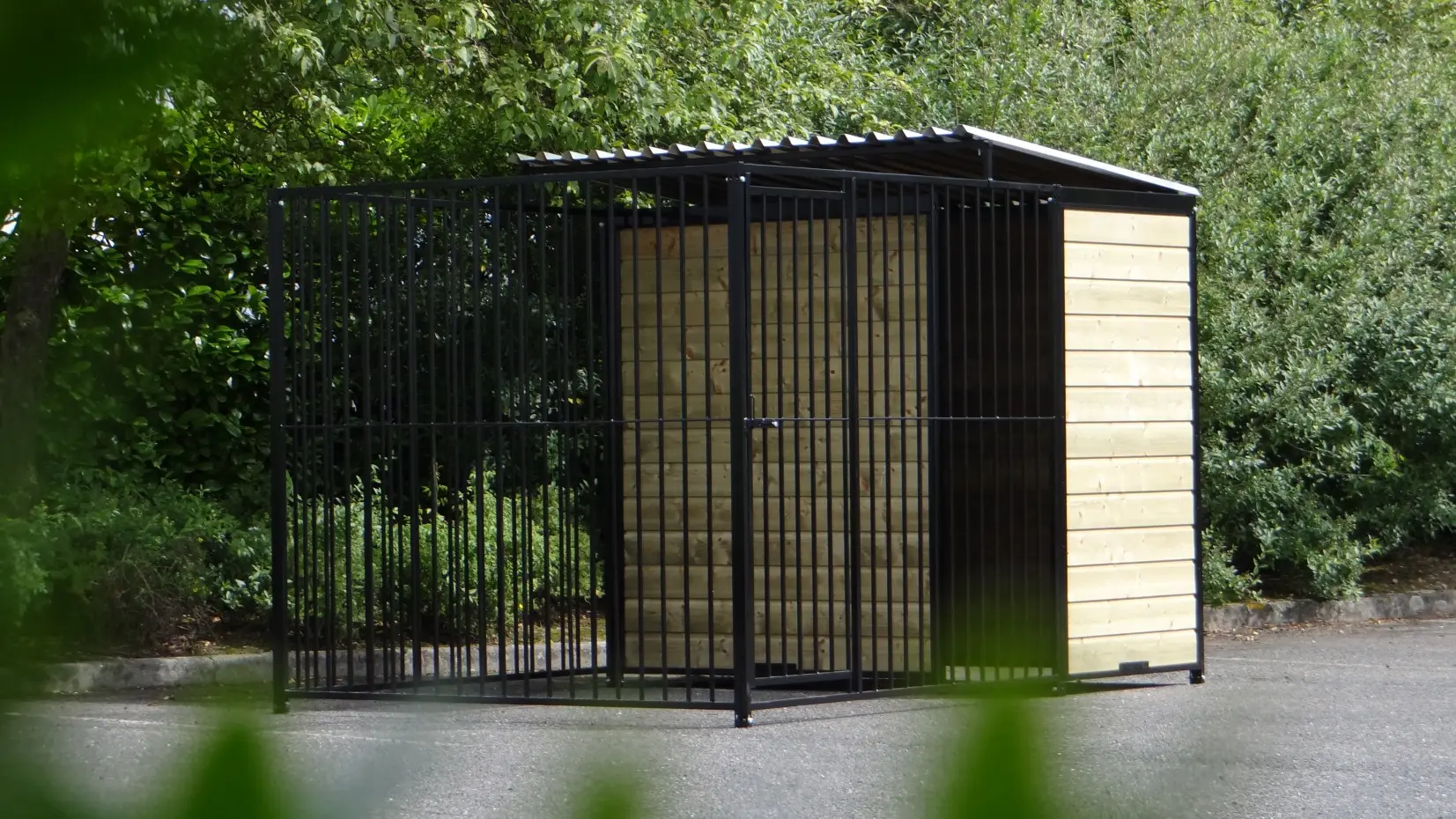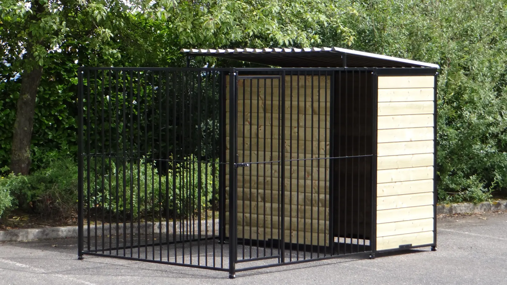 Der starker, schwarzer Hundezwinger ist ein schöner Hundekäfig für Ihren Hund. Versehen mit einem halben Dach und Holzseiten. Der Hundezwinger ist 3 x 2 meter und der Zwinger hat einen Windfang für eine optimale Protektion für Ihren Hund.