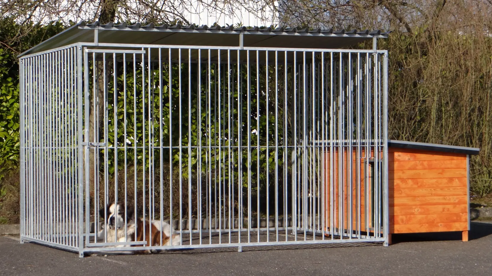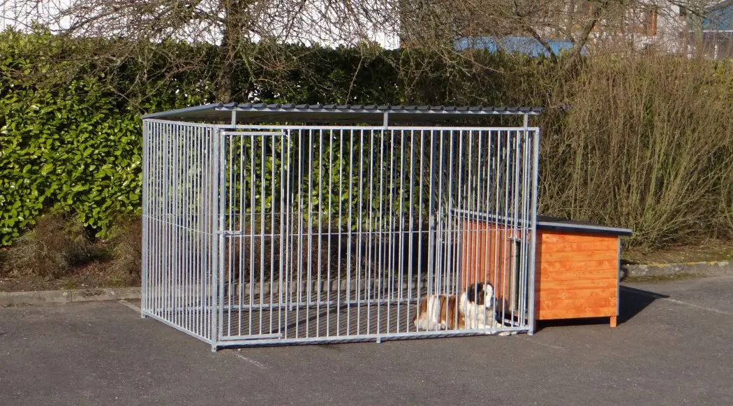 Schwerer und verzinkter Hundezwinger mit Dach und isolierter Hundehütte Base Large. Da sich die Hundehütte außer den Zwinger befindet, behalten Sie allen Platz für Ihren Hund. Die Hundehütte hat eine Größe von 159x107 cm.