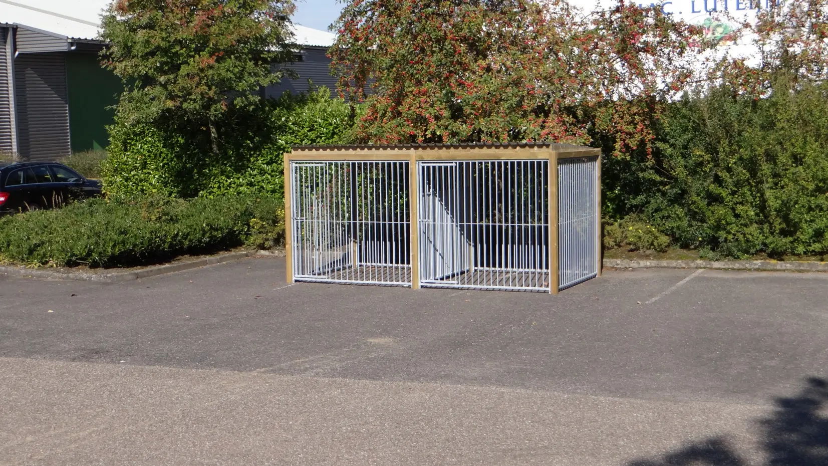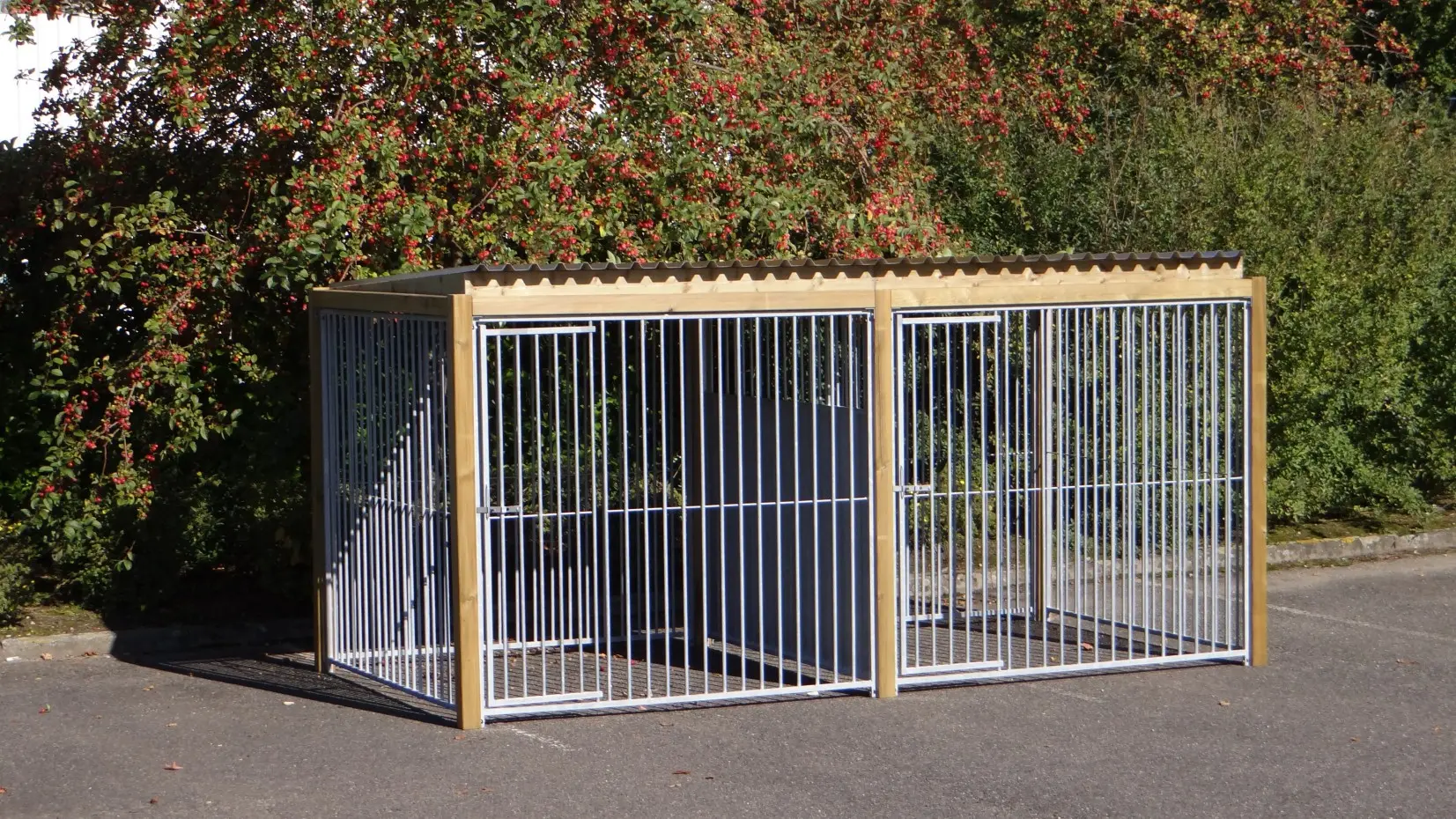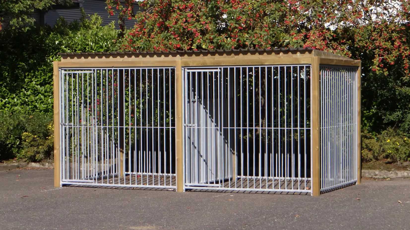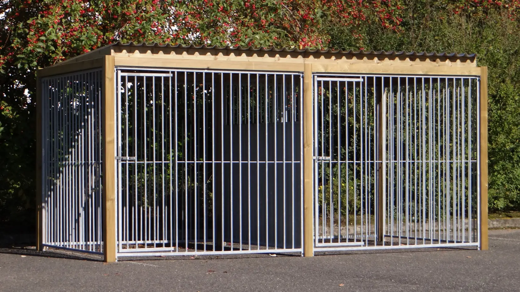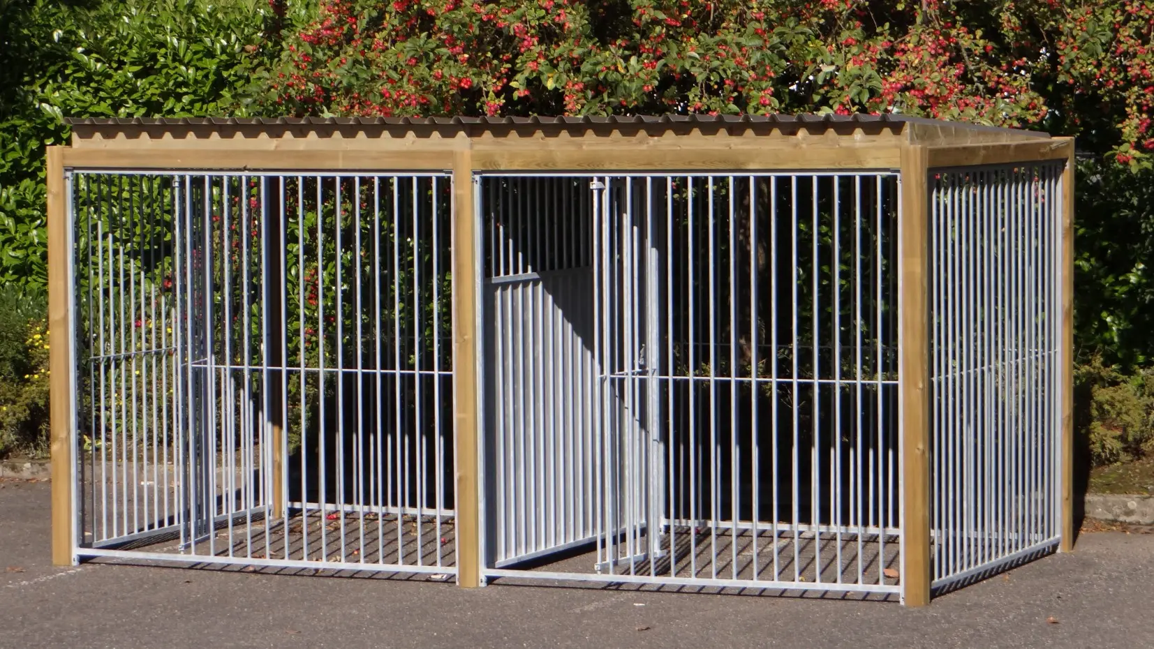 - * Der Zwinger ist mit einem luxuriöseren Dachsystem ausgestattet, so dass vorne und an den Seiten ein Überhang entsteht.