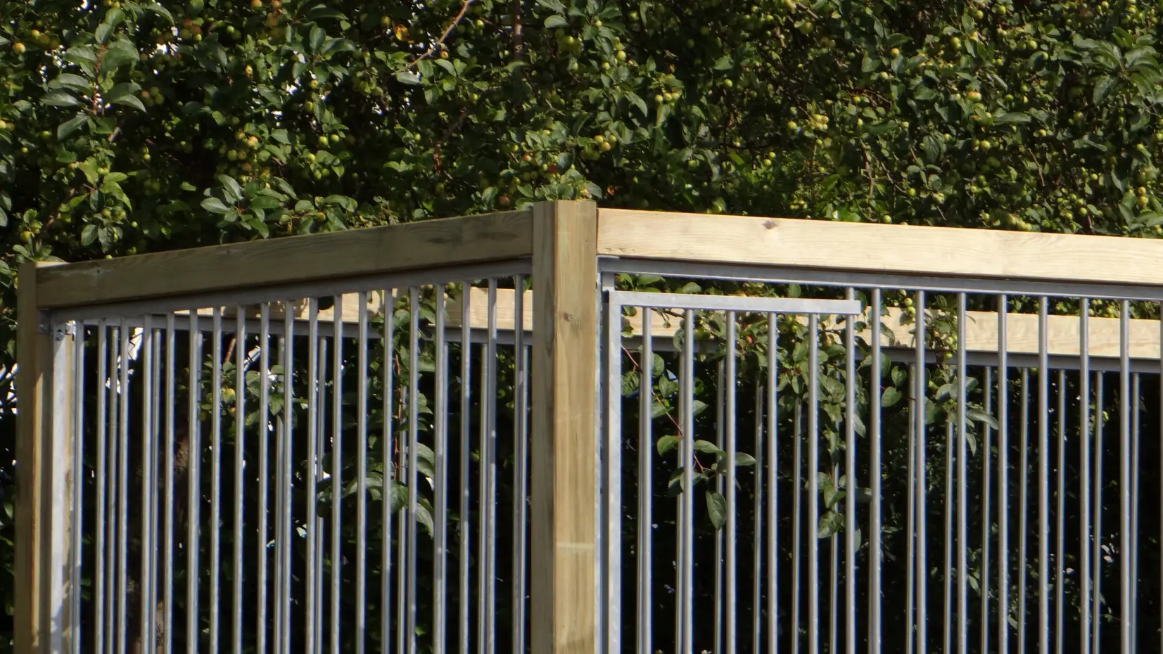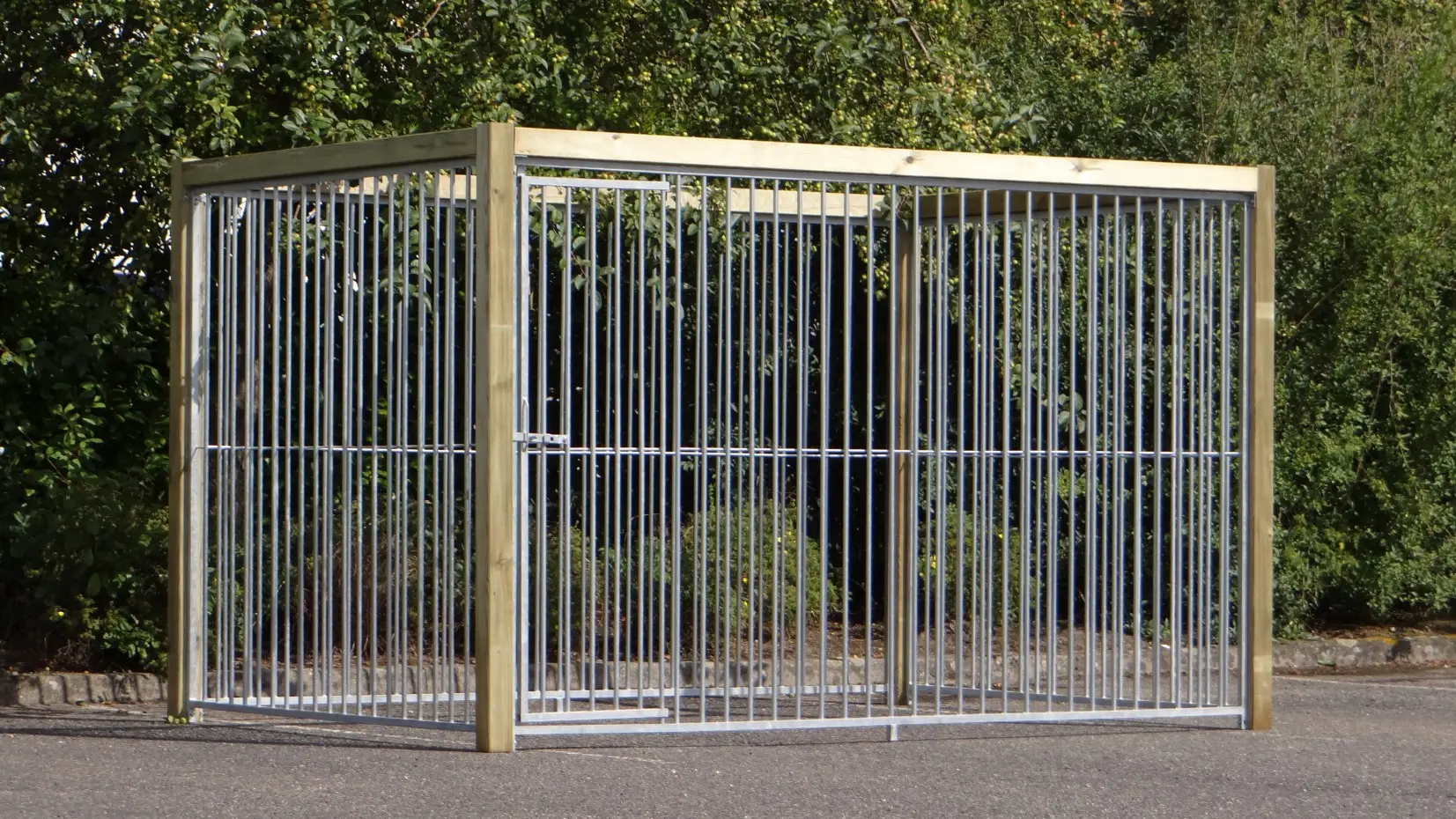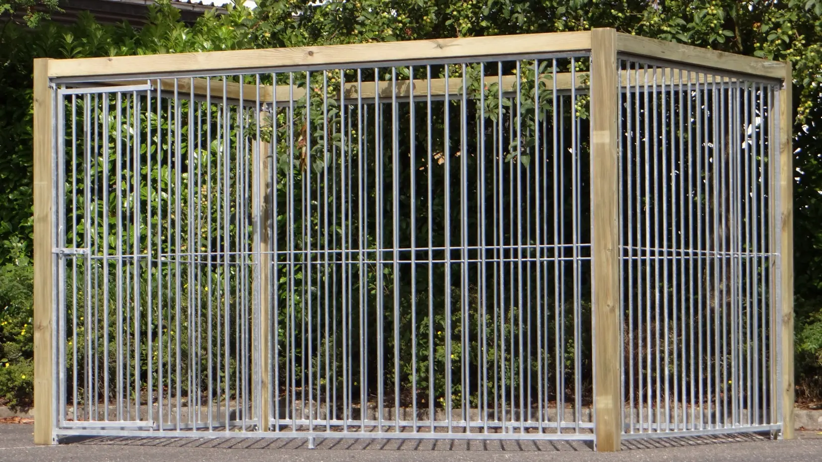 - Die Holzpfosten des Zwingers (88x88mm) sind mit Kunststofffüßen ausgestattet