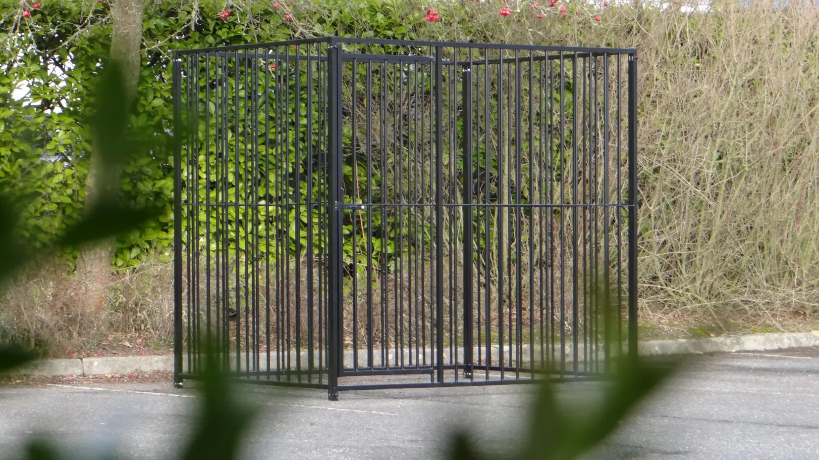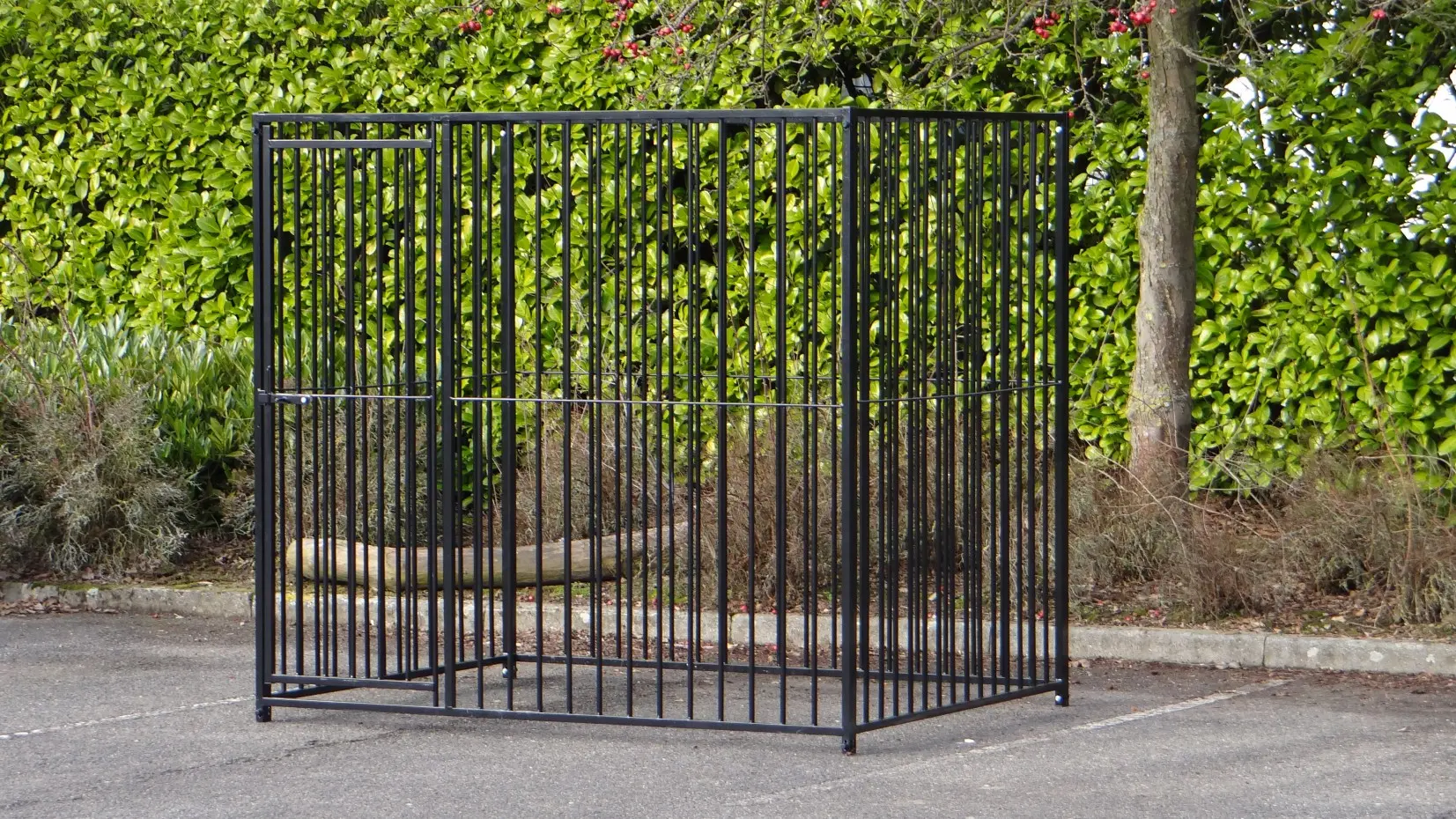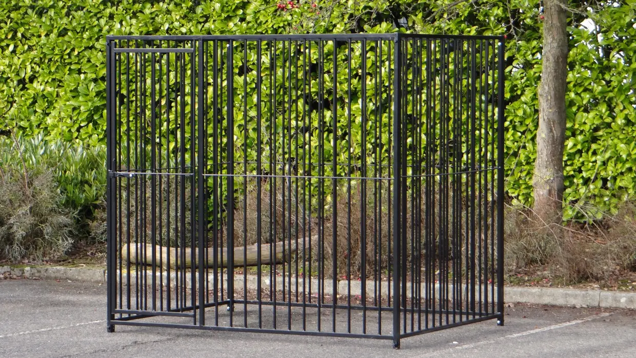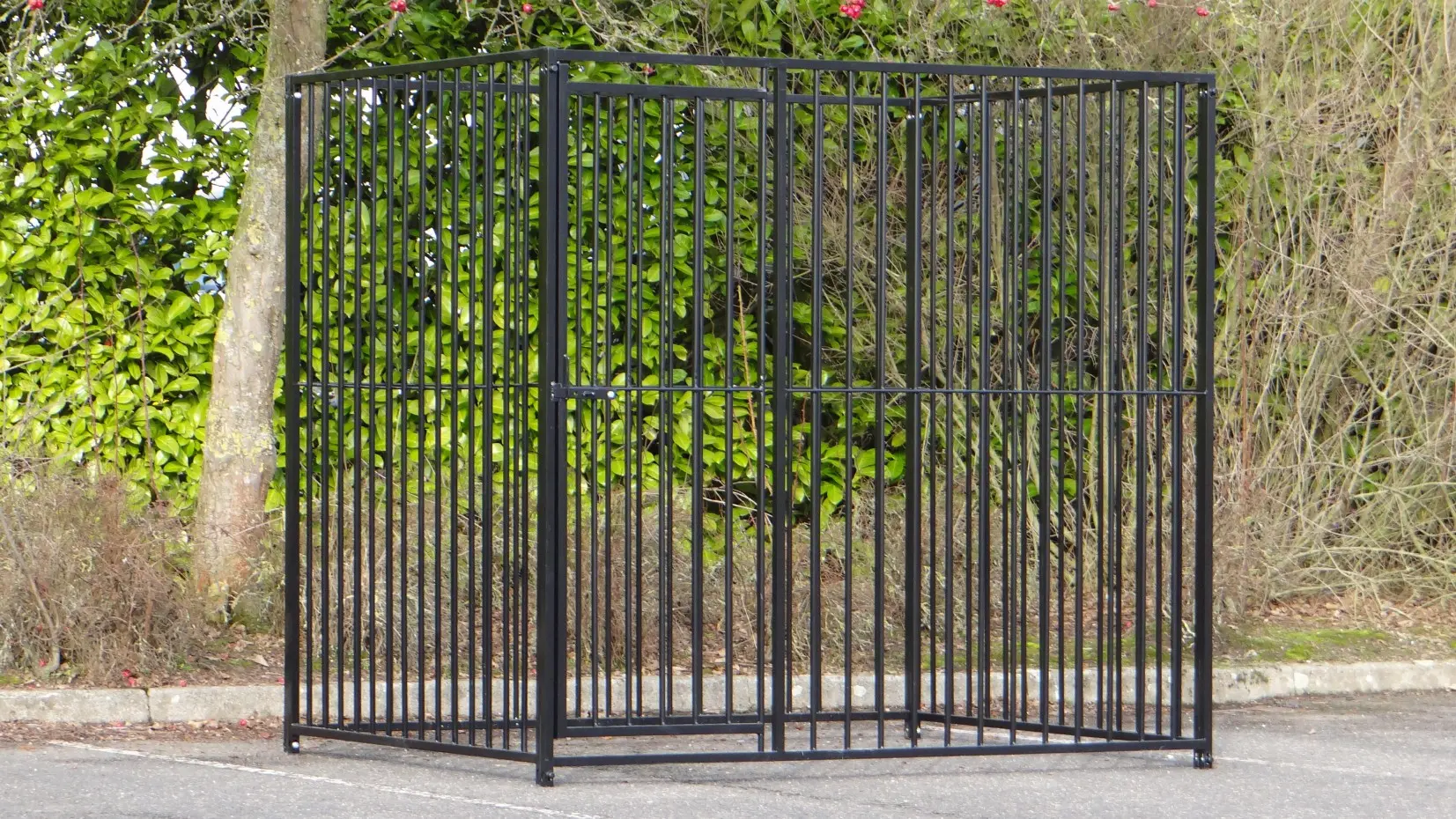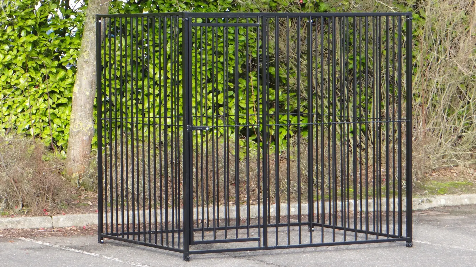 Schwarze pulverbeschichtete Hundezwinger von 2x1,5m. Diese Zwinger besteht aus 2 Paneele von 1,5m und 2 Paneele von 2m, davon ein Paneele mit Türöffnung!