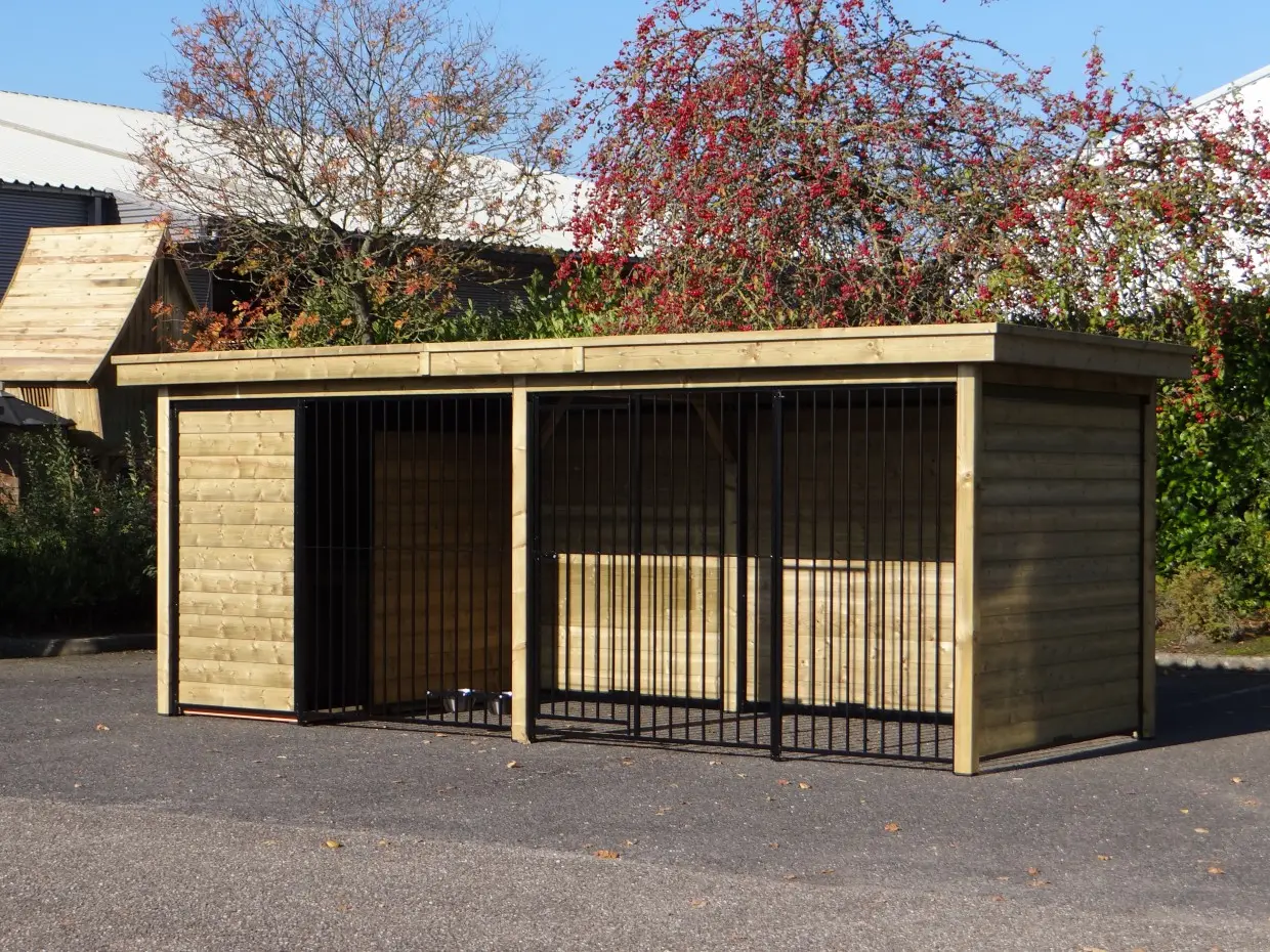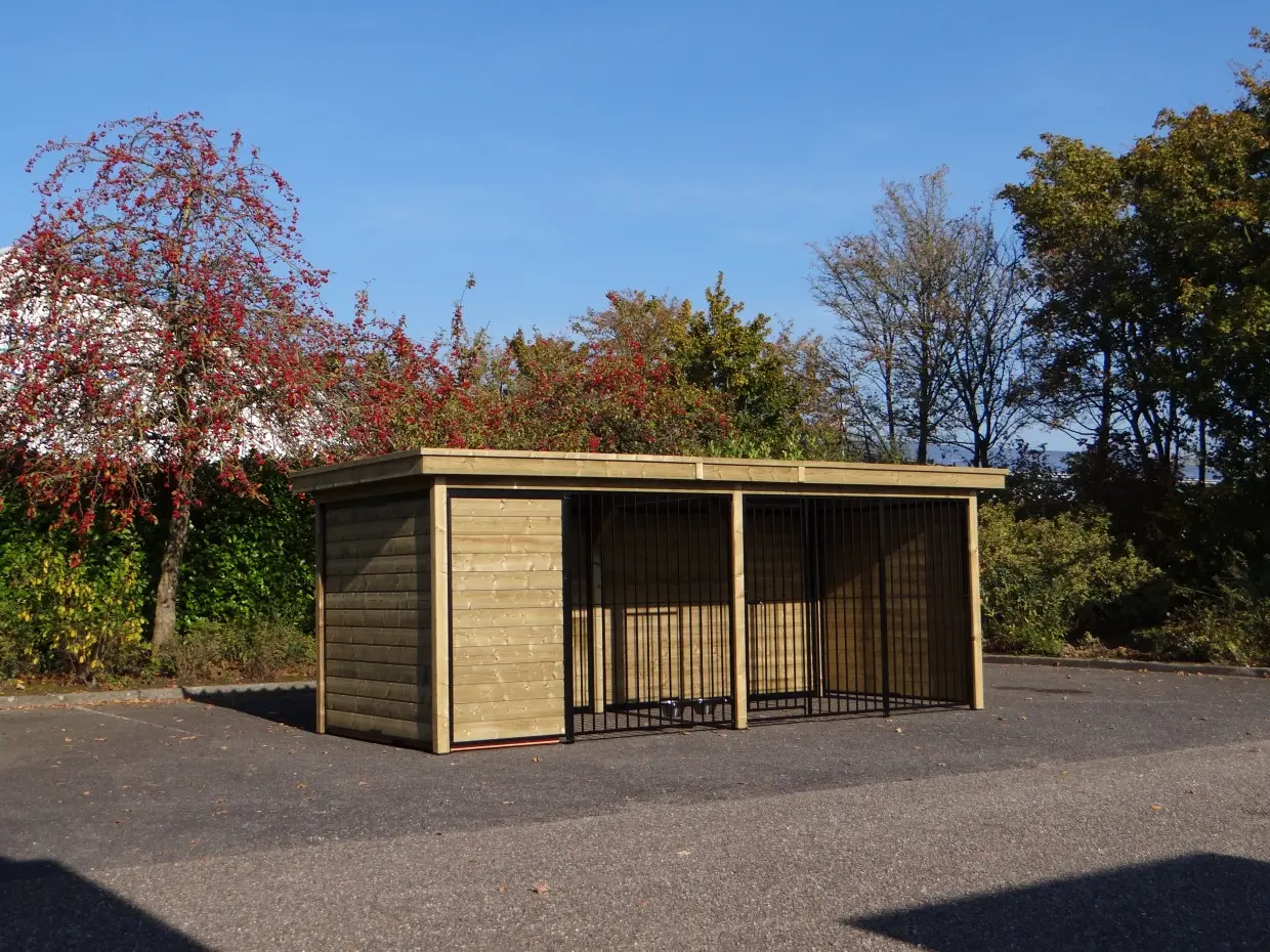 Die schwarze Hundenkennel Forz mit Holzrahmen und luxuriösem Dachsystem aus imprägniertem Fichtenholz ist eine wunderschöne Kennelanlage mit optimalem Schutz für Ihren Hund rundum. Hinter der Windschutzwand befindet sich ein isoliertes Nachthaus mit einer davorliegenden Holzterrasse. Dadurch ist die Kennel ein schönes und komplettes Set für alle Jahreszeiten. Der massive Rahmen aus Fichtenholz und das hochwertig verarbeitete Dach sorgen gemeinsam für eine fantastische Optik und machen die Kennel perfekt.