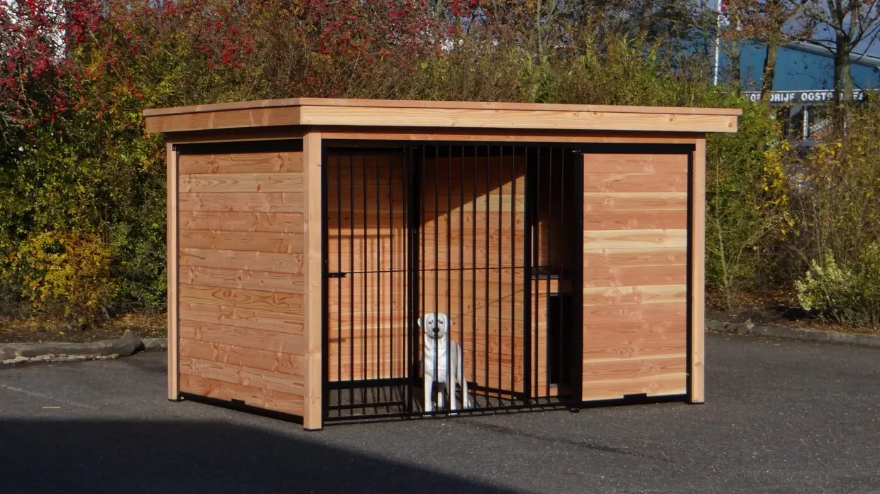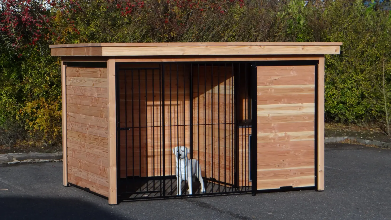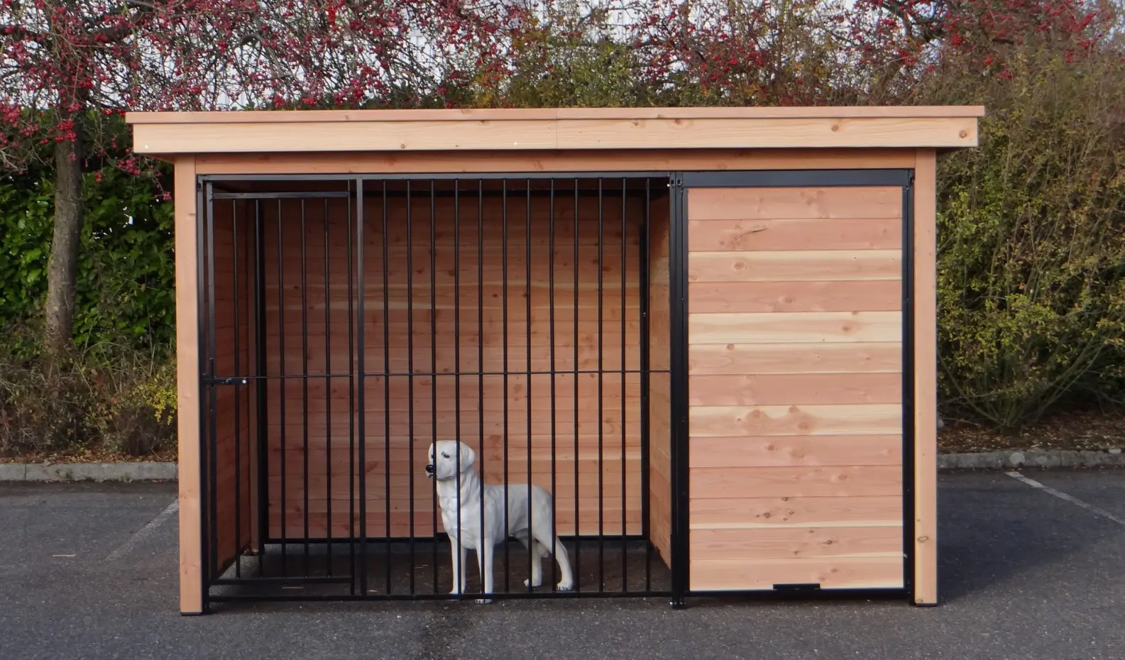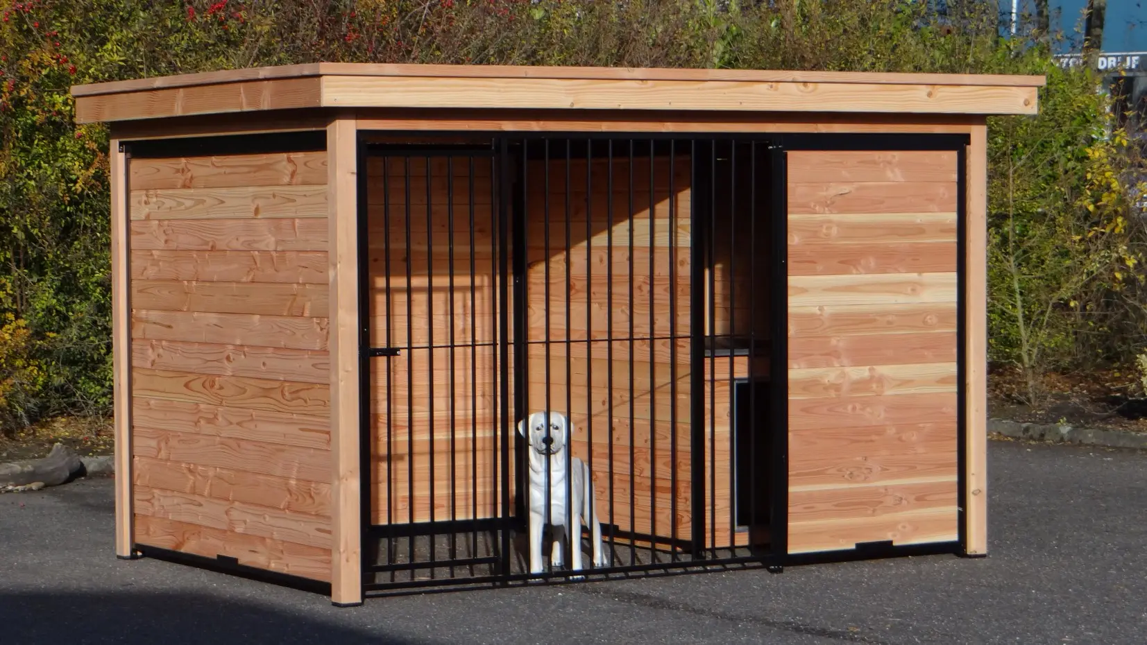 Die schwarze Hundenkennel Forz mit Holzrahmen, luxuriösem Dachsystem und Douglasienholz ist eine wunderschöne Kennelanlage mit optimalem Schutz für Ihren Hund rundum. Hinter der Windschutzwand befindet sich ein isoliertes Nachthaus mit einer davorliegenden Holzterrasse. Dadurch ist die Kennel ein schönes und komplettes Set für alle Jahreszeiten. Der massive Rahmen aus Douglasienholz und das hochwertig verarbeitete Dach sorgen gemeinsam für eine fantastische Optik und machen die Kennel perfekt.