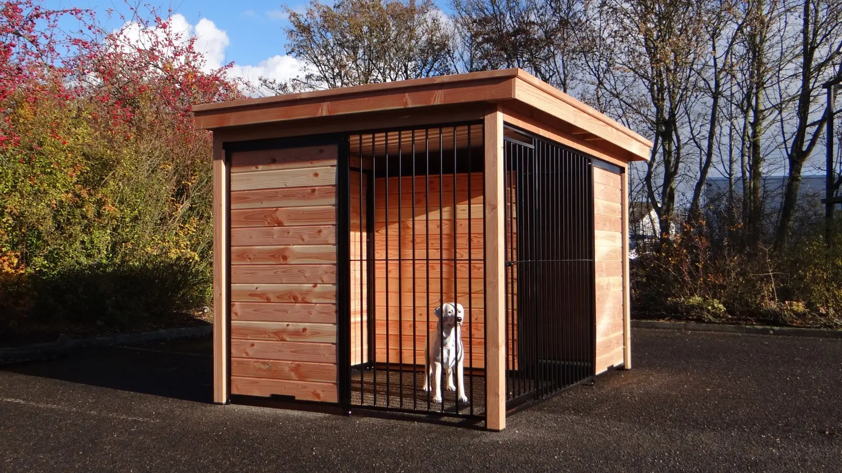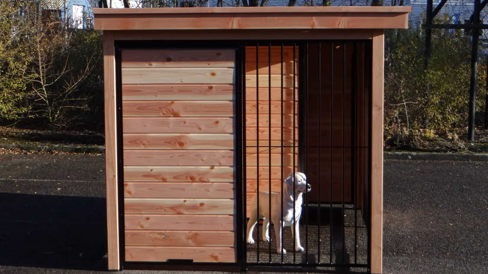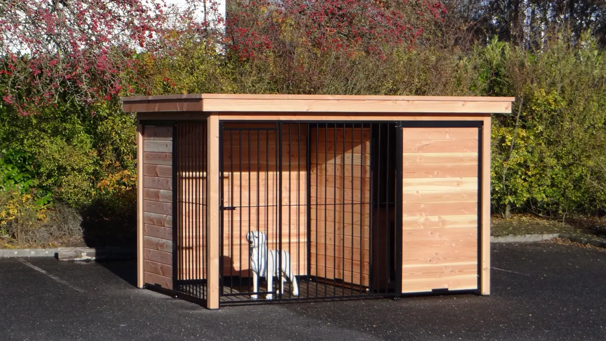 Der Hundezwinger ist ein schöne Zwinger für Ihre Hund. Der halb geöffnete Seite bietet Schutz vor Zugluft und Aussicht. Der Douglasienholz Rahmen, schwarze Gitterpaneele und Dach Luxe sorgen für eine schönes Aussehen. Der Raum hinter der Windfang muss zum Beispiel mit einem Schlafraum oder einer Bodenplatte gefüllt werden.