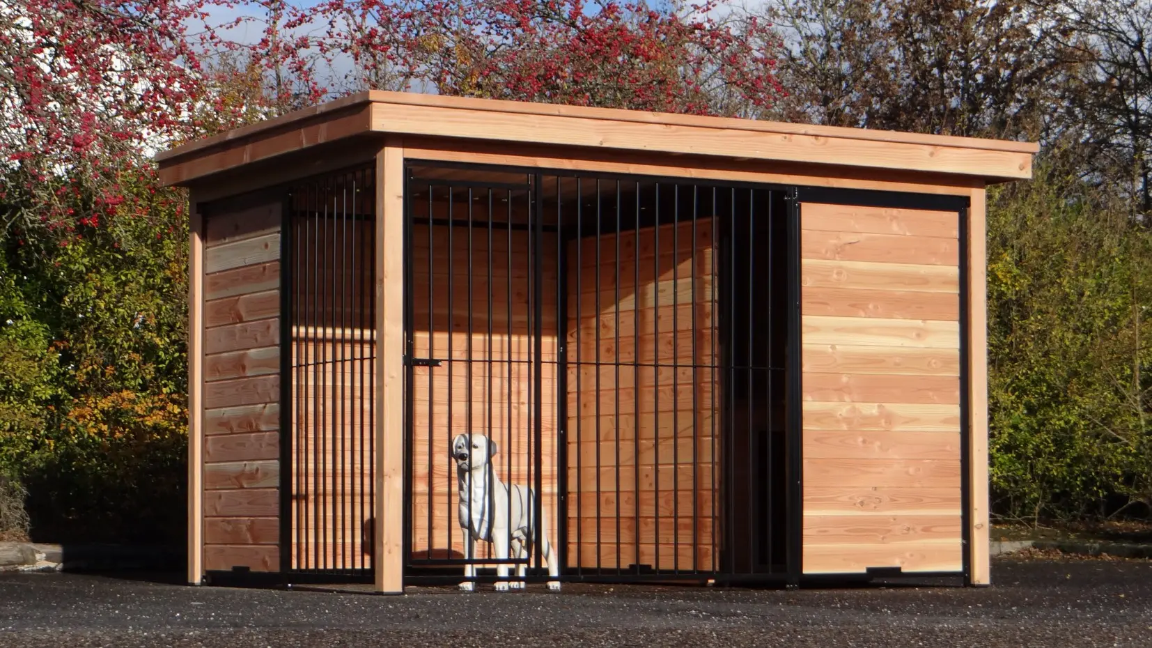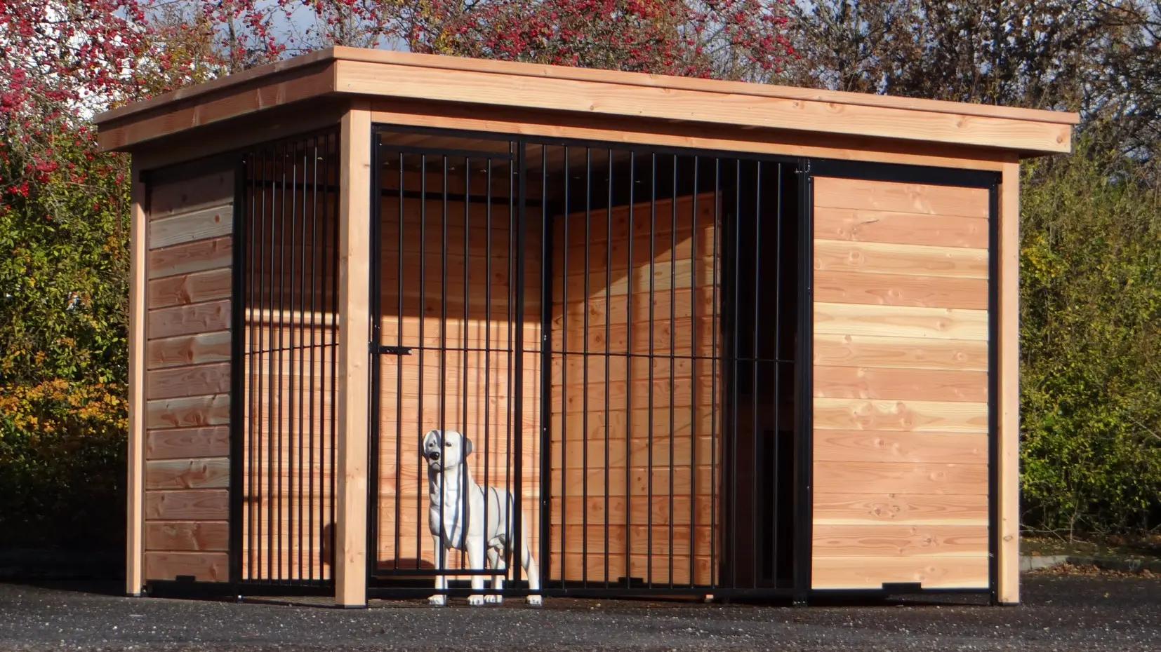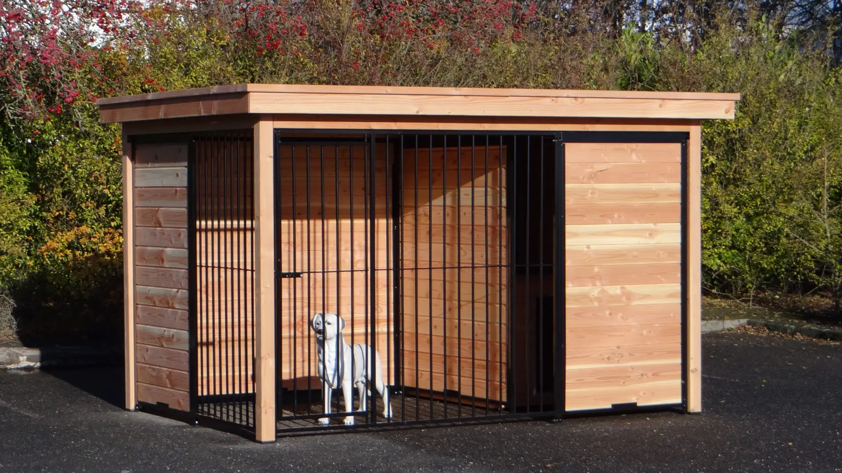 Der Hundezwinger ist ein schöne Zwinger für Ihre Hund. Der halb geöffnete Seite bietet Schutz vor Zugluft und Aussicht. Der Douglasienholz Rahmen, schwarze Gitterpaneele und Dach Luxe sorgen für eine schönes Aussehen. Der Raum hinter der Windfang muss zum Beispiel mit einem Schlafraum oder einer Bodenplatte gefüllt werden.