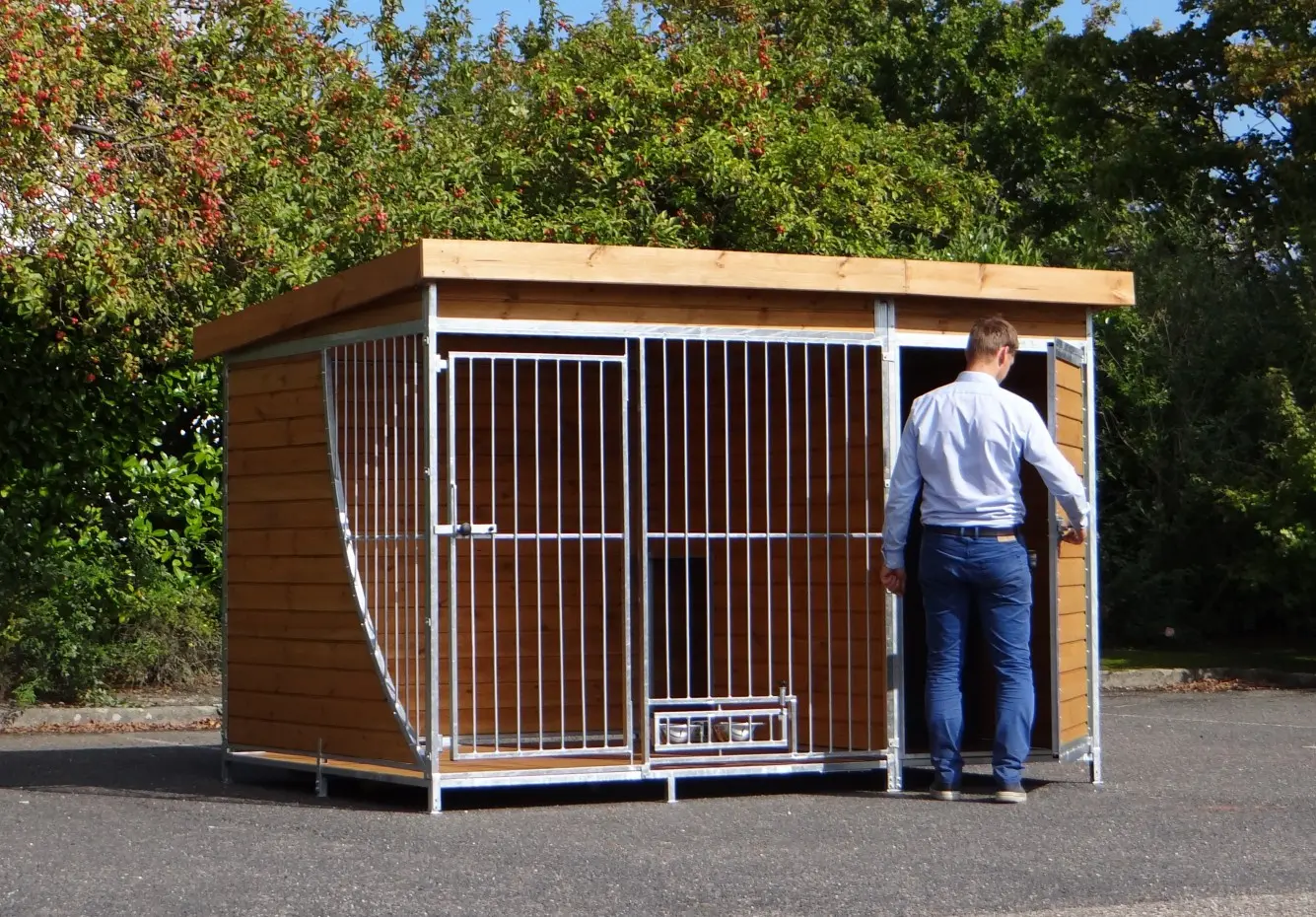 Sehr praktisch ist auch das diesen Zwinger eine Tür im Auslauf und im Schutzhaus hat. Bestimmt bei der Reinigung! Eine drehbare Futterstelle ist natürlich auch ganz praktisch. Zusammengefasst ist dieser Zwinger sehr komplett, aus schwerer Qualität und überdacht! Wir schicken diesen Zwinger ohne zusätzliche Lieferungskosten in ganz Deutschland oder Österreich!