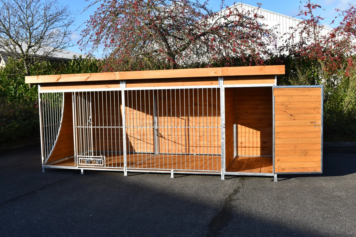 Sehr praktisch ist auch das diesen Zwinger eine Tür im Auslauf und im Schutzhaus hat. Bestimmt bei der Reinigung! Eine drehbare Futterstelle ist natürlich auch ganz praktisch. Zusammengefasst ist dieser Zwinger sehr komplett, aus schwerer Qualität und überdacht! Wir schicken diesen Zwinger ohne zusätzliche Lieferungskosten in ganz Deutschland oder Österreich!