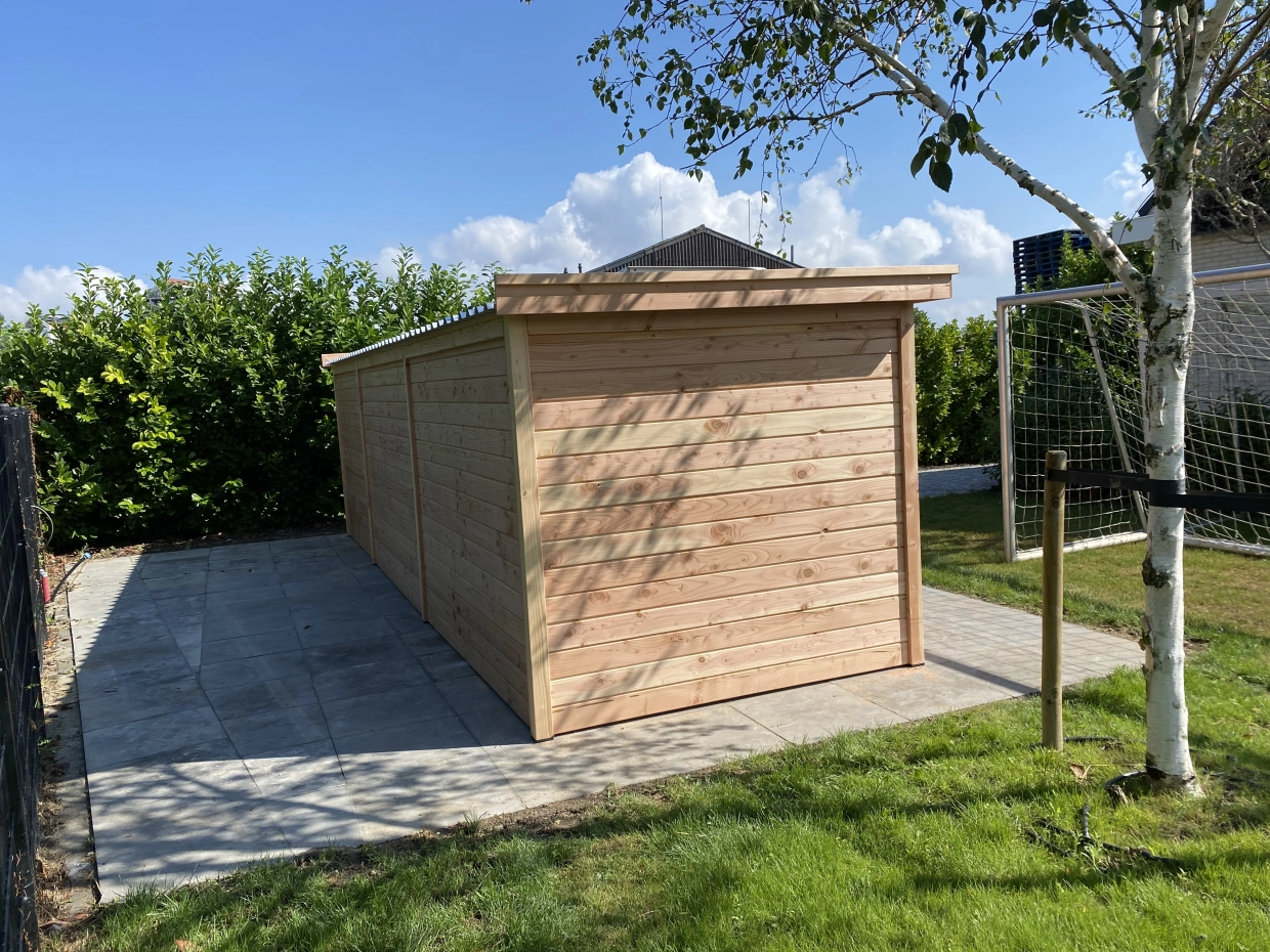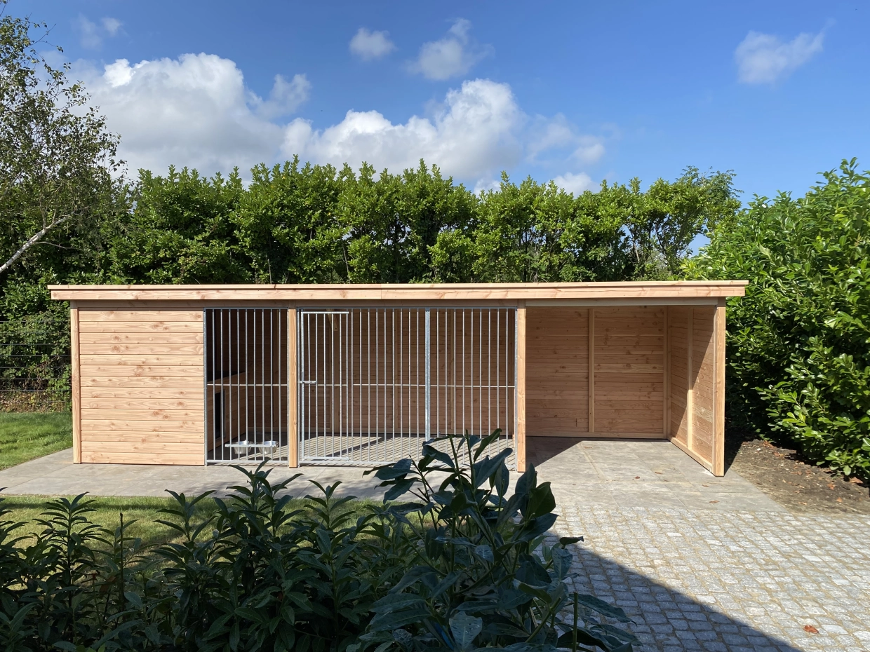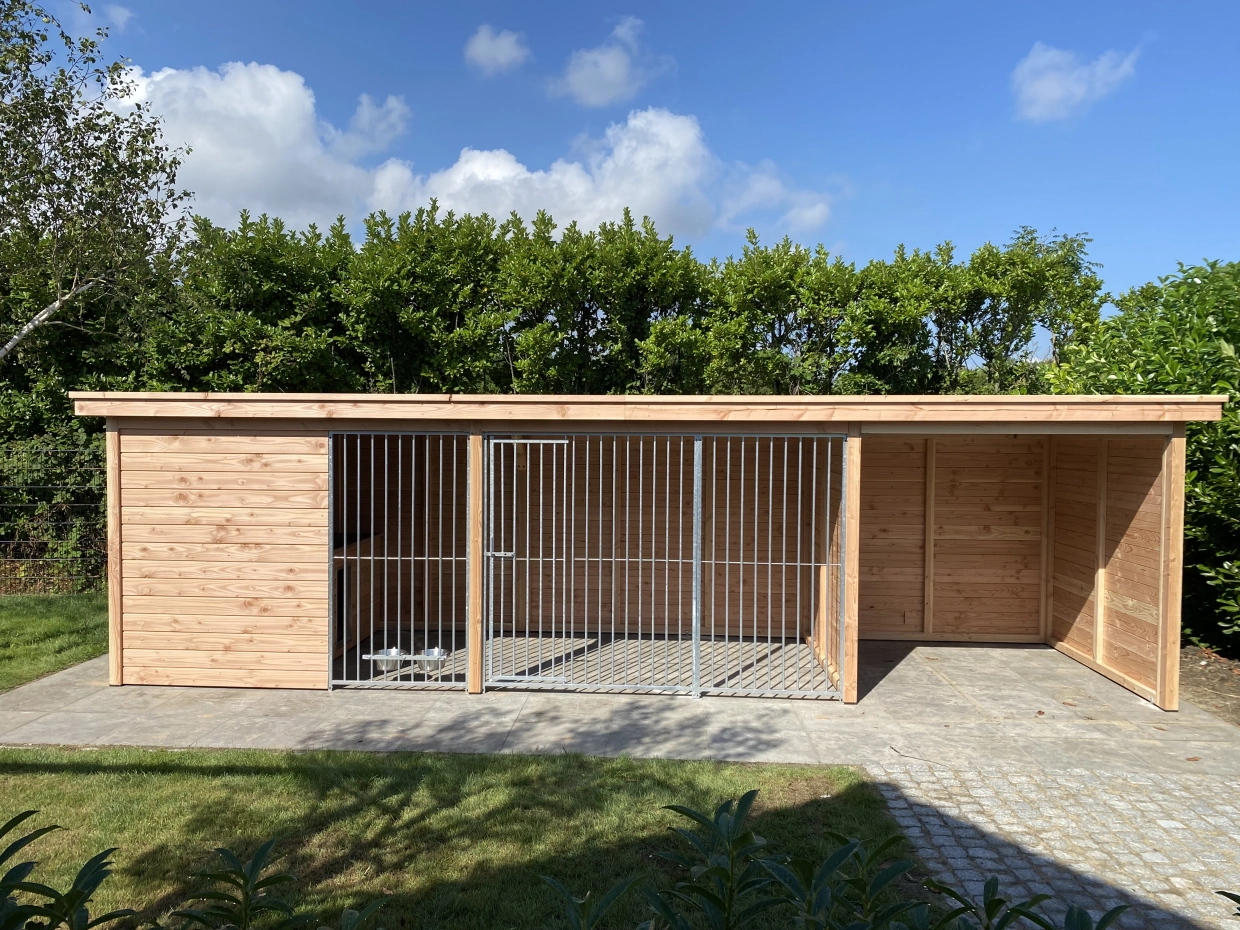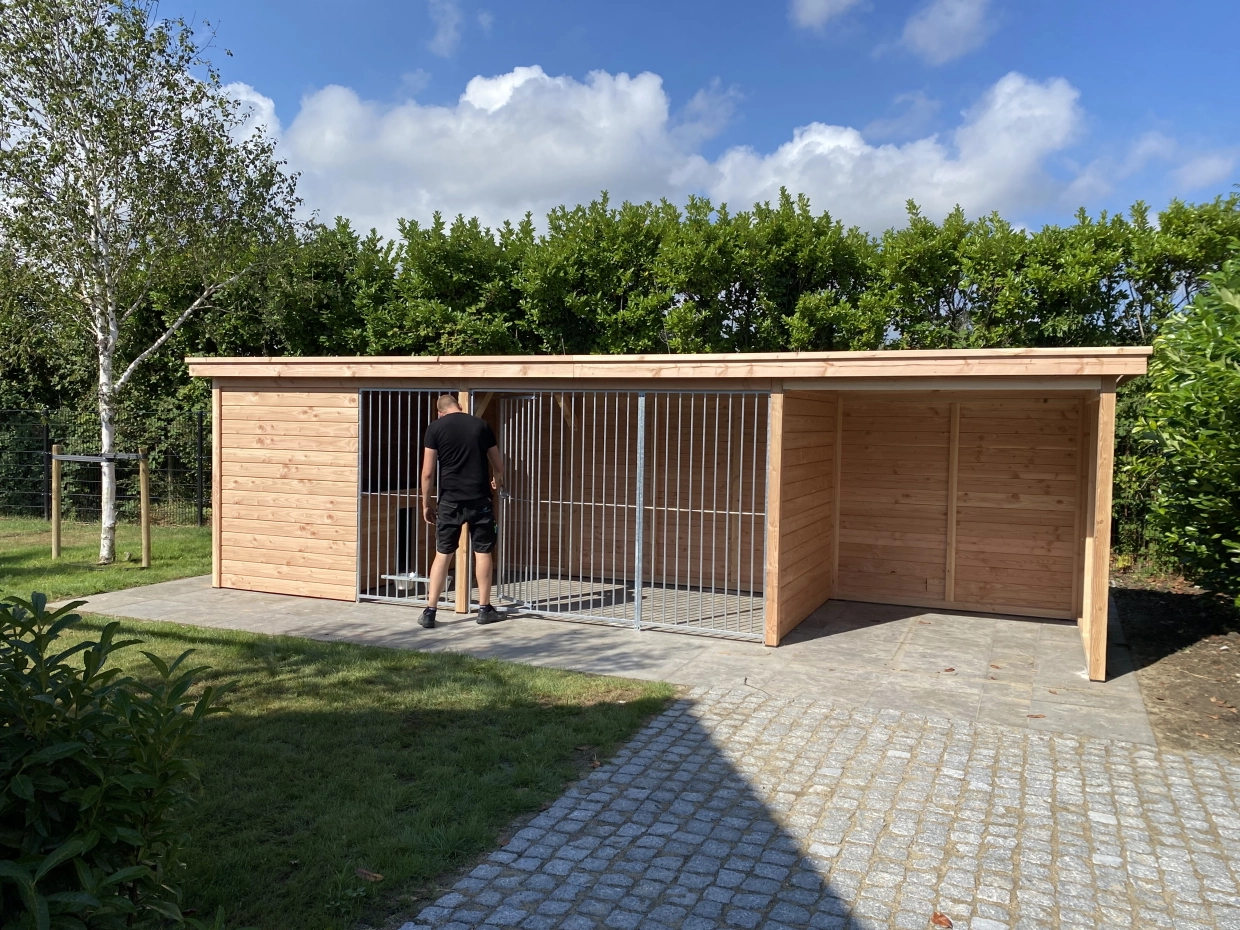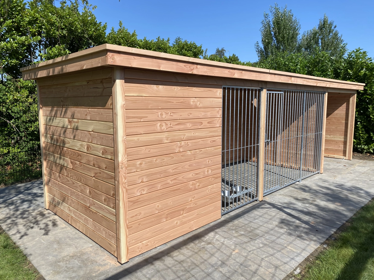 Diese große Hundezwinger hat ein isoliertes Schlafraum. Auch hat der Zwinger ein Überdachung. Der Zwinger ist herstellt aus Douglasienholz, wodurch es ein lange Lebensdauer hat. Ohne Behandlung wird das Holz schnell vergrauen. Sie können es mit Douglasöl behandlen, um die Farbe langer zu erhalten.