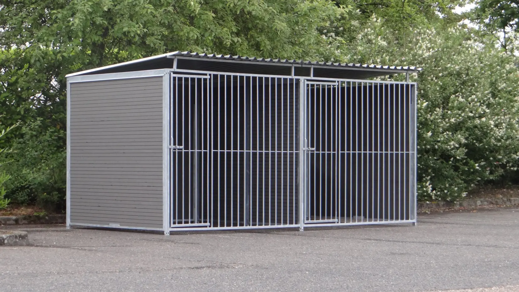 Der stabiler doppeler Hundezwinger von 4x2 m. ist versehen mit einem Dach, geschlossene WPC Seiten und Türe für eine optimale Zuganglichkeit. Der Zwinger ist normalerweise gleich aus Stock zu liefern.