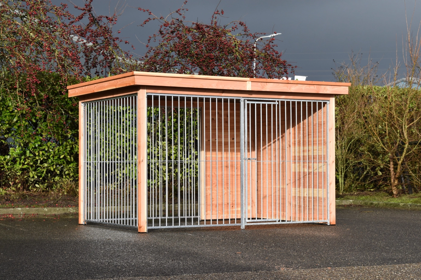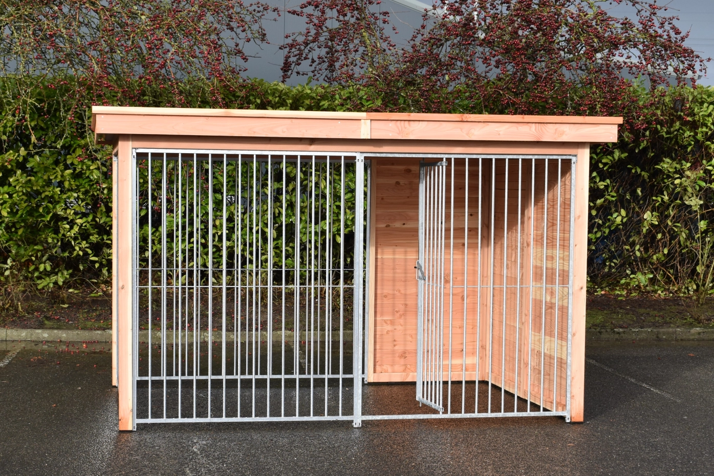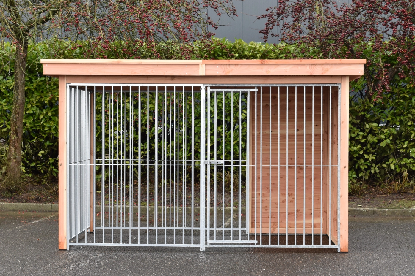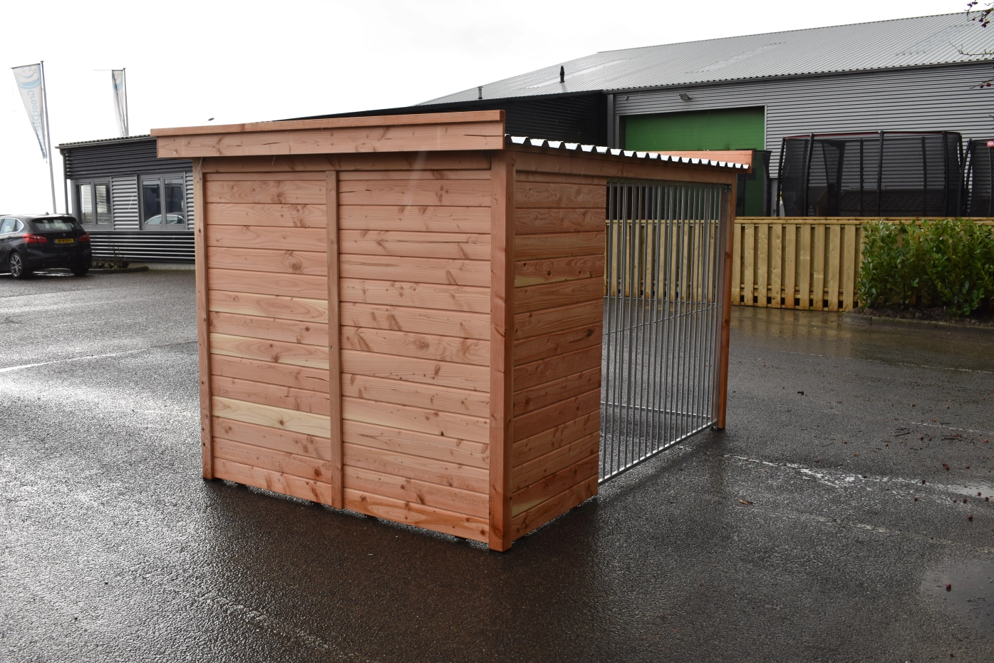 Schöne Hundezwinger Modul FERM hat ein Douglasien Holzrahmen und ist ausgestattet mit galvanisierte Zwingerpaneele. Ohne weitere Behandlung wird das Holz schnell vergrauen. Um die Farbe des Holzes zu erhalten, können Sie es mit Douglasöl behandeln. Auch ohne weitere Behandlung ist Douglasie sehr dauerhaft. Diese Zwinger kan angepasst werden nach Ihre eigene Wünschen.