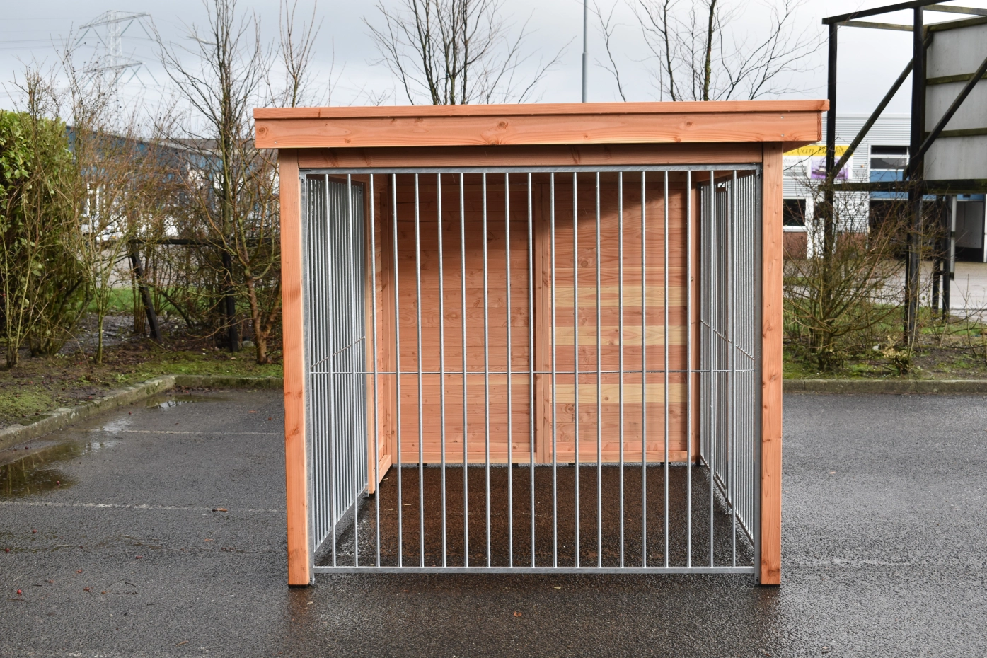 - Die Holzpfosten des Zwingers (88x88mm) sind mit Kunststofffüßen ausgestattet